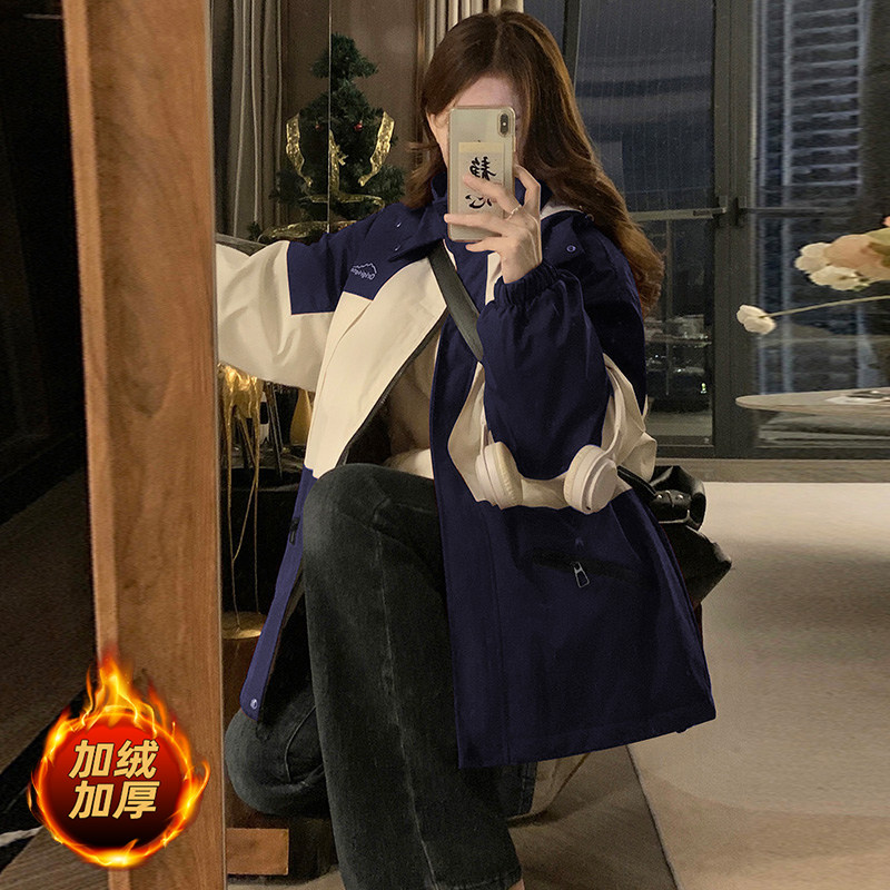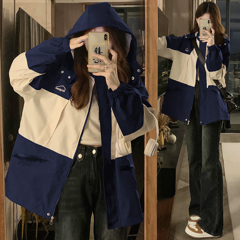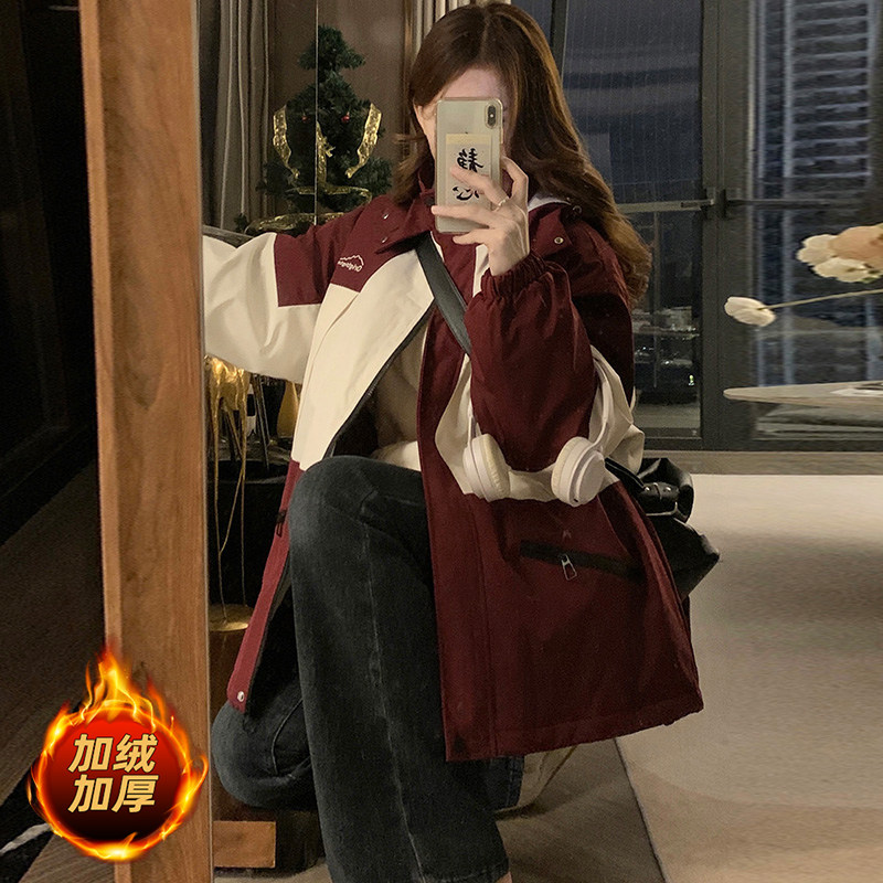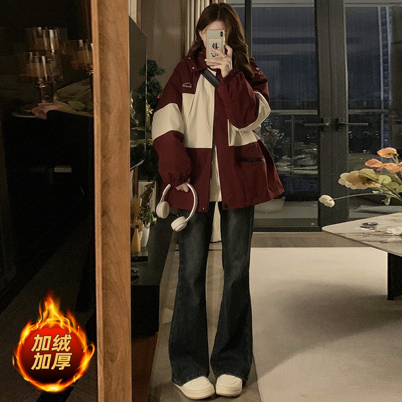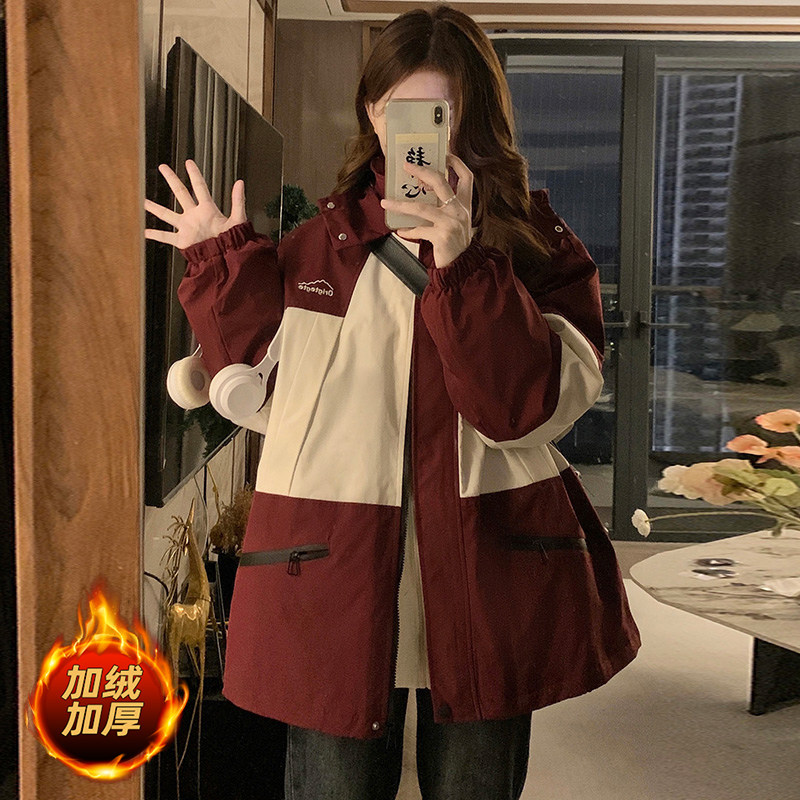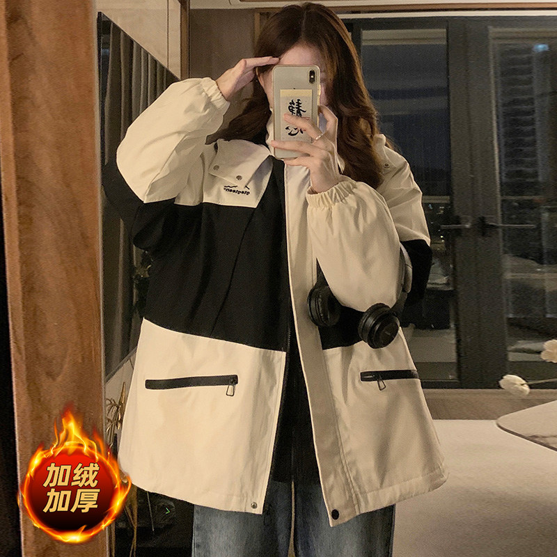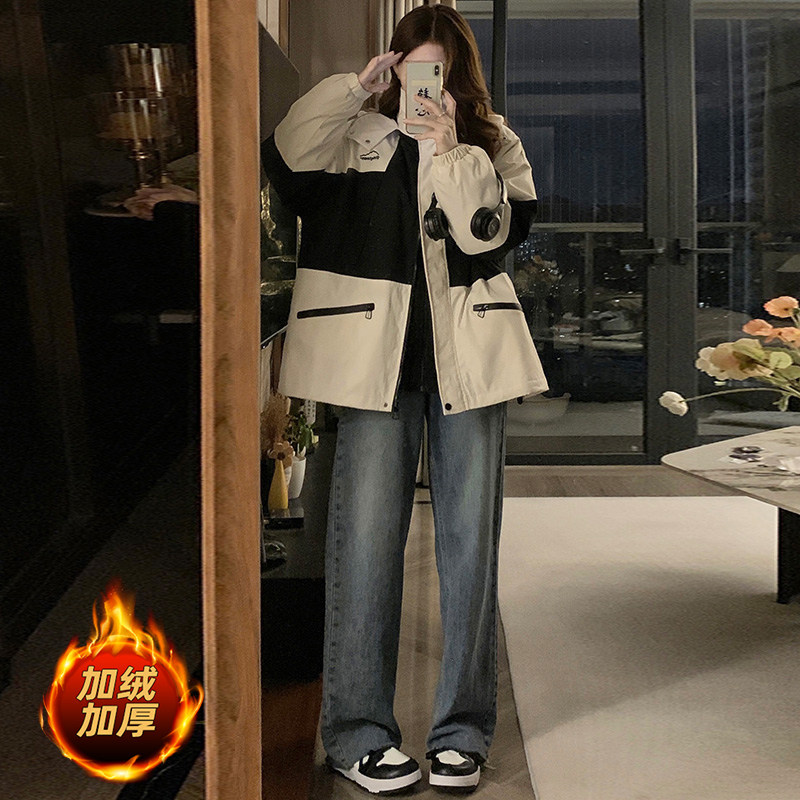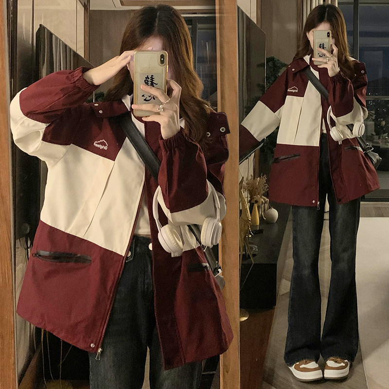 美式撞色沖鋒春秋外套男女秋季戶外登山棉服寬松連帽工裝拼色