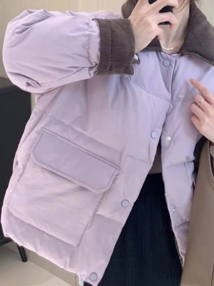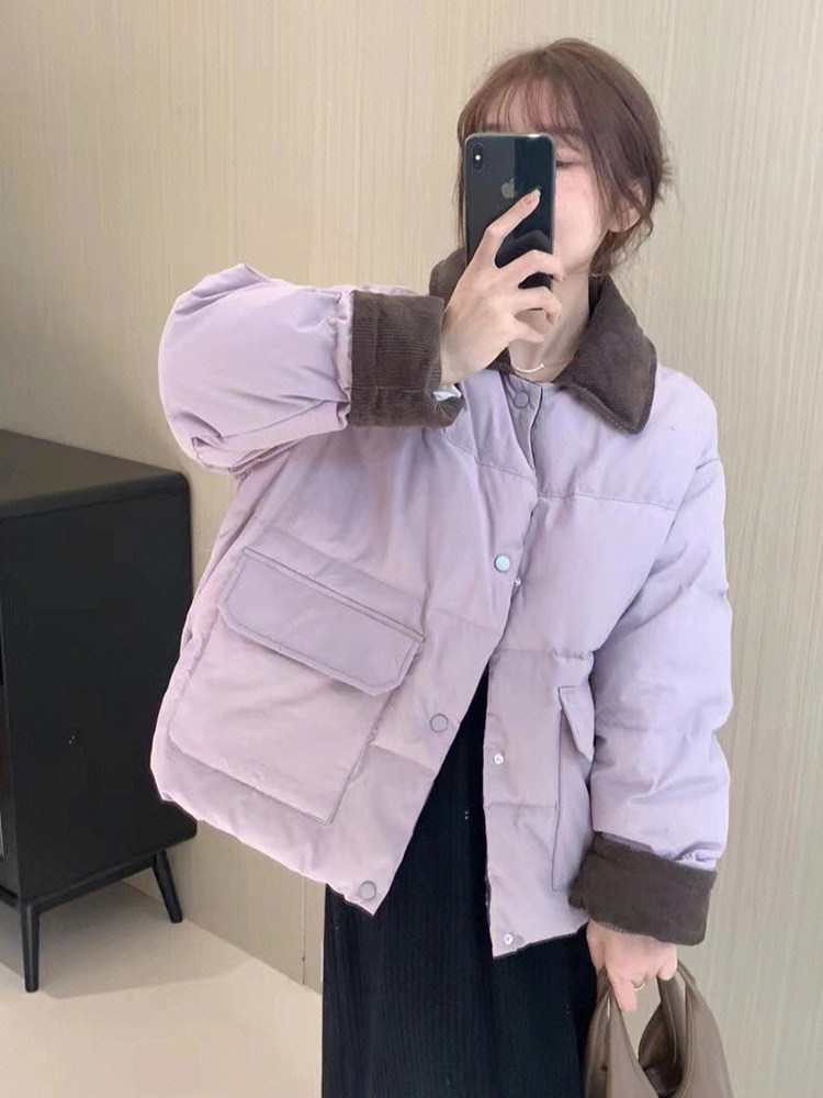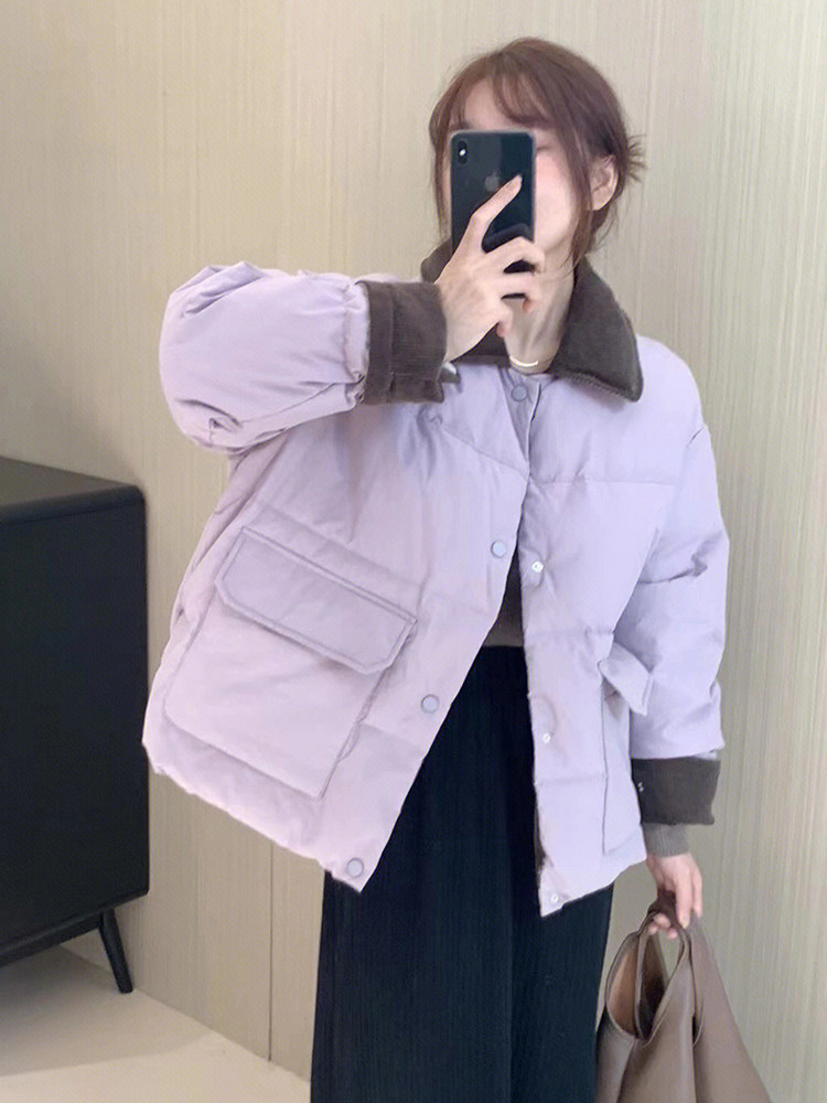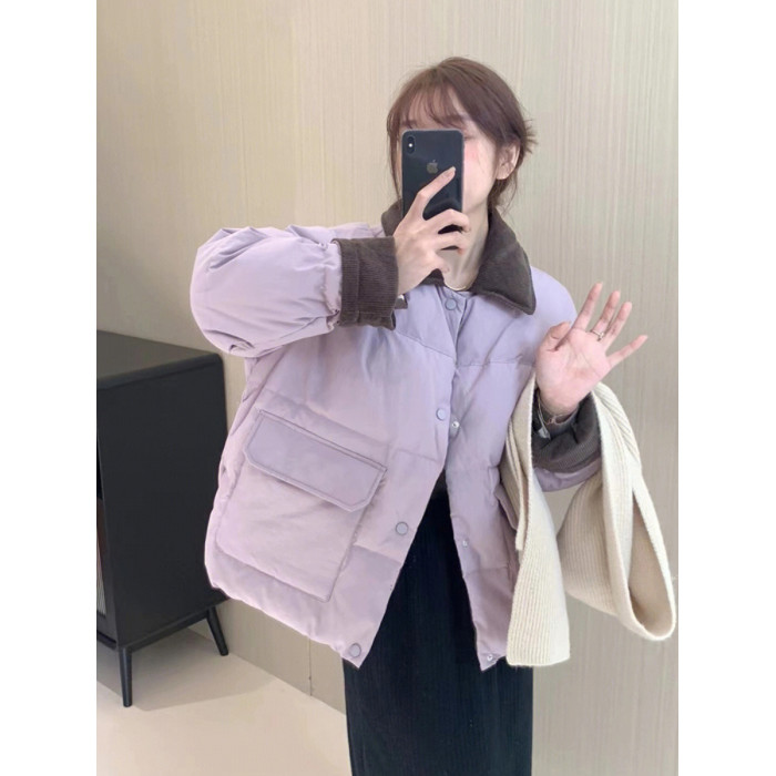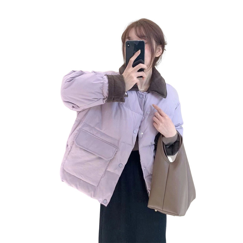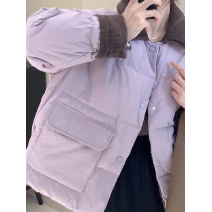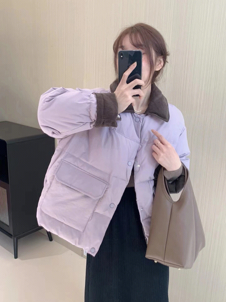 香芋紫色羽絨棉服女2025冬季新款大碼燈芯絨拼接短款棉衣加厚外套