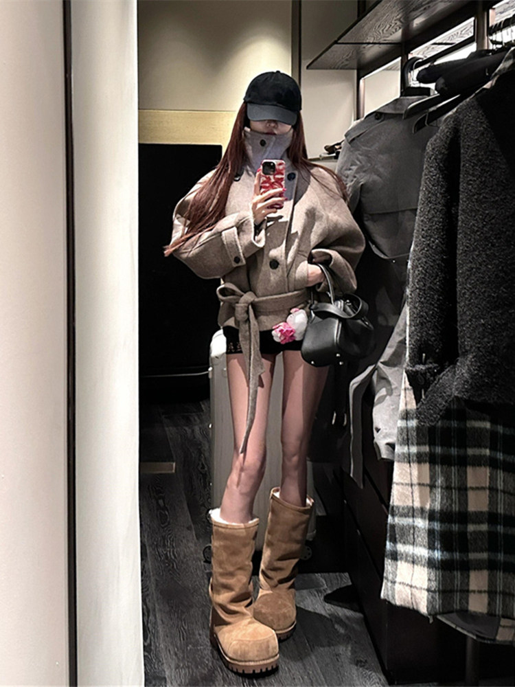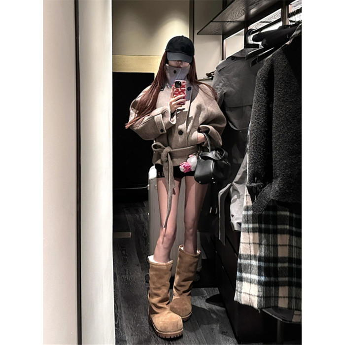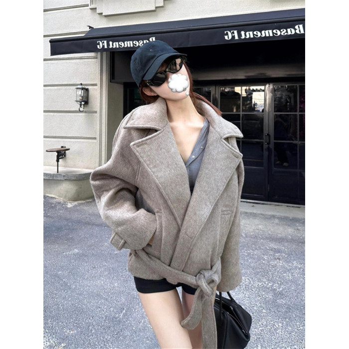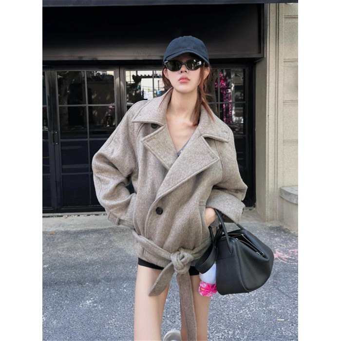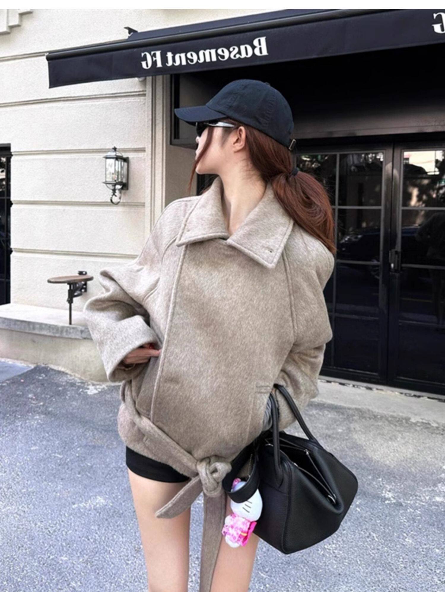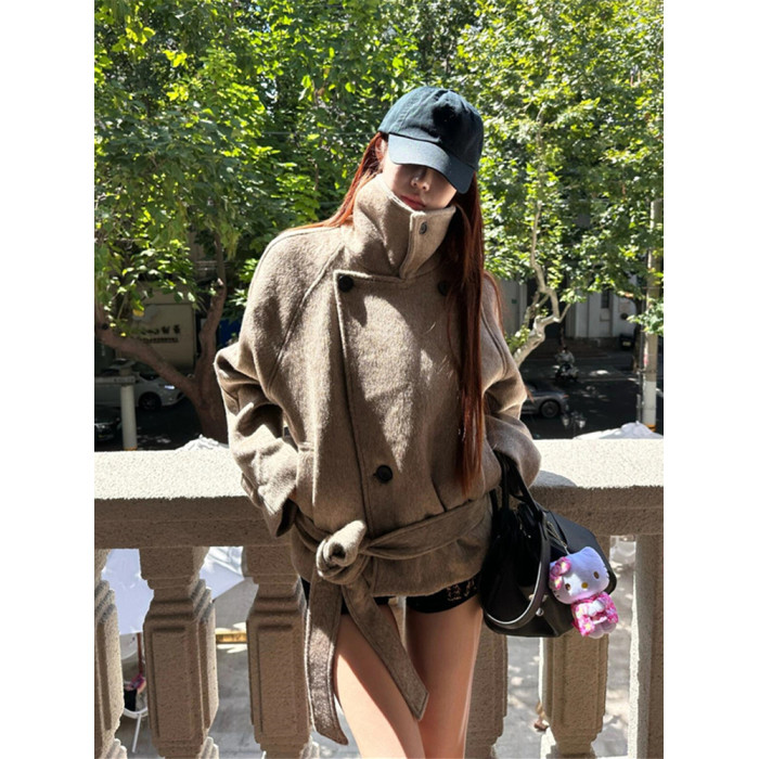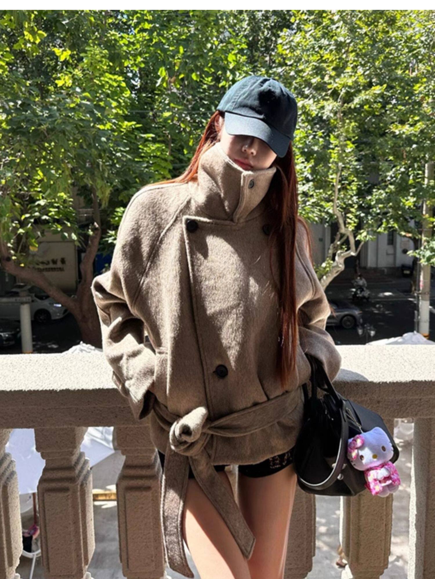 韓系復古立領腰帶毛呢外套女2025秋冬新款高級感氣質寬鬆呢子大衣