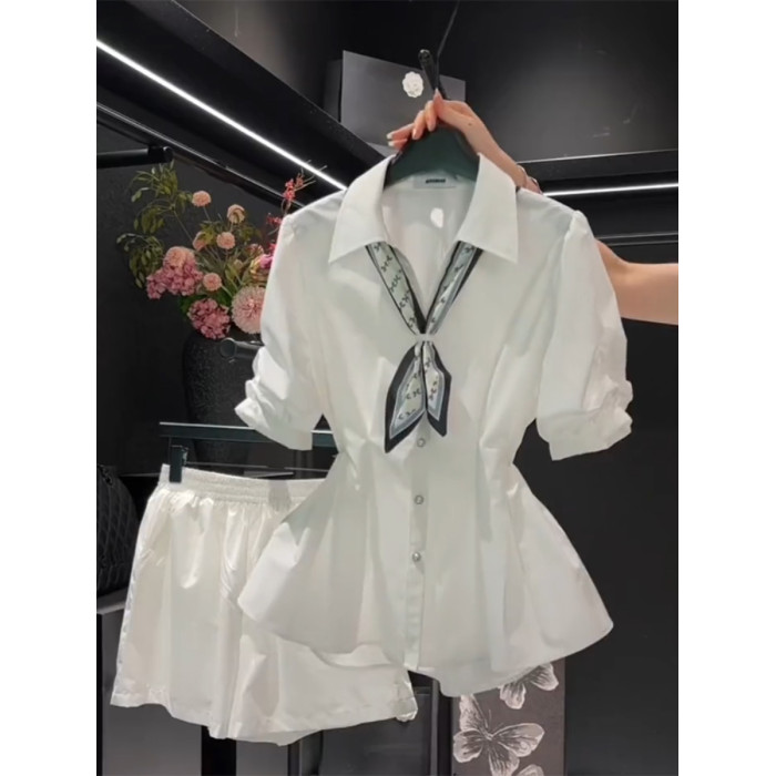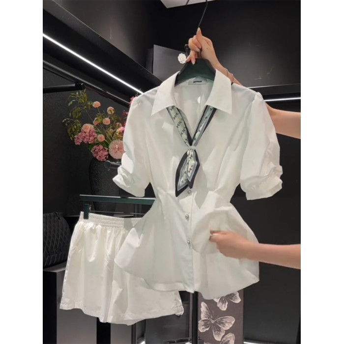 女士襯衫2026年夏季新款大碼設計感短袖V領系帶收腰顯瘦白色上衣
