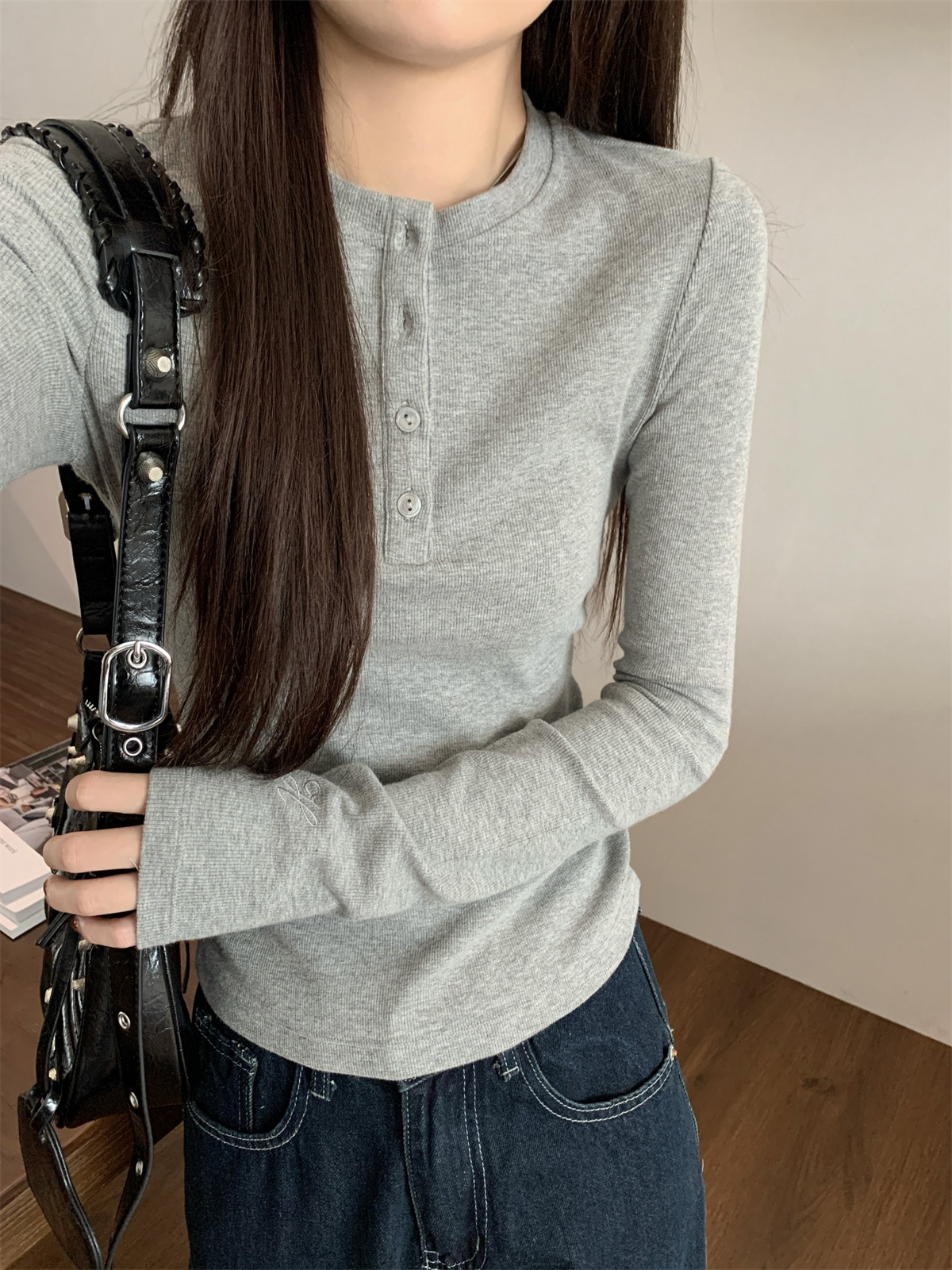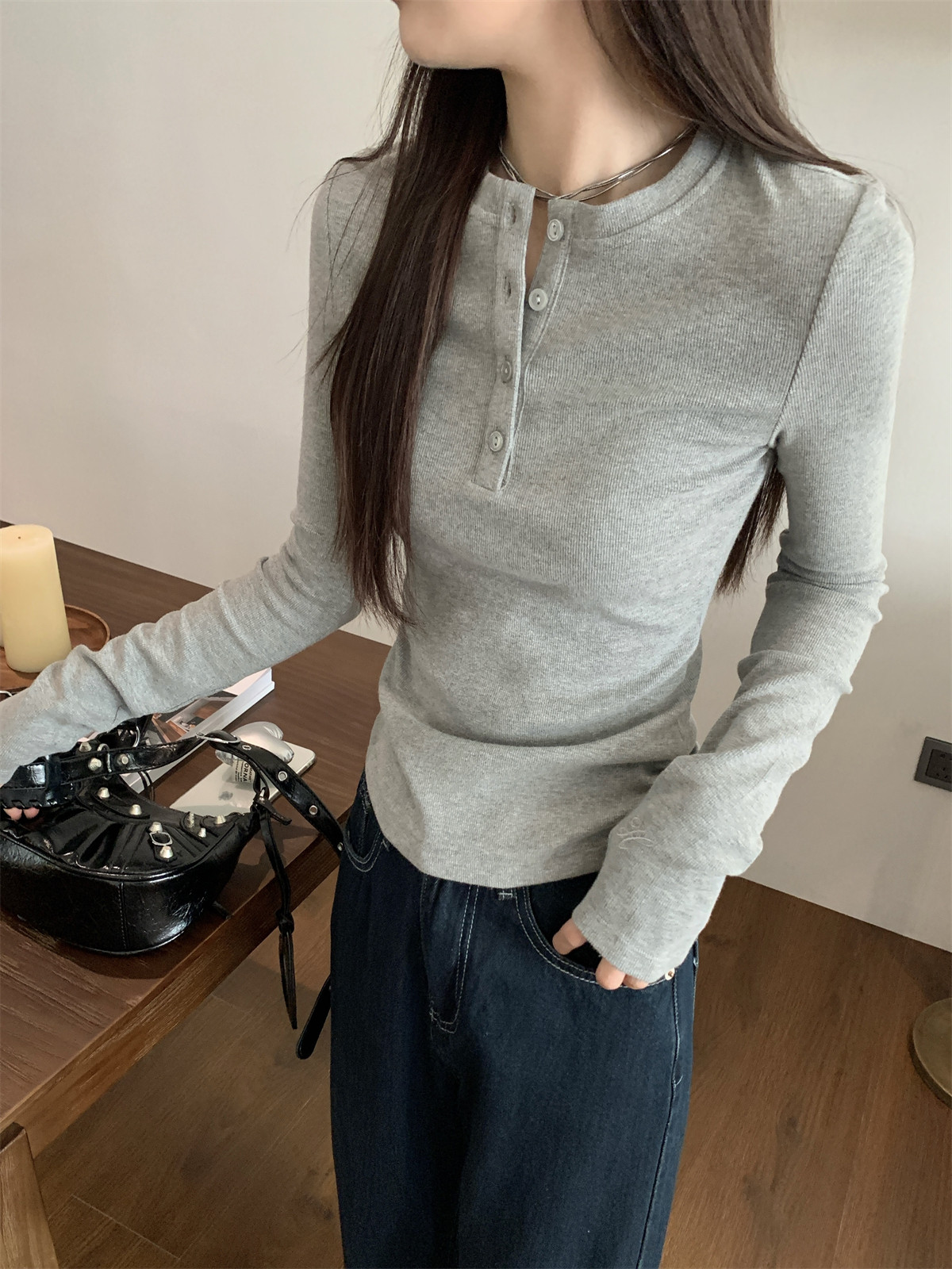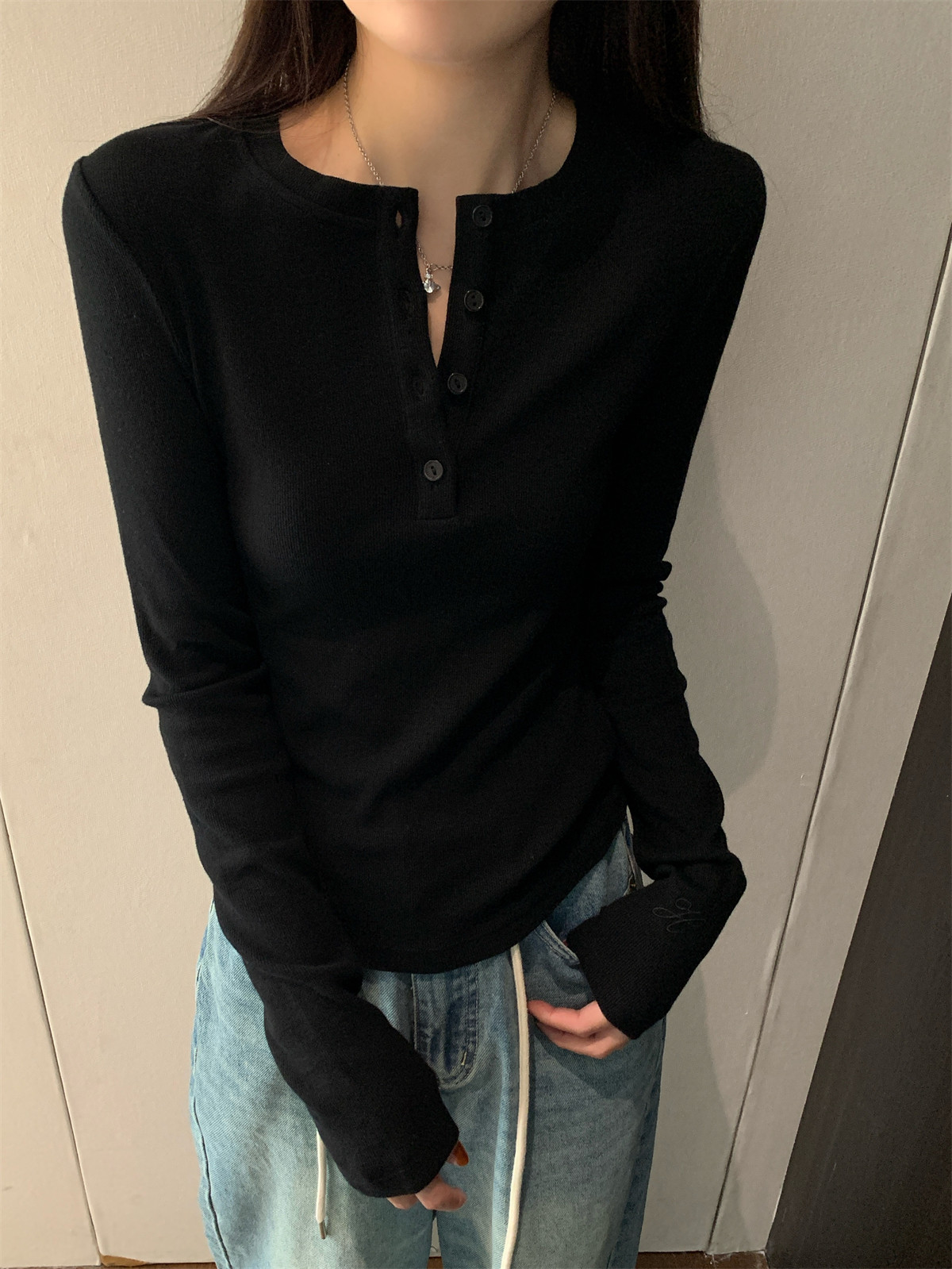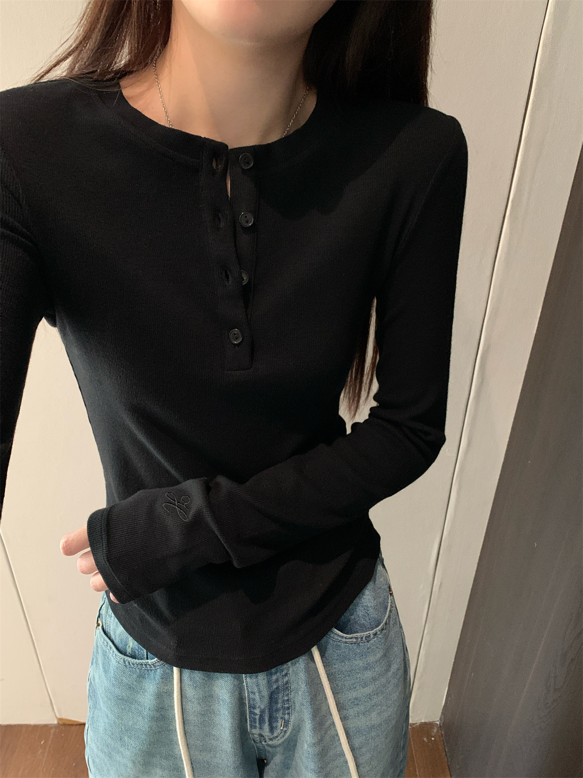 kumikumi氣質顯瘦紐釦設計感長袖T恤女裝冬季修身打底衫內搭上衣