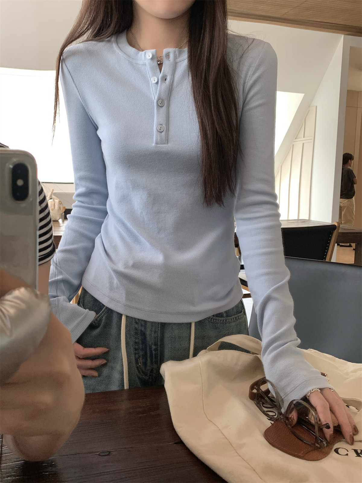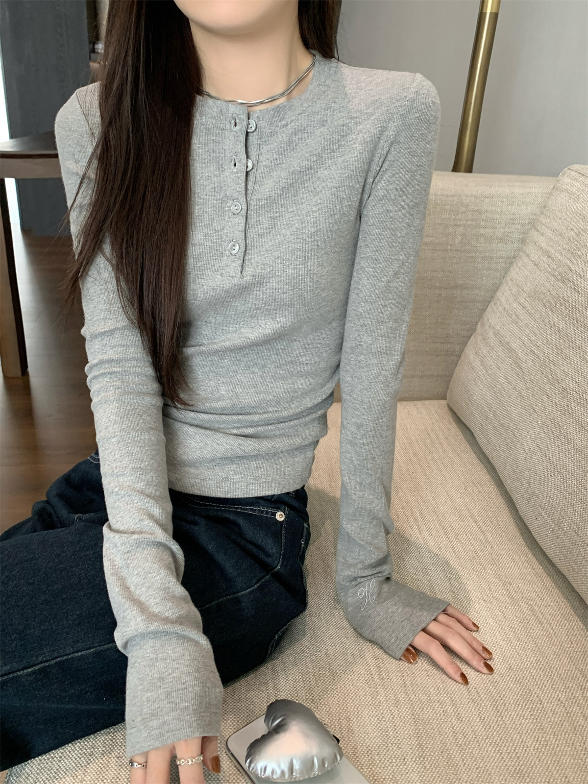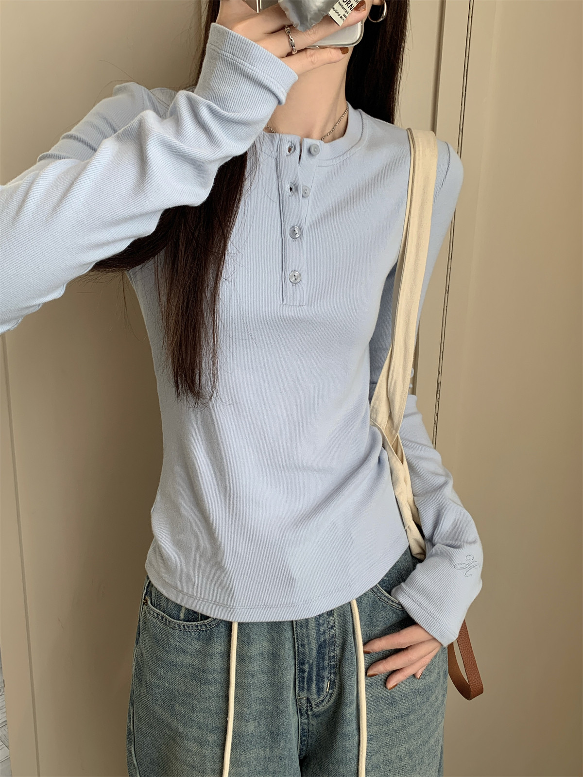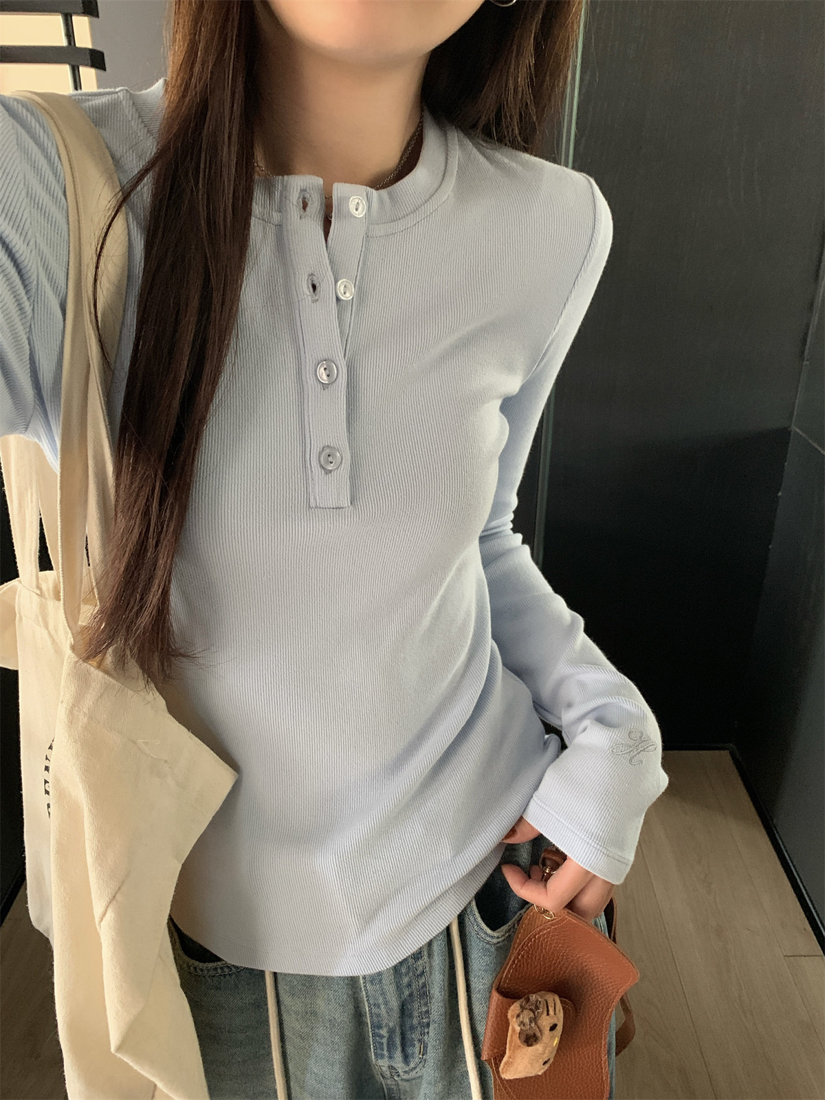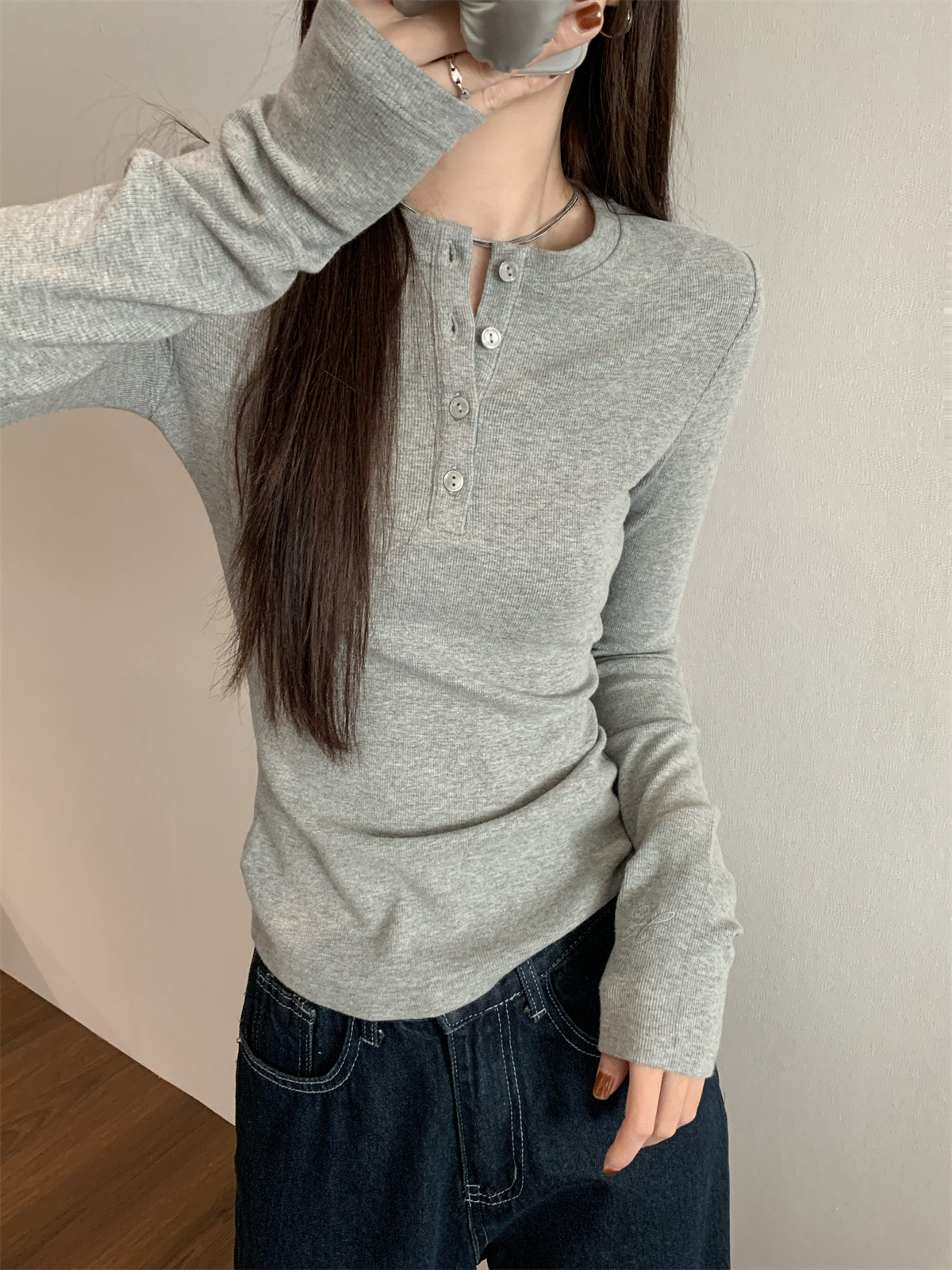 kumikumi氣質顯瘦紐釦設計感長袖T恤女裝冬季修身打底衫內搭上衣