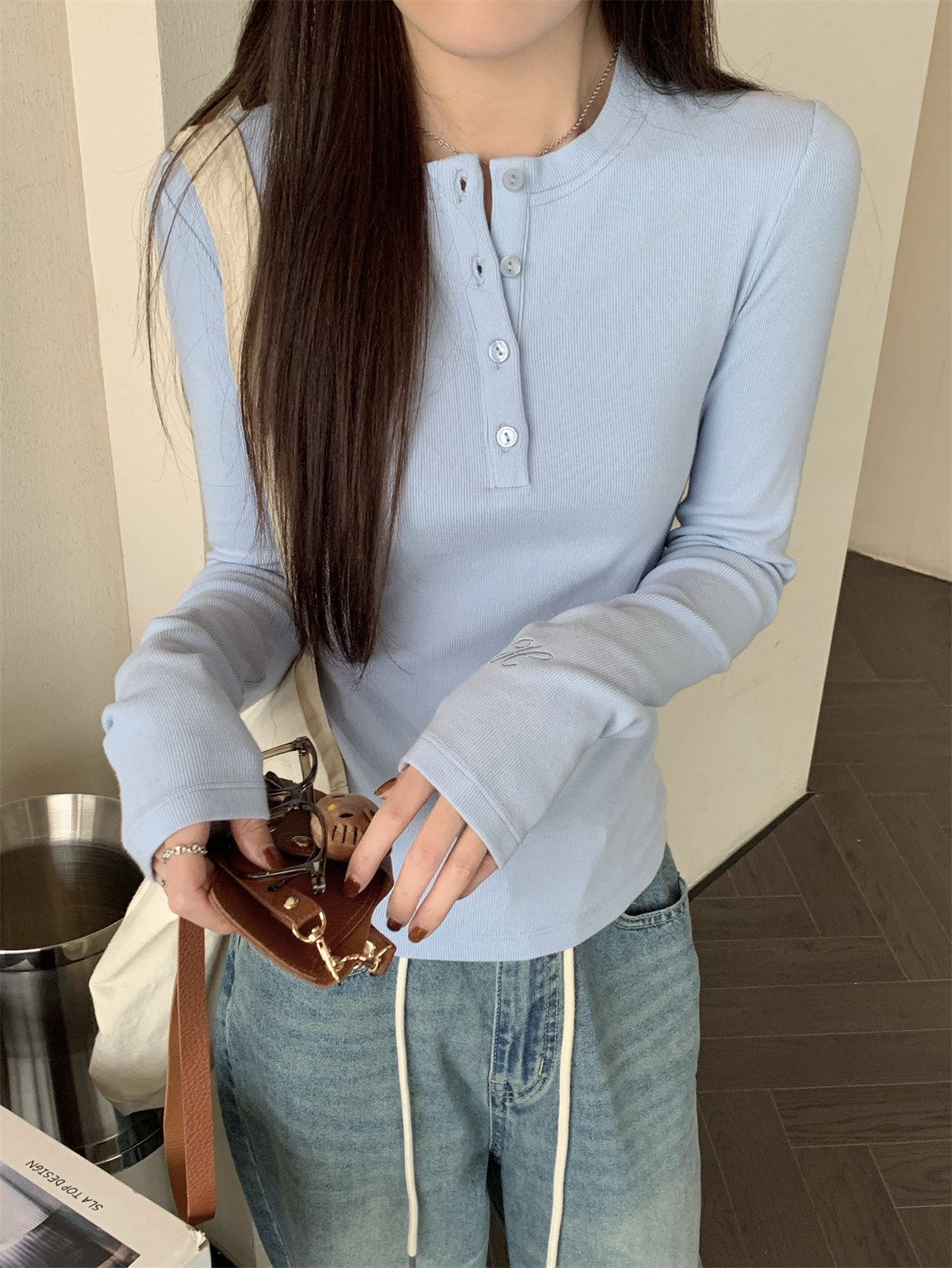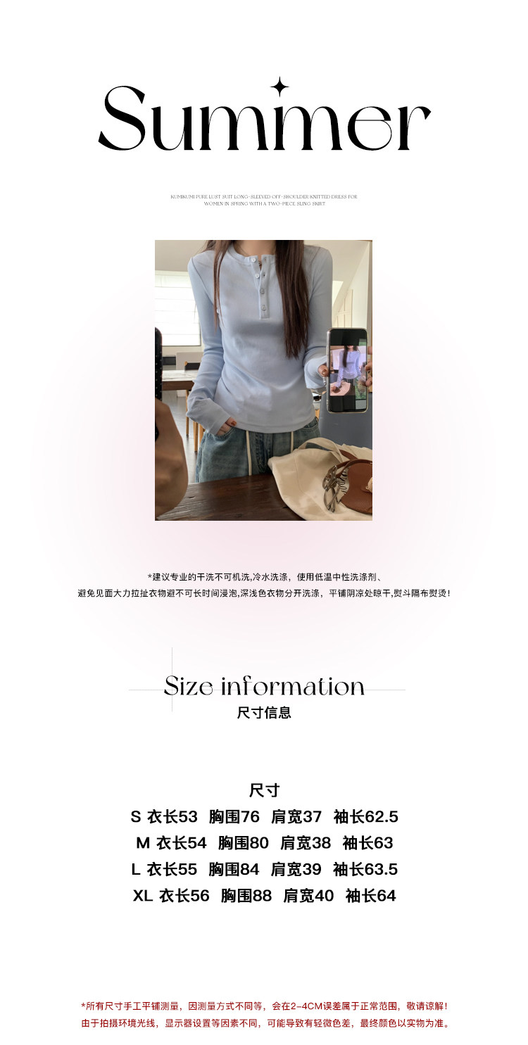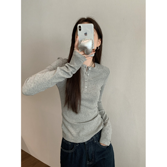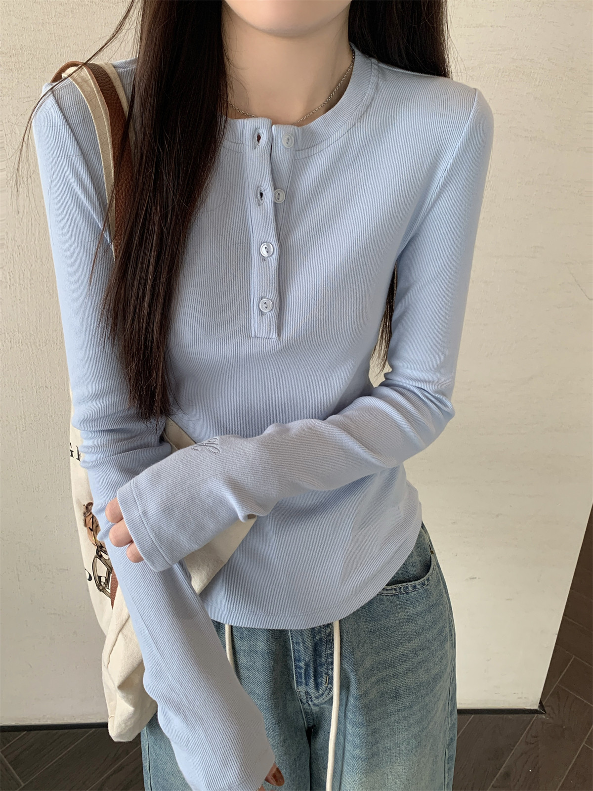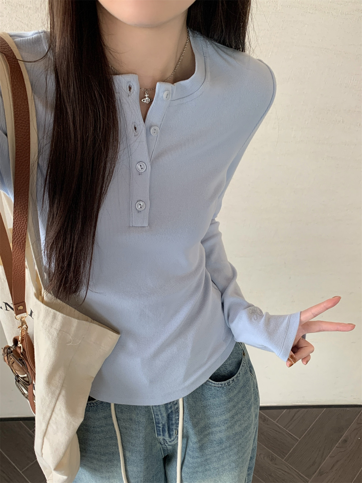 kumikumi氣質顯瘦紐釦設計感長袖T恤女裝冬季修身打底衫內搭上衣