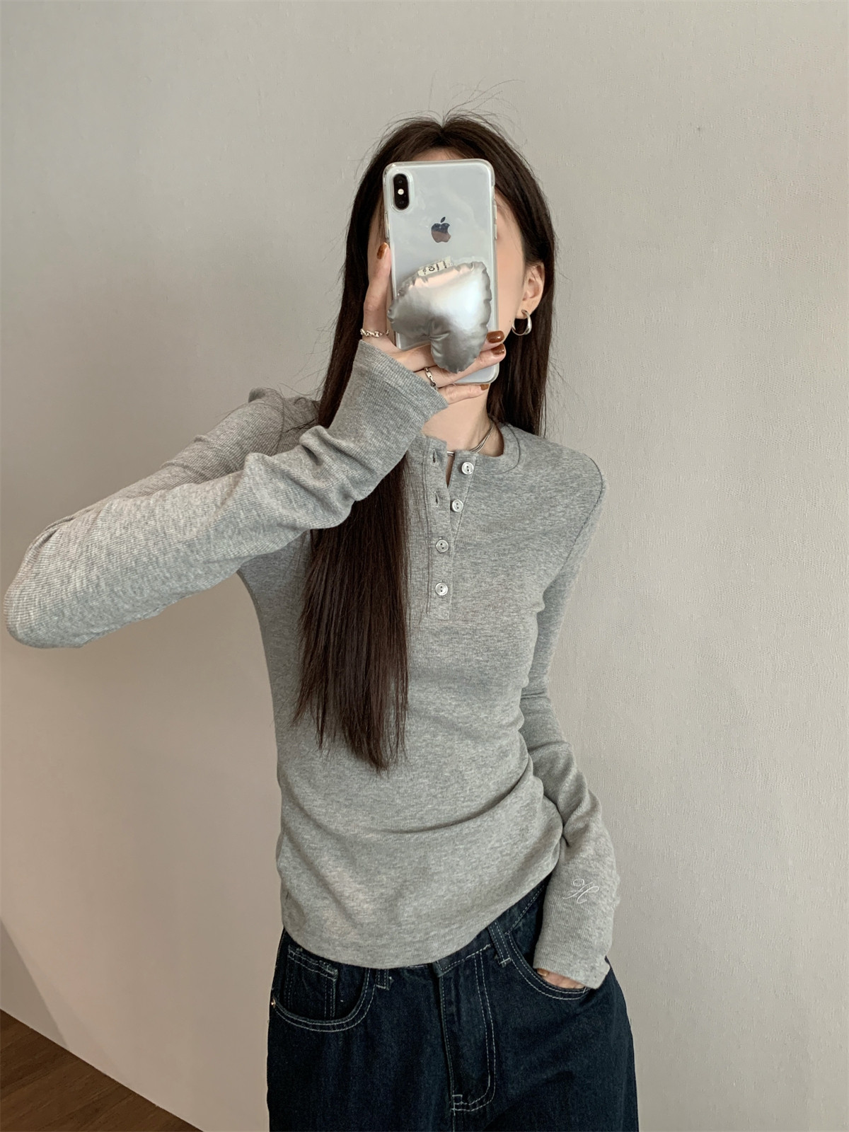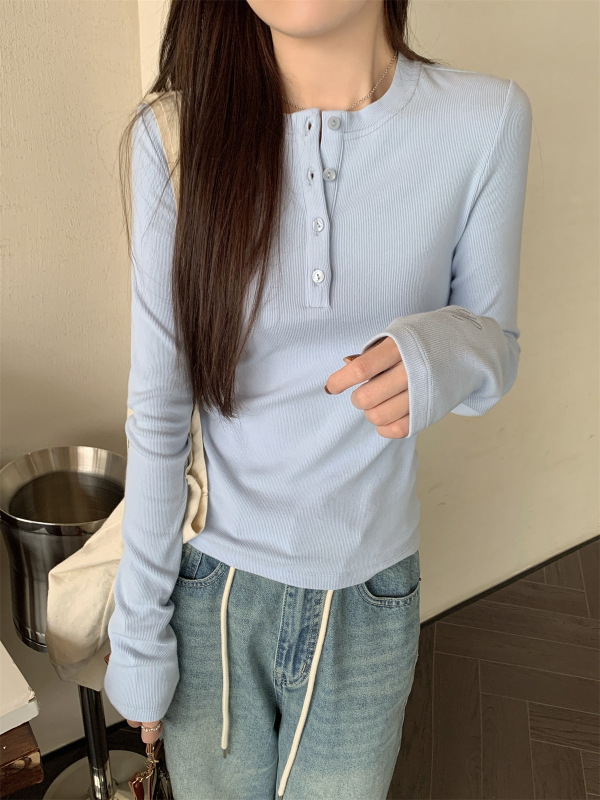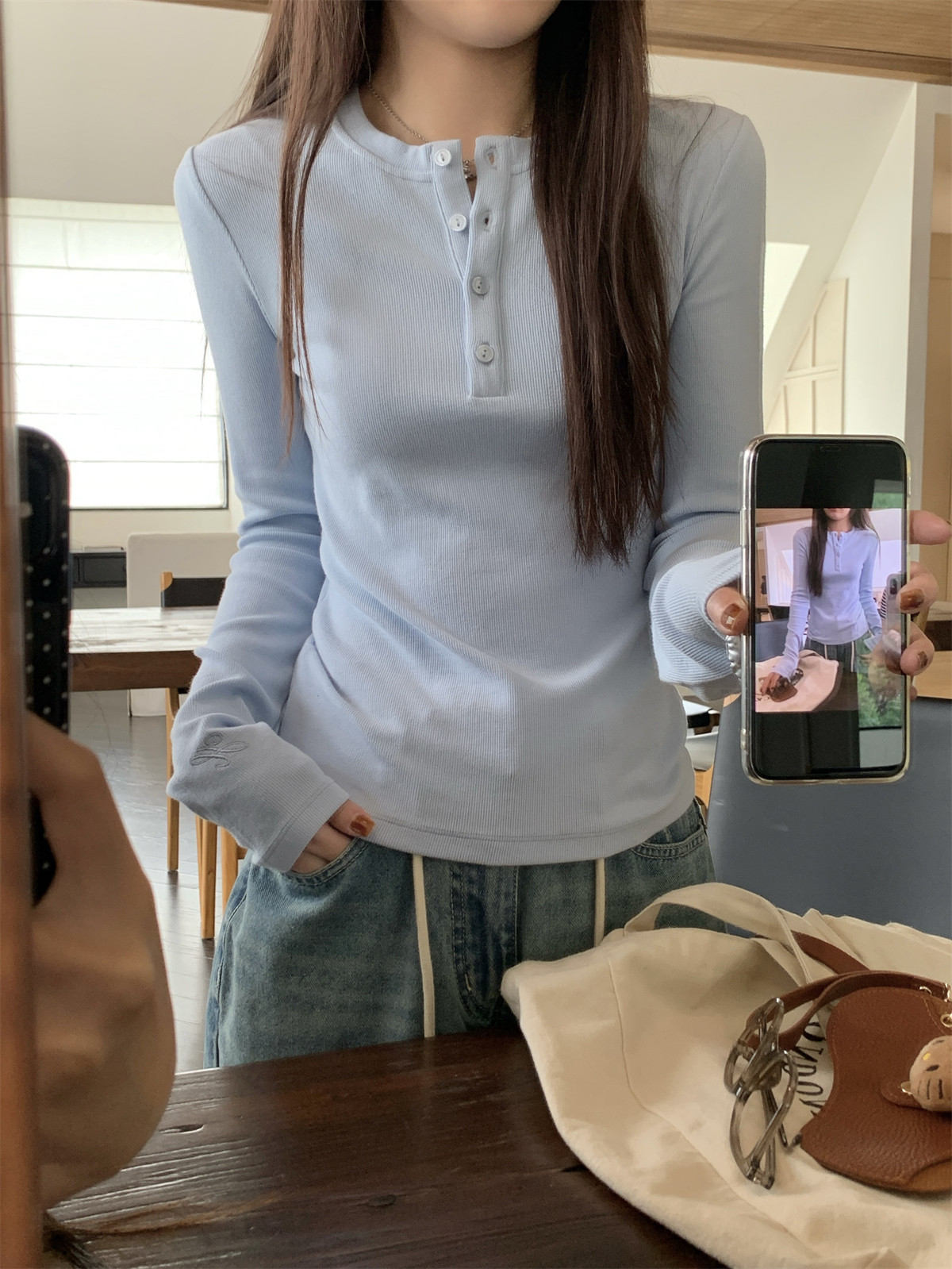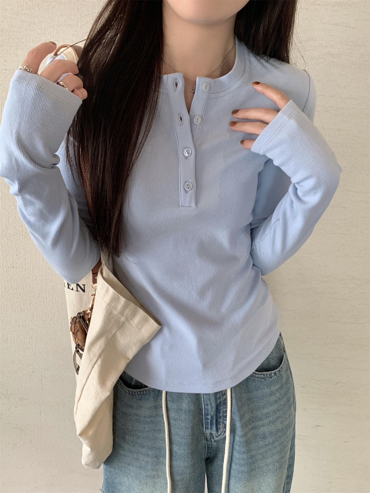 kumikumi氣質顯瘦紐釦設計感長袖T恤女裝冬季修身打底衫內搭上衣