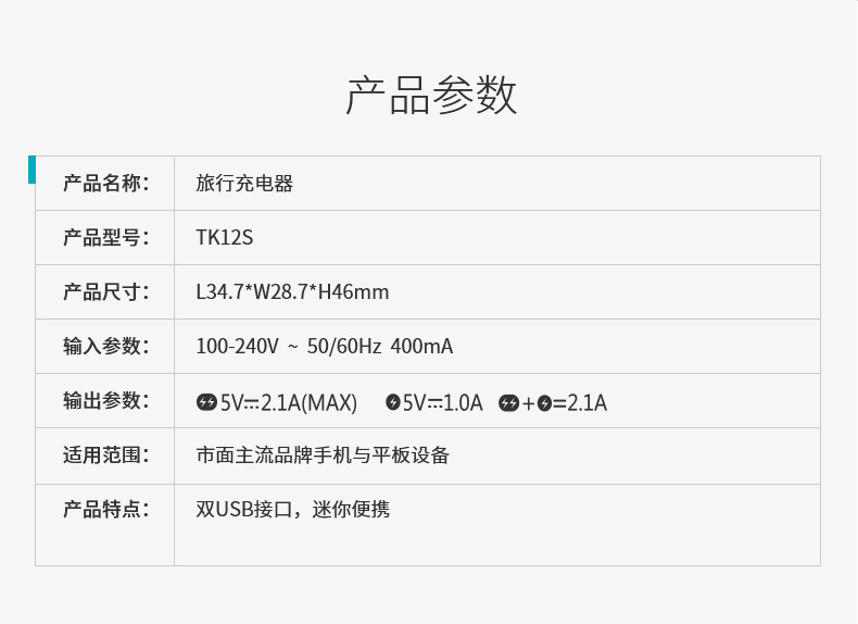 | 適用型號 | 10.5W雙USB充電頭 |