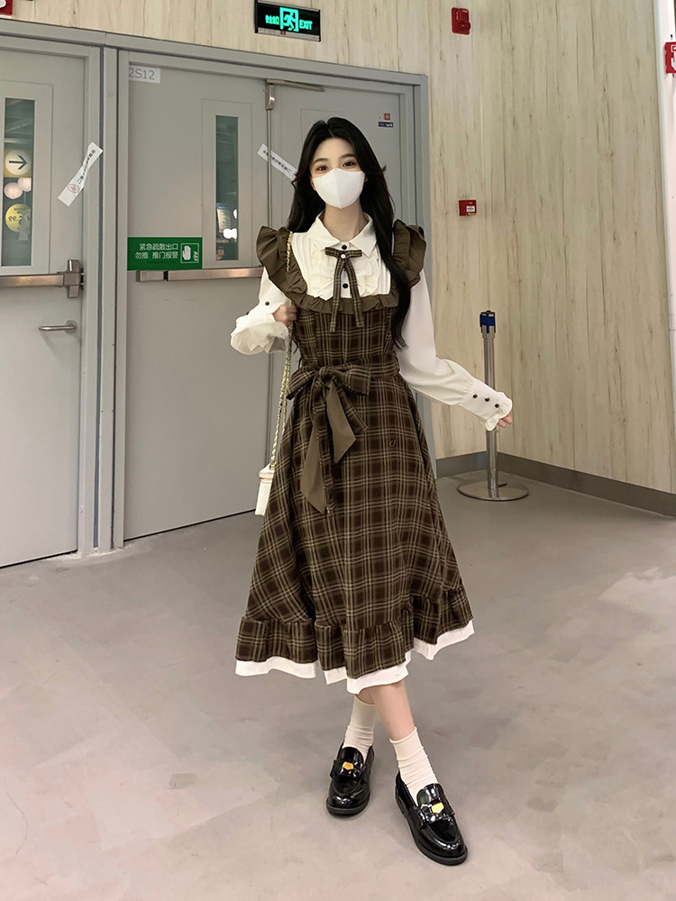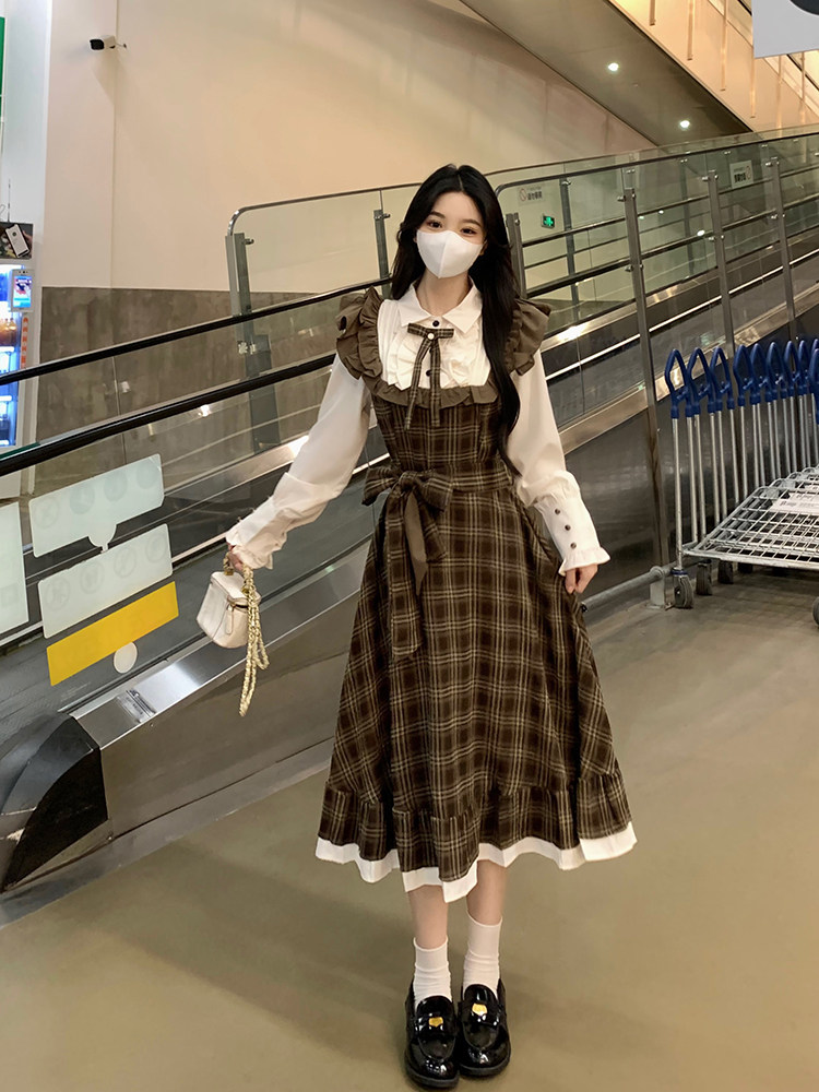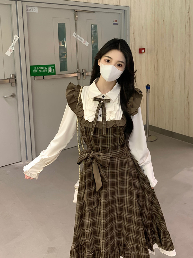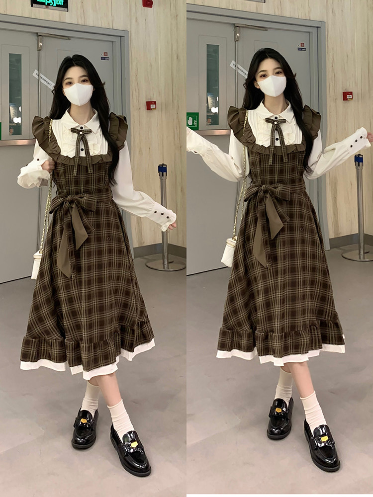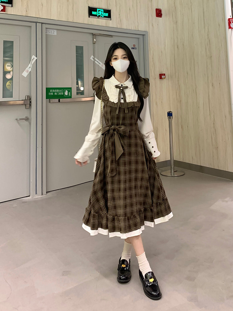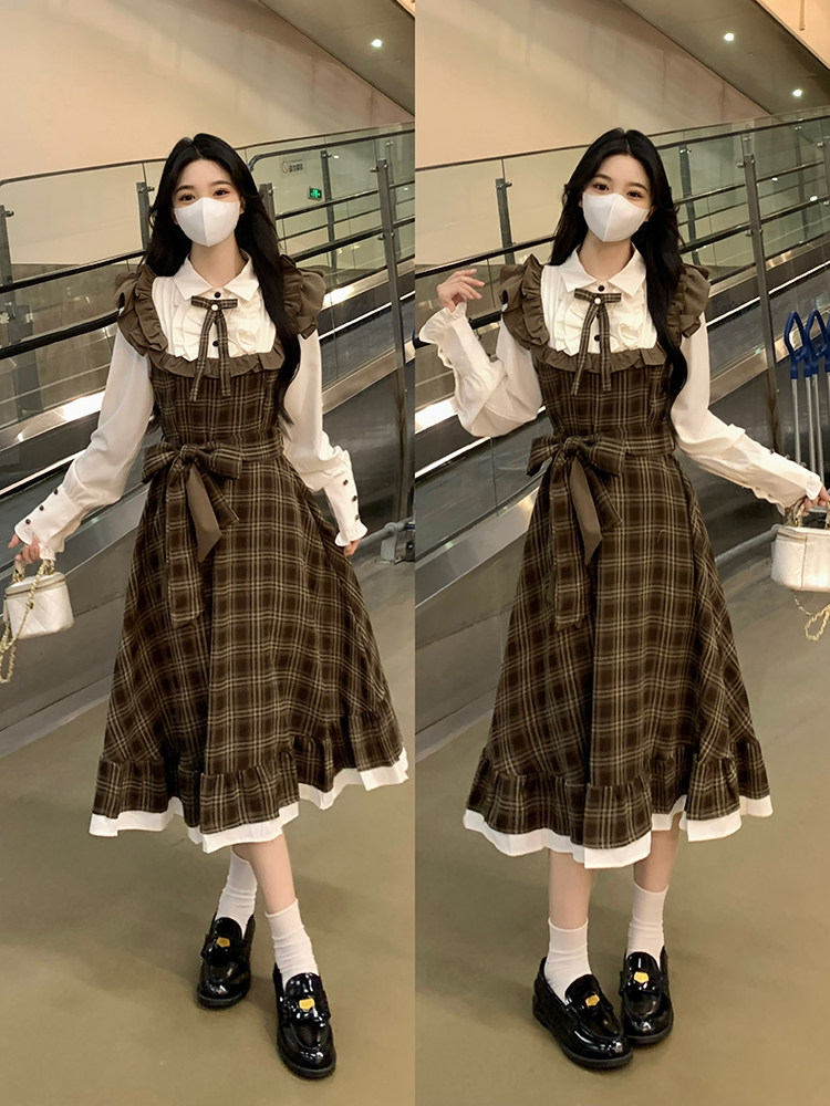 春秋新款文藝復古襯衣拼接背帶裙假兩件大碼學院風蘿莉格子連衣裙