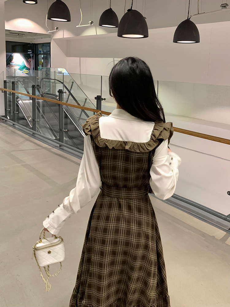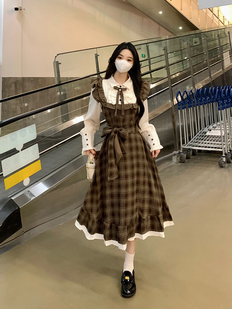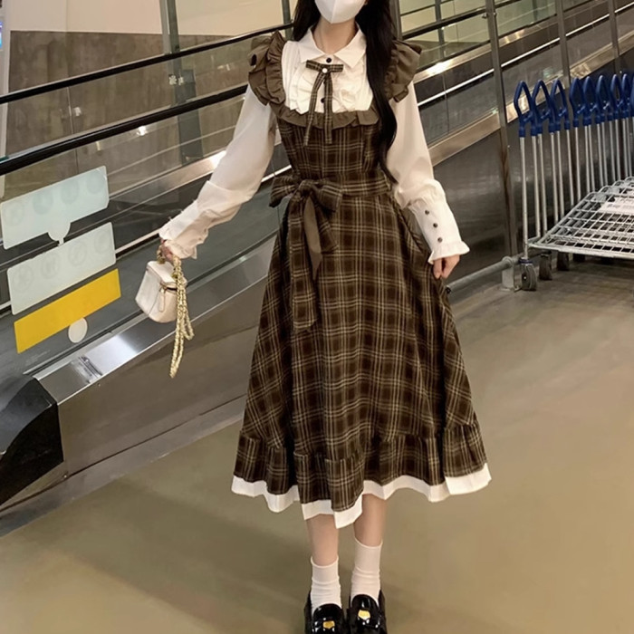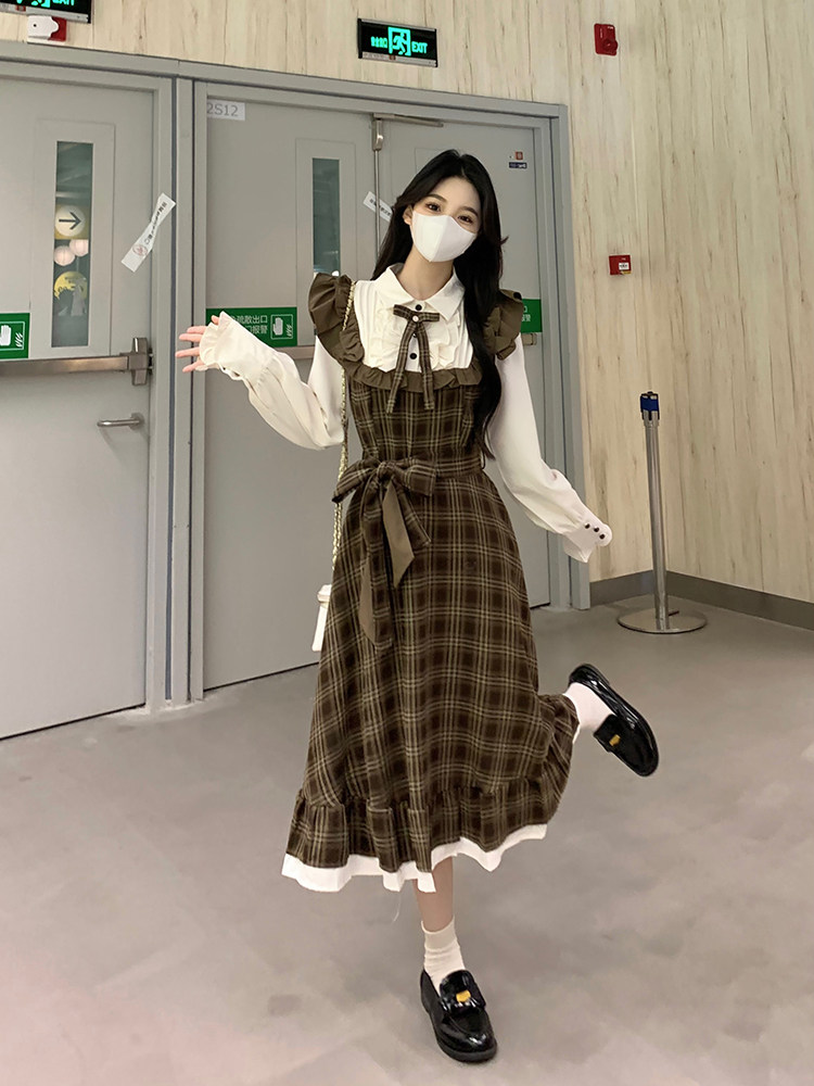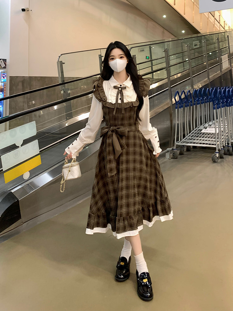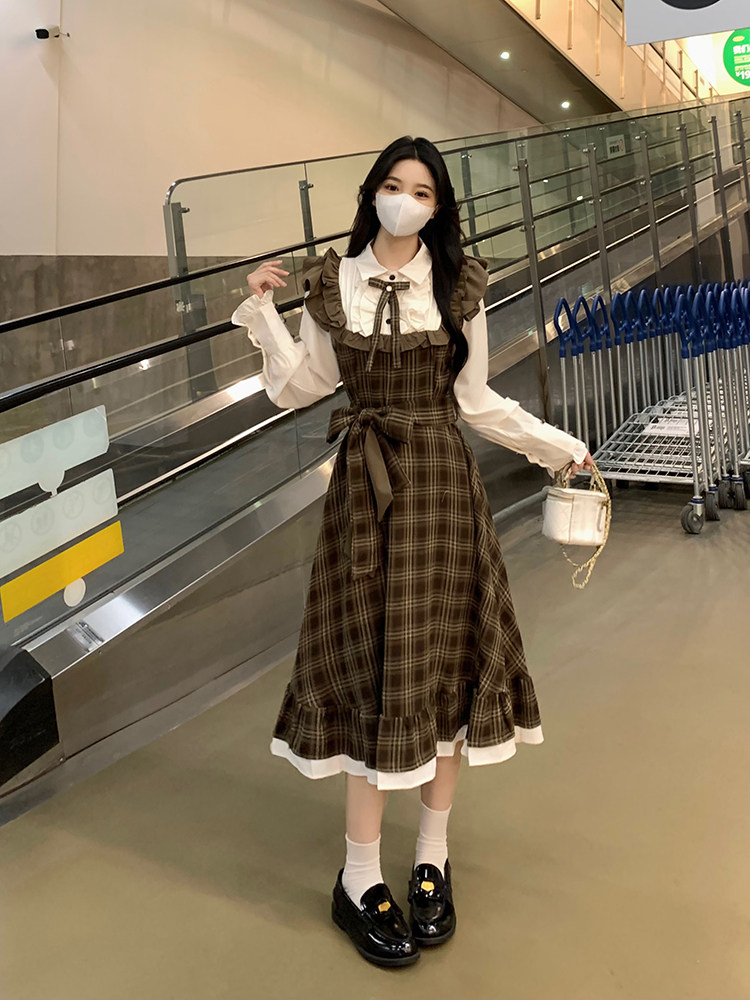 春秋新款文藝復古襯衣拼接背帶裙假兩件大碼學院風蘿莉格子連衣裙