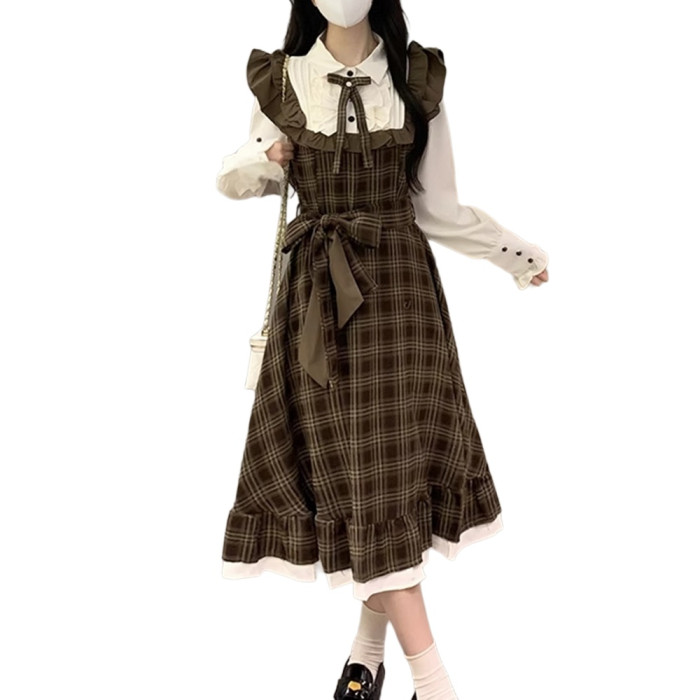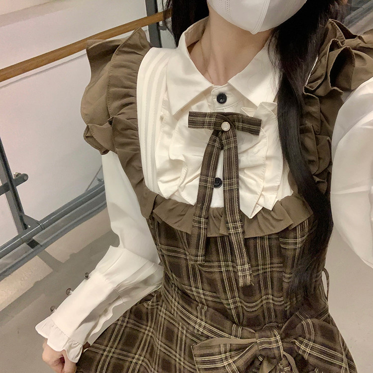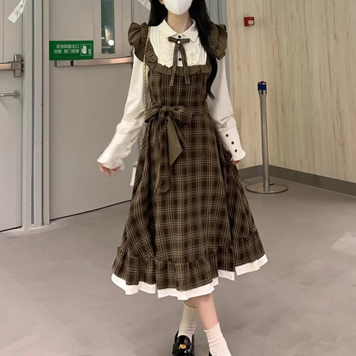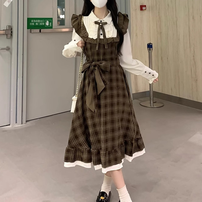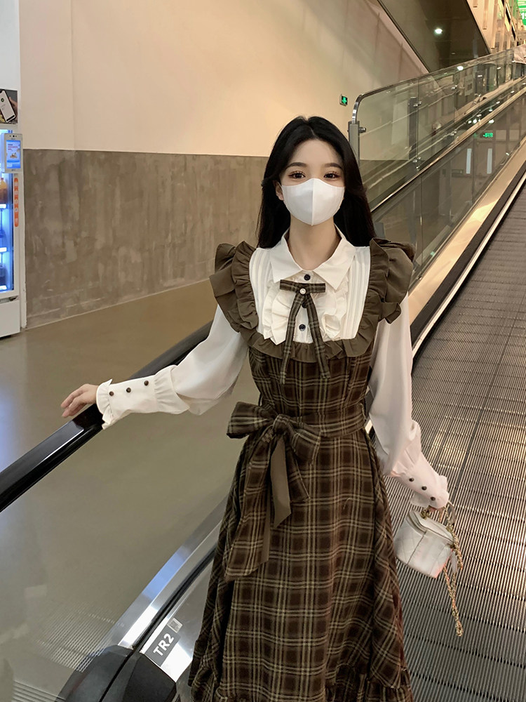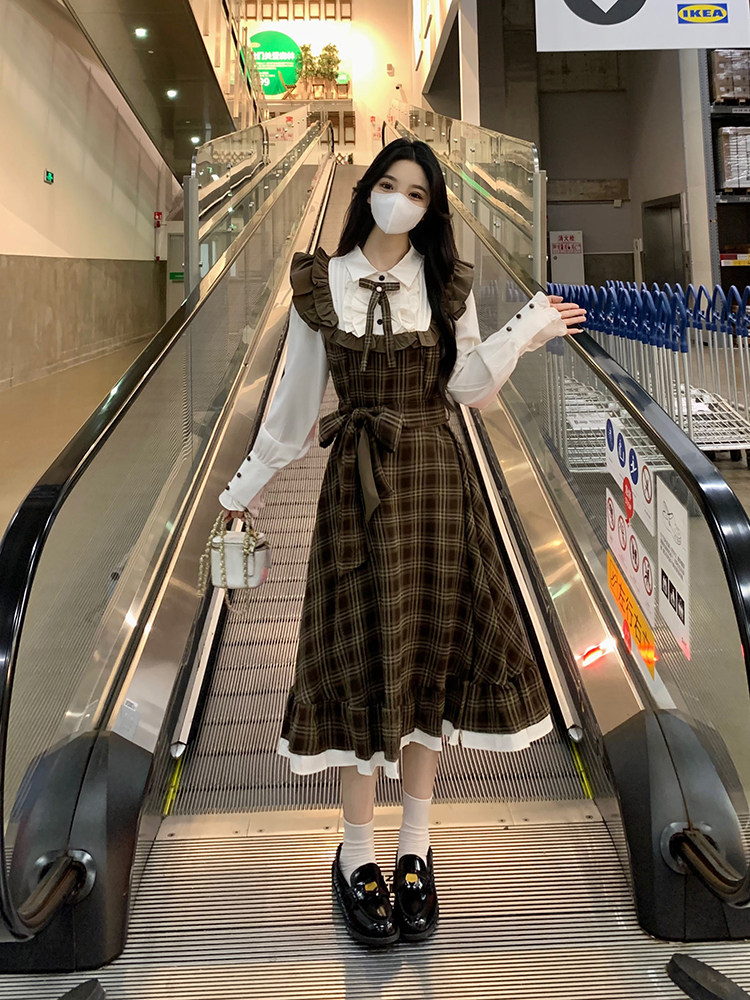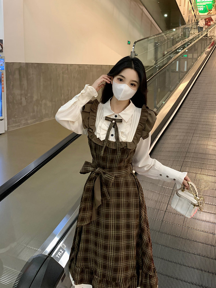 春秋新款文藝復古襯衣拼接背帶裙假兩件大碼學院風蘿莉格子連衣裙