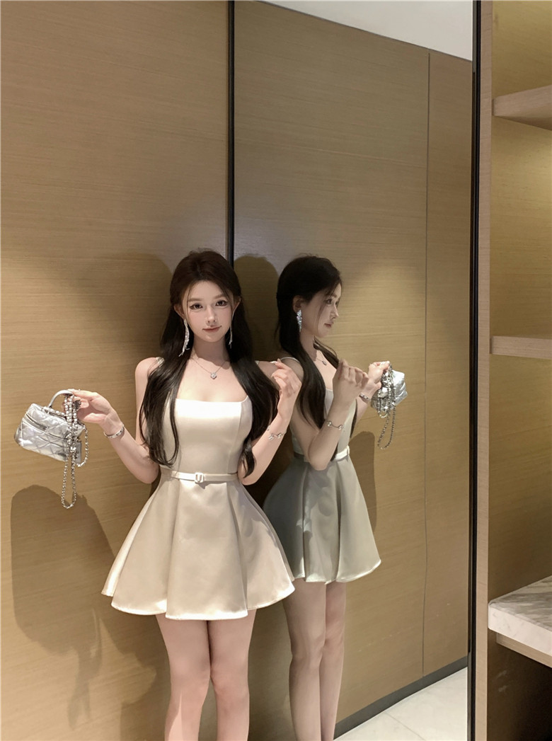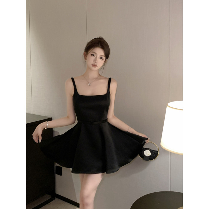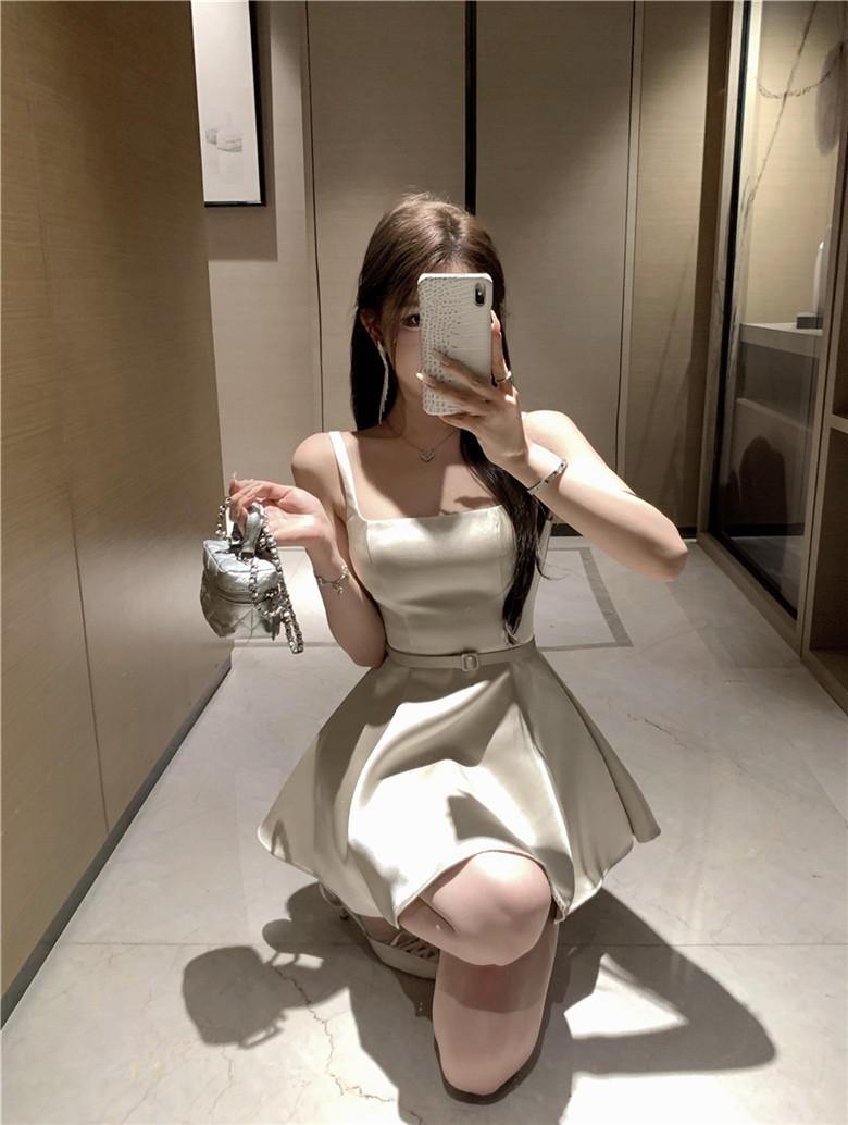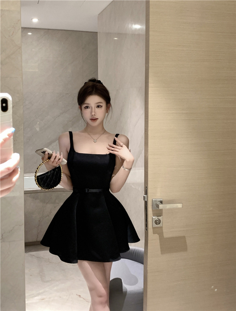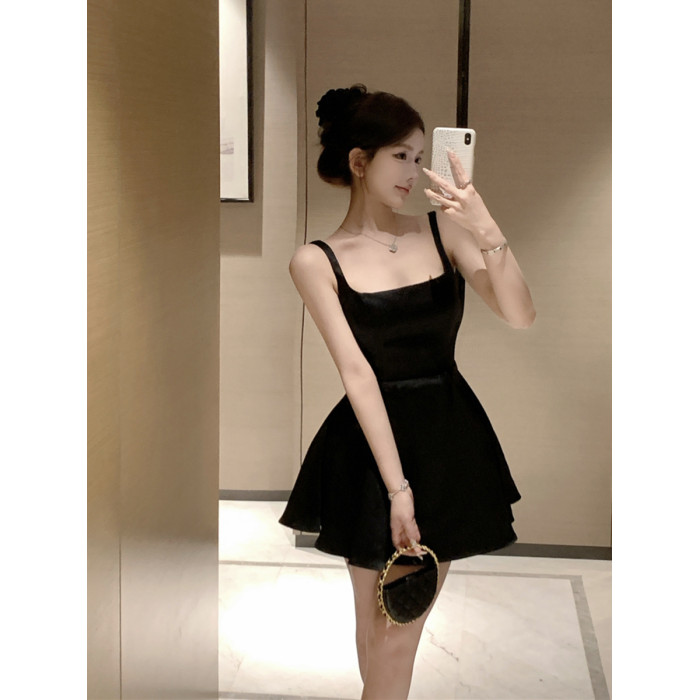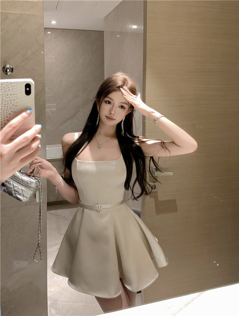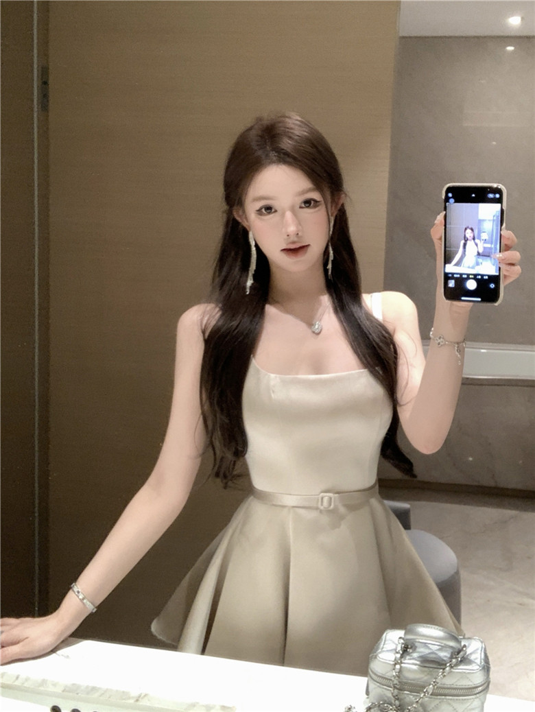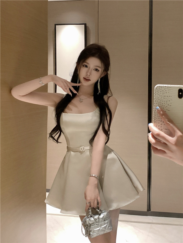 氣質緞面修身吊帶連衣裙女裝夏季高級感蓬蓬短裙顯瘦收腰a字裙子