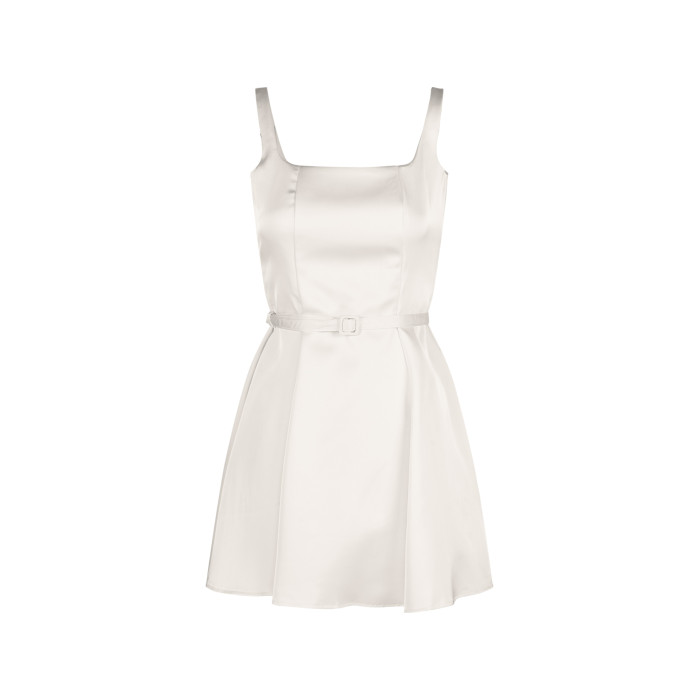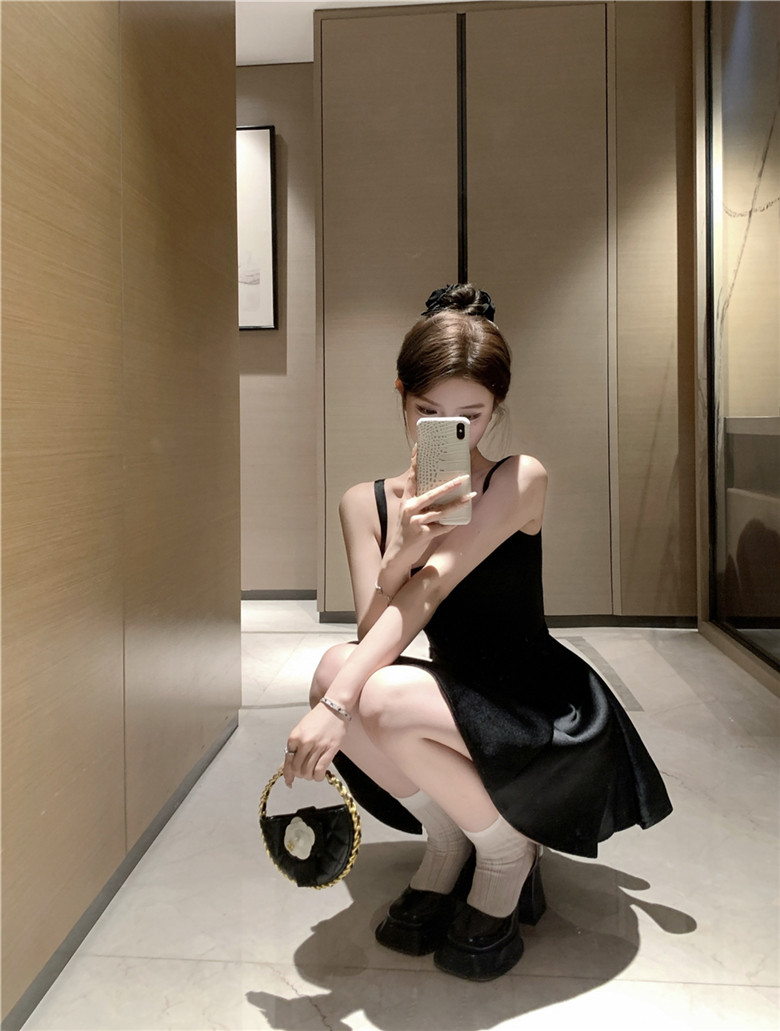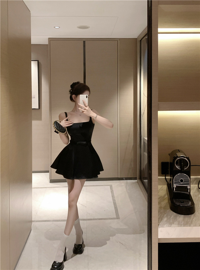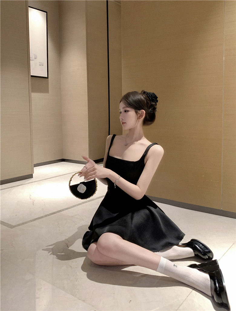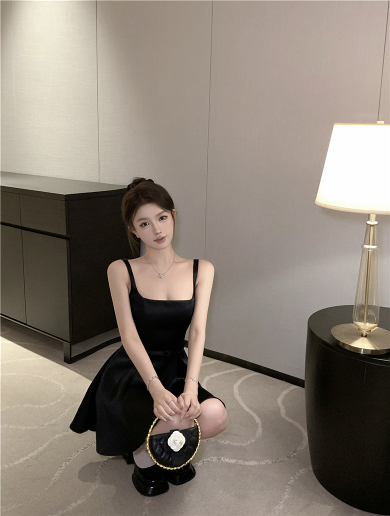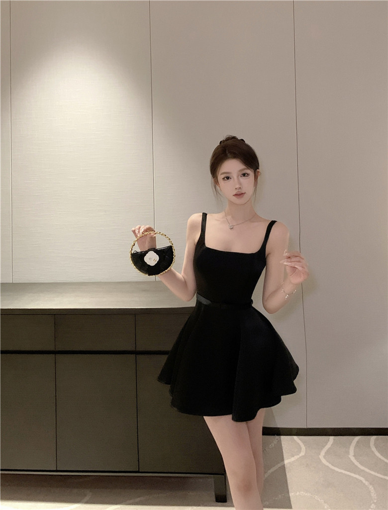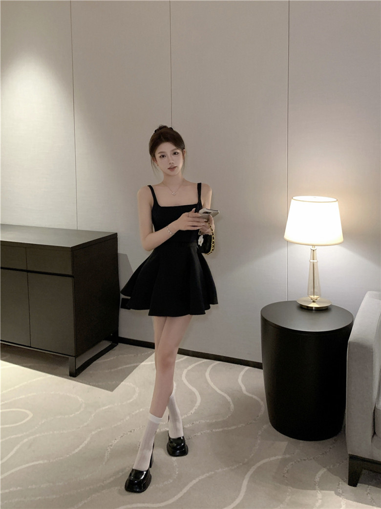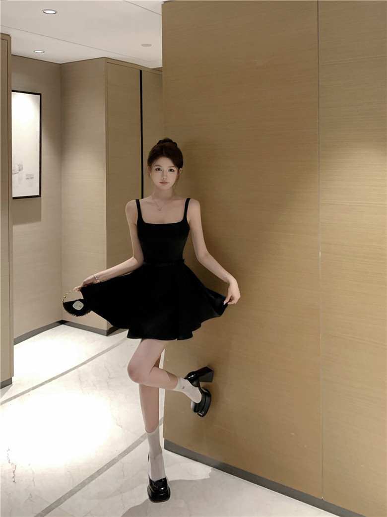 氣質緞面修身吊帶連衣裙女裝夏季高級感蓬蓬短裙顯瘦收腰a字裙子
