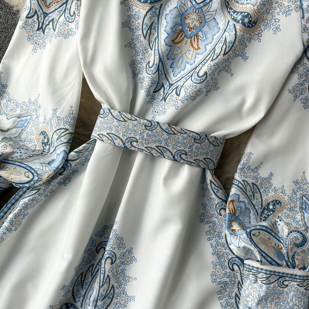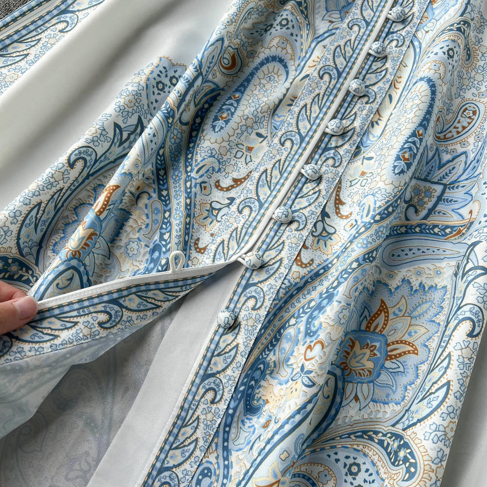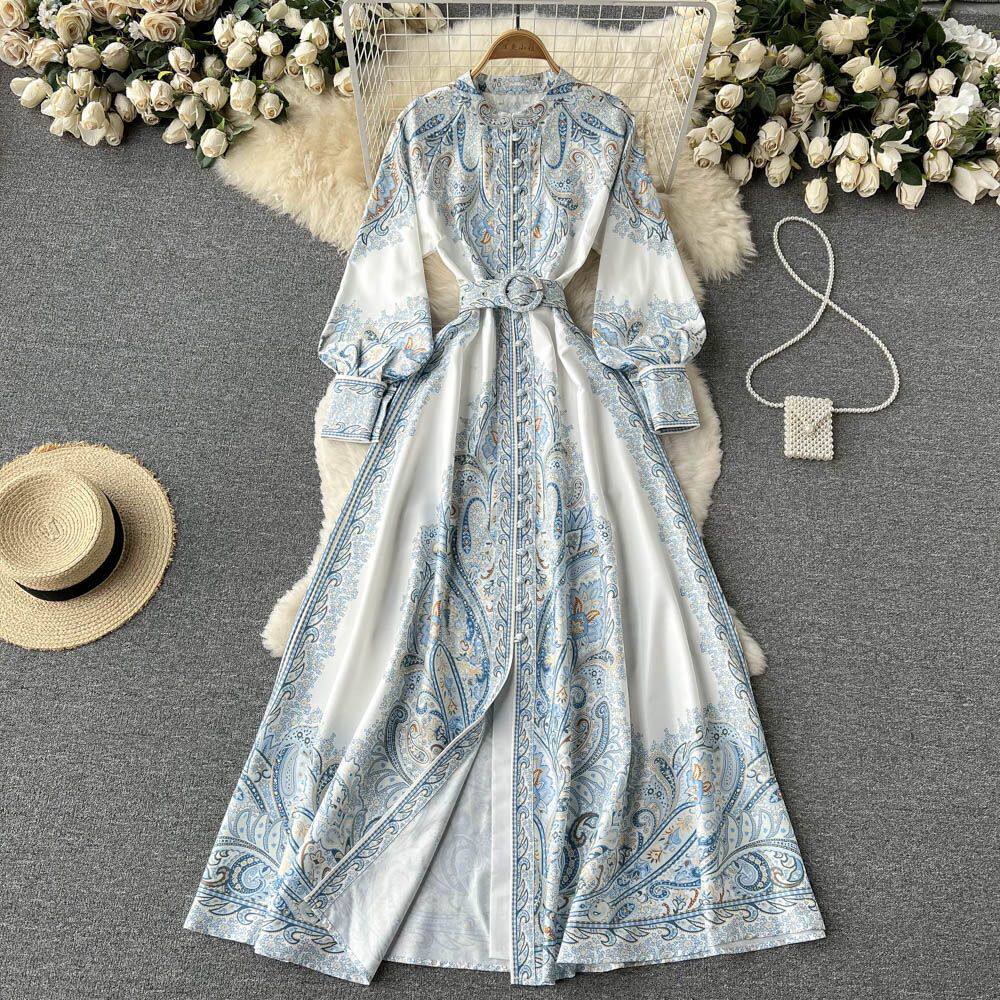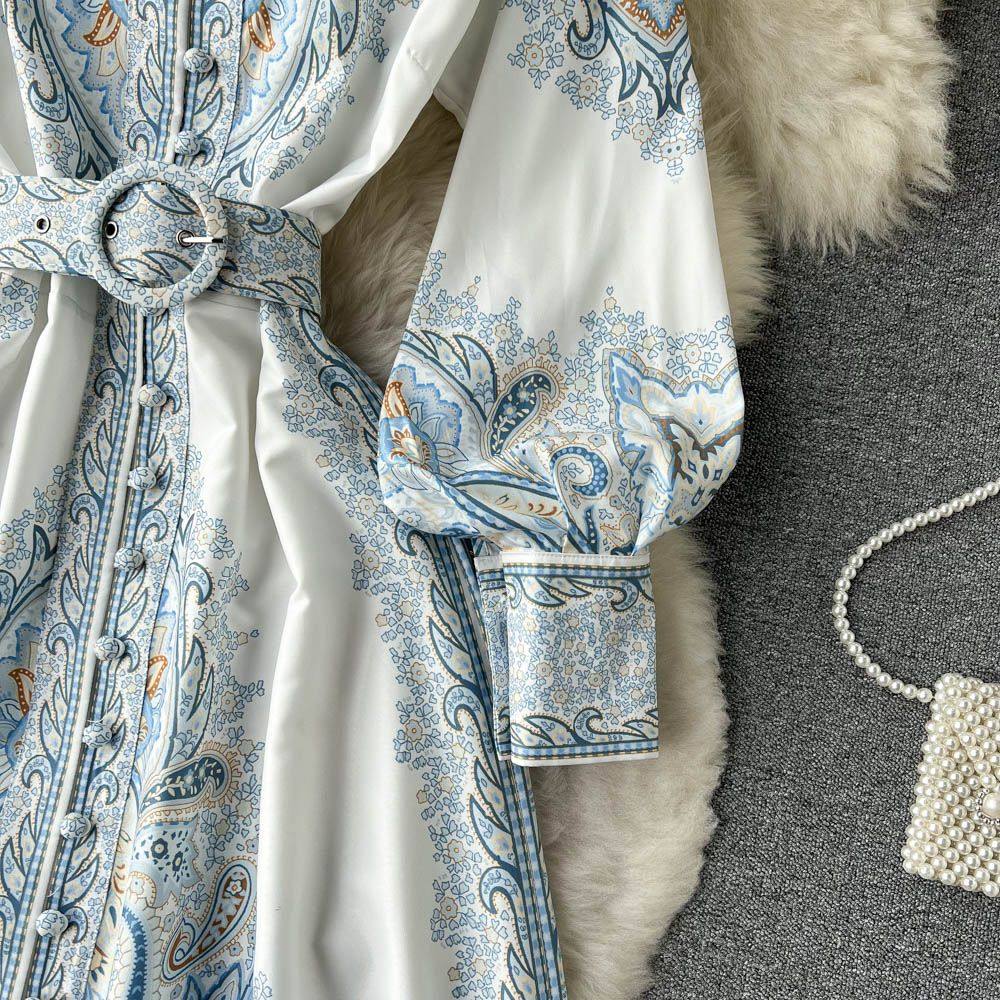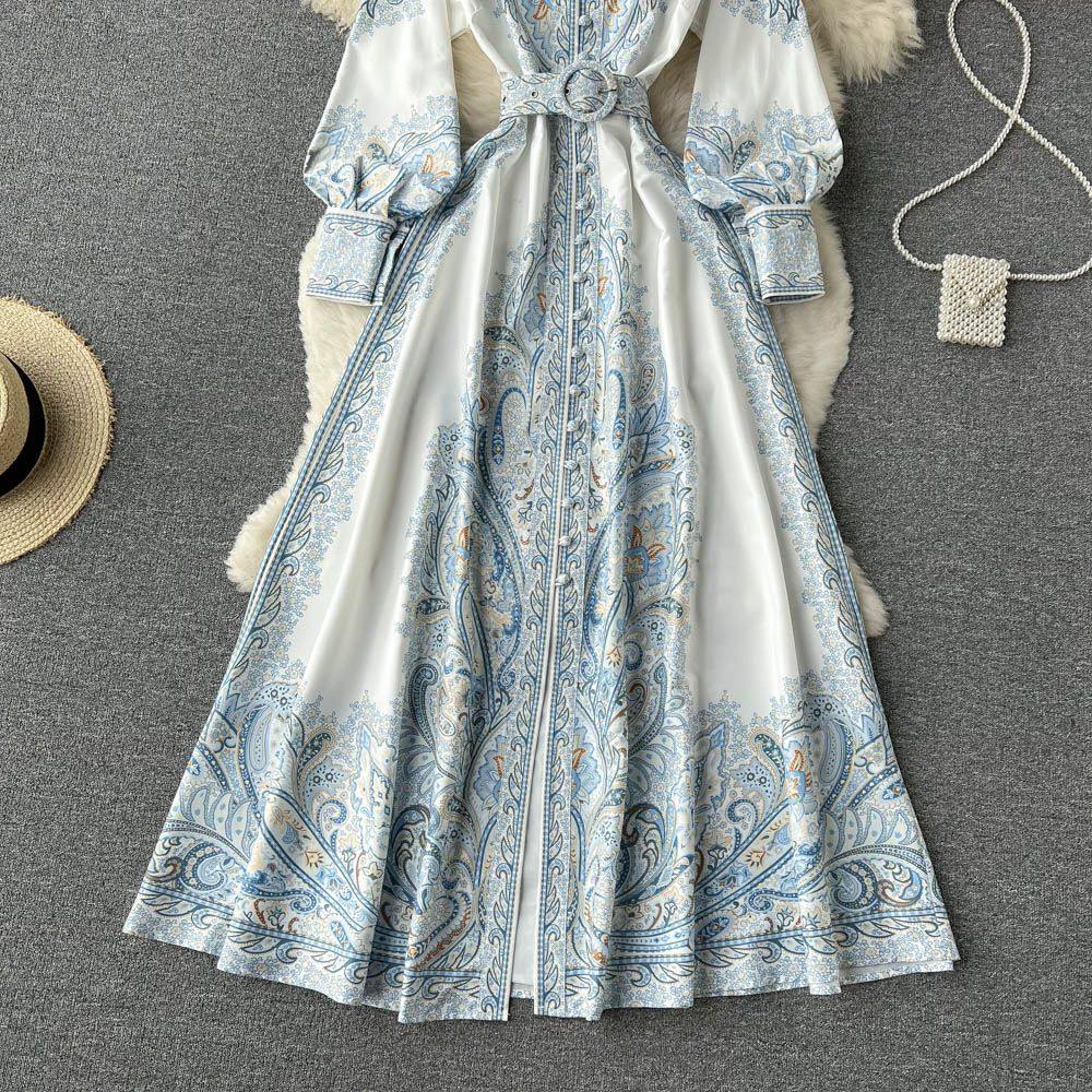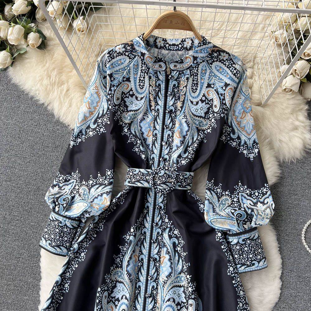 春秋裝復古宮廷風繙領燈籠袖印花連衣裙女單排釦大擺A字過膝長裙