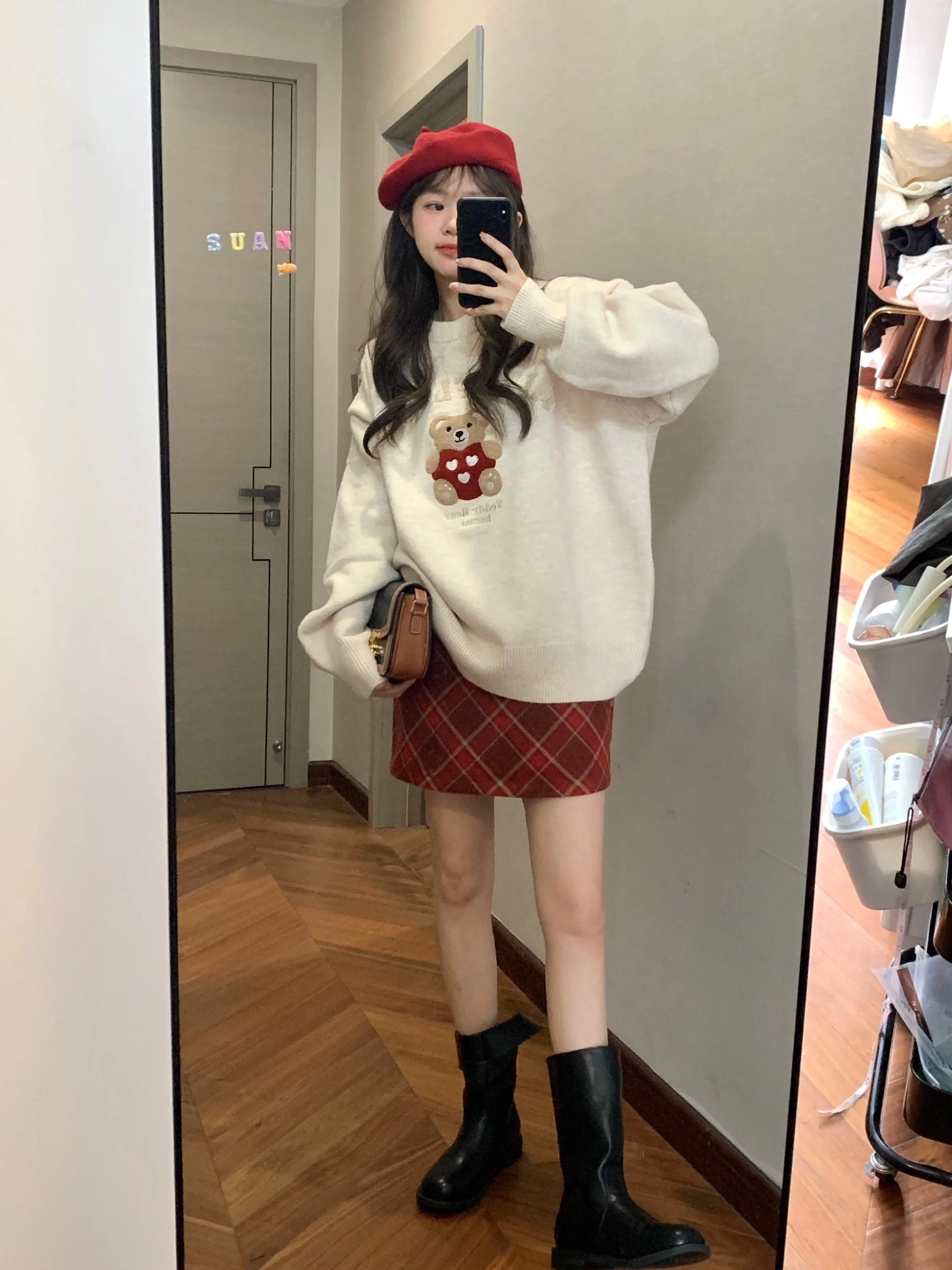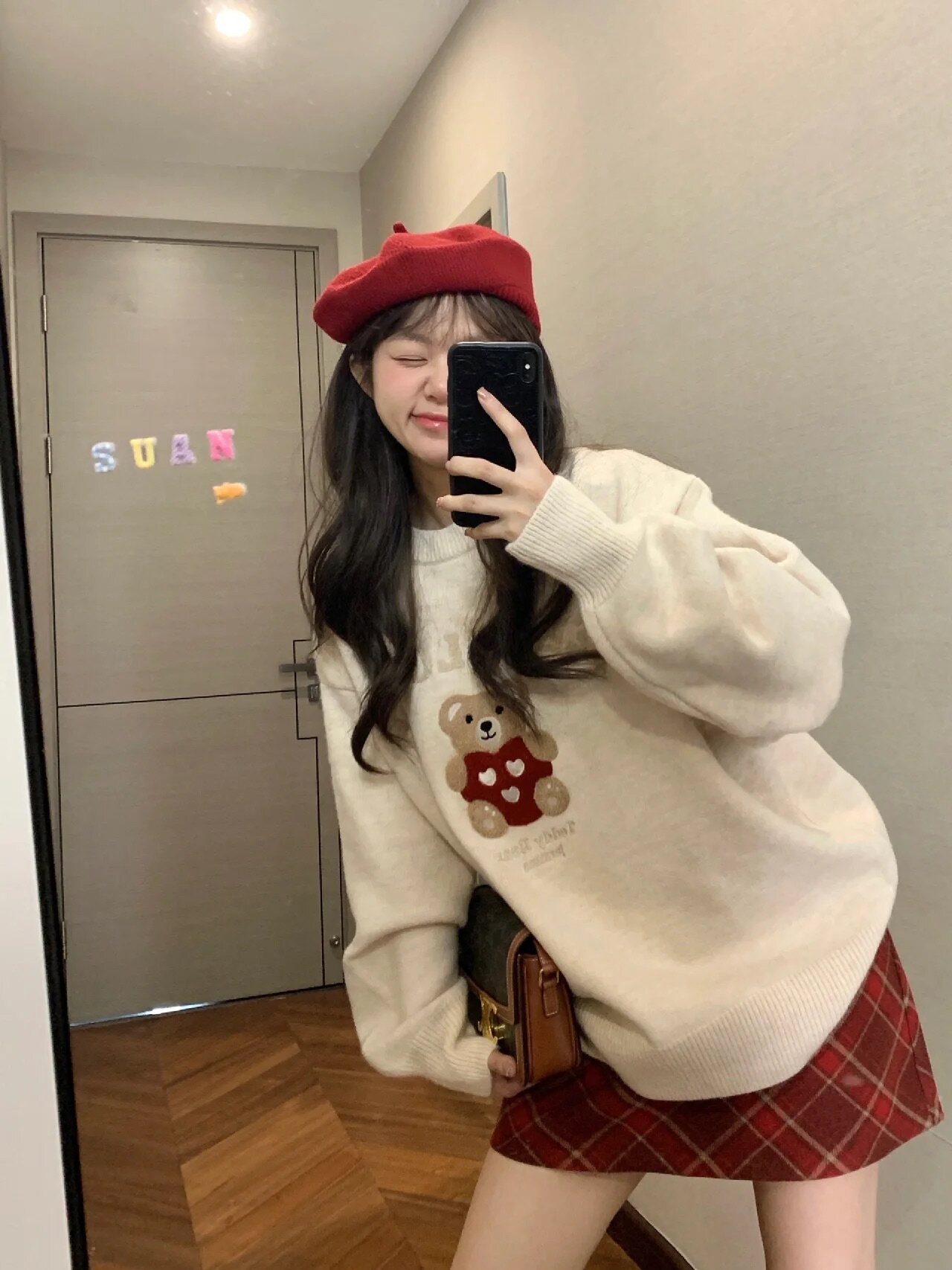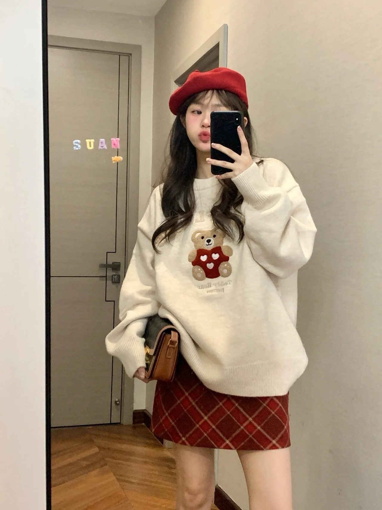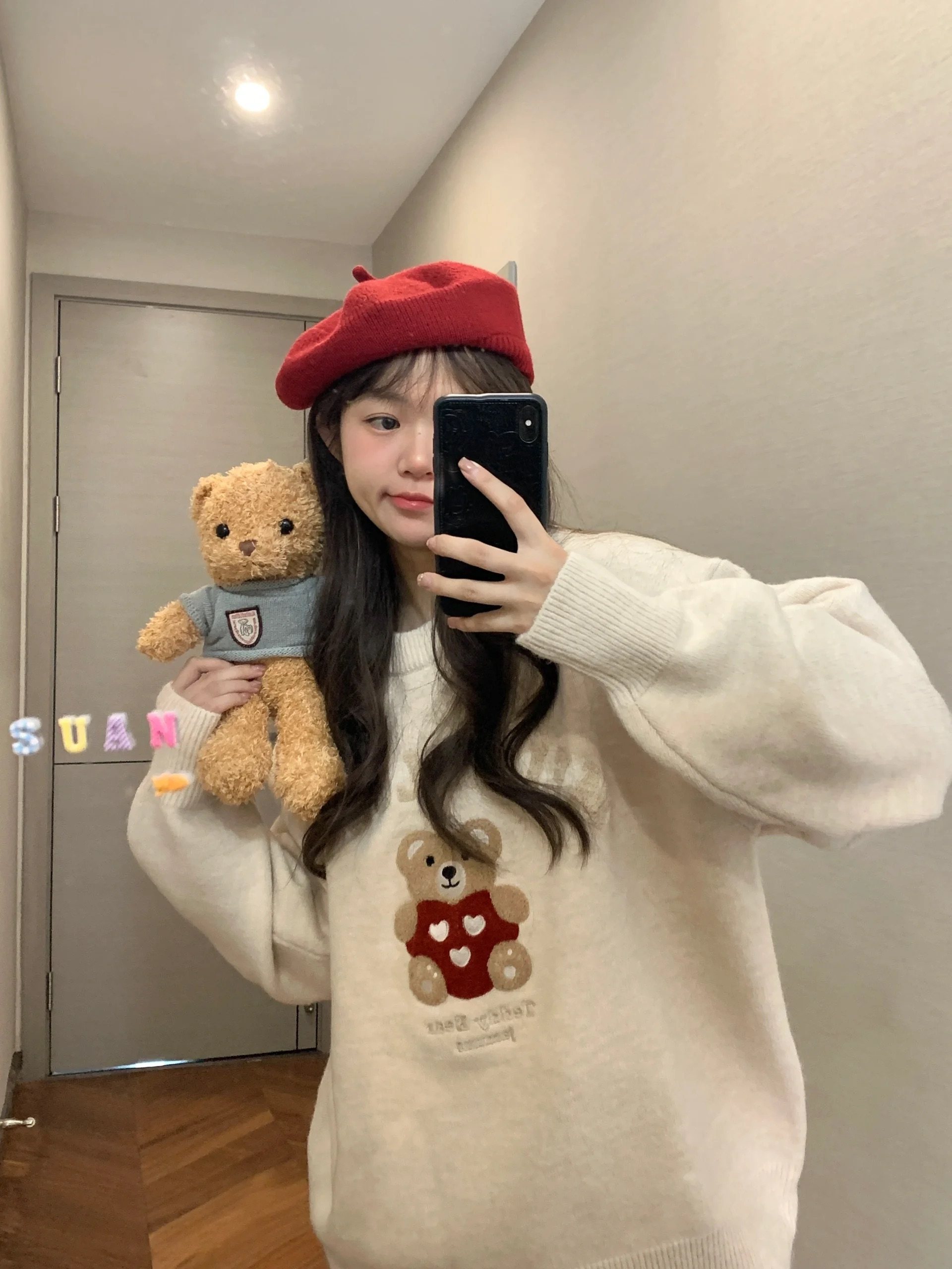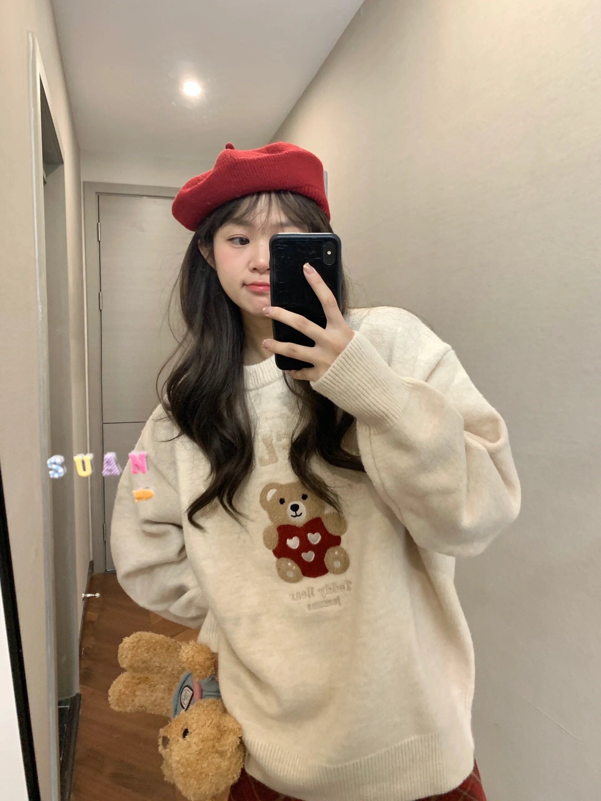 秋冬季小熊套頭毛衣女寬松慵懶風聖誕氛圍感穿搭圓領針織內搭上衣
