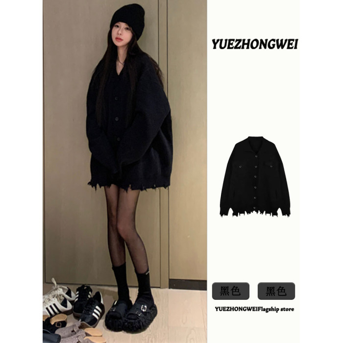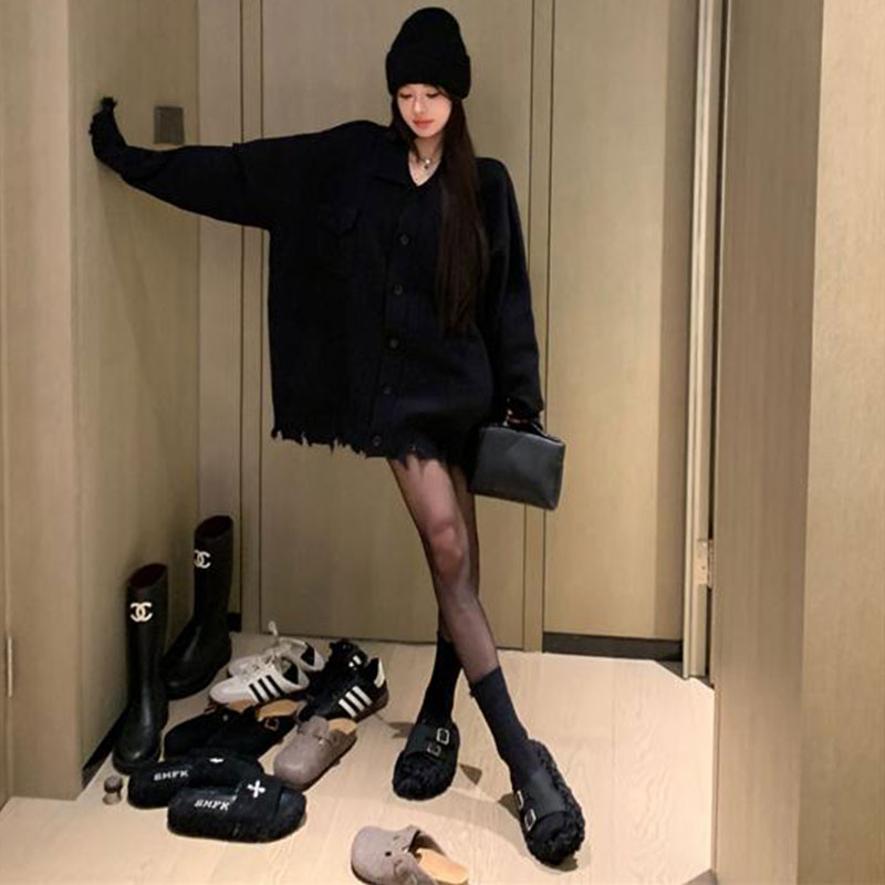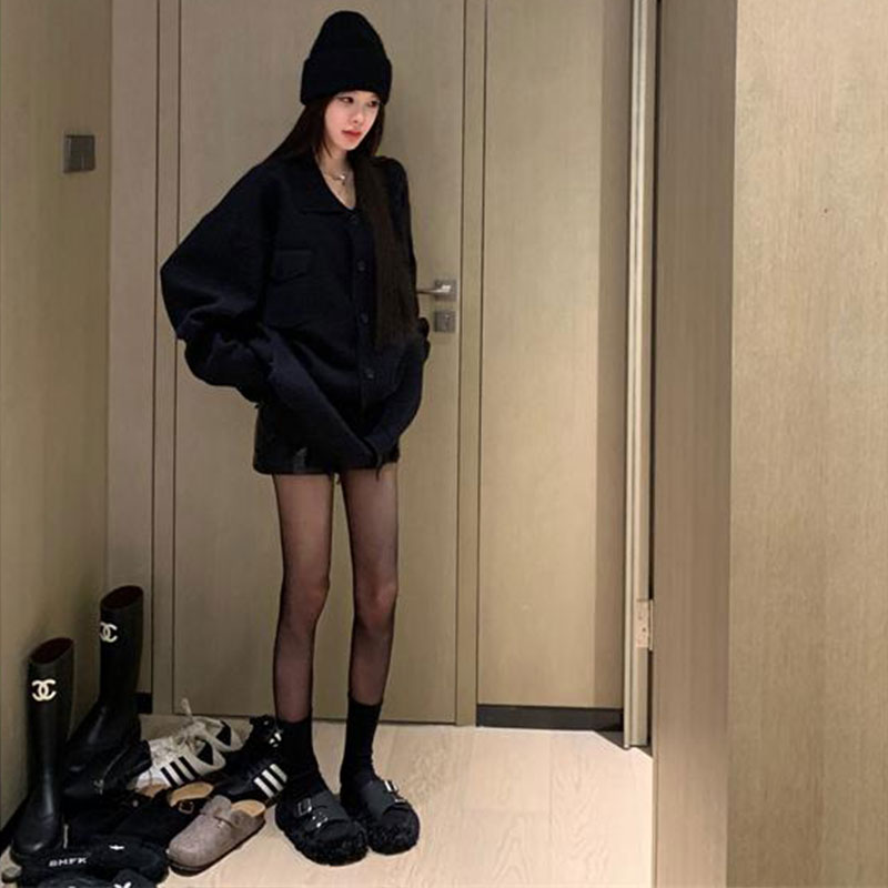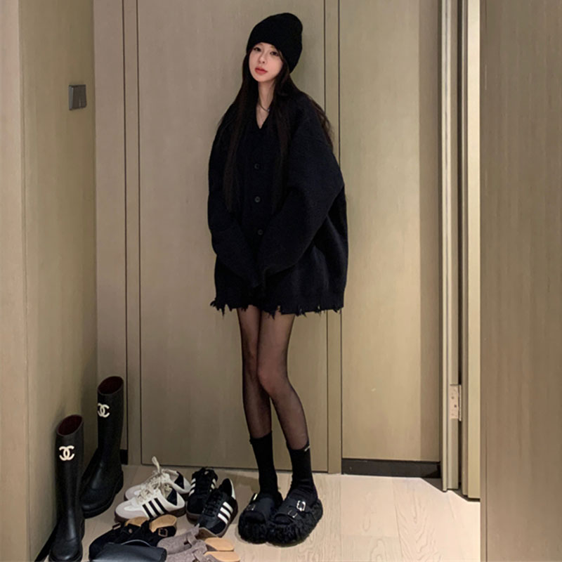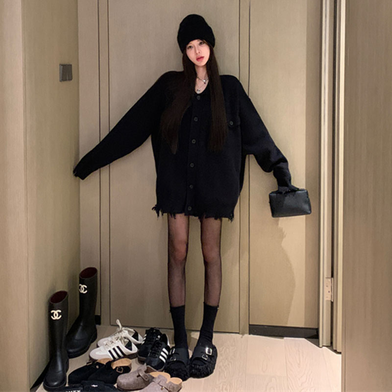 黑色軟糯V領毛衣開衫女2025秋冬新款慵懶風中長款超好看針織外套
