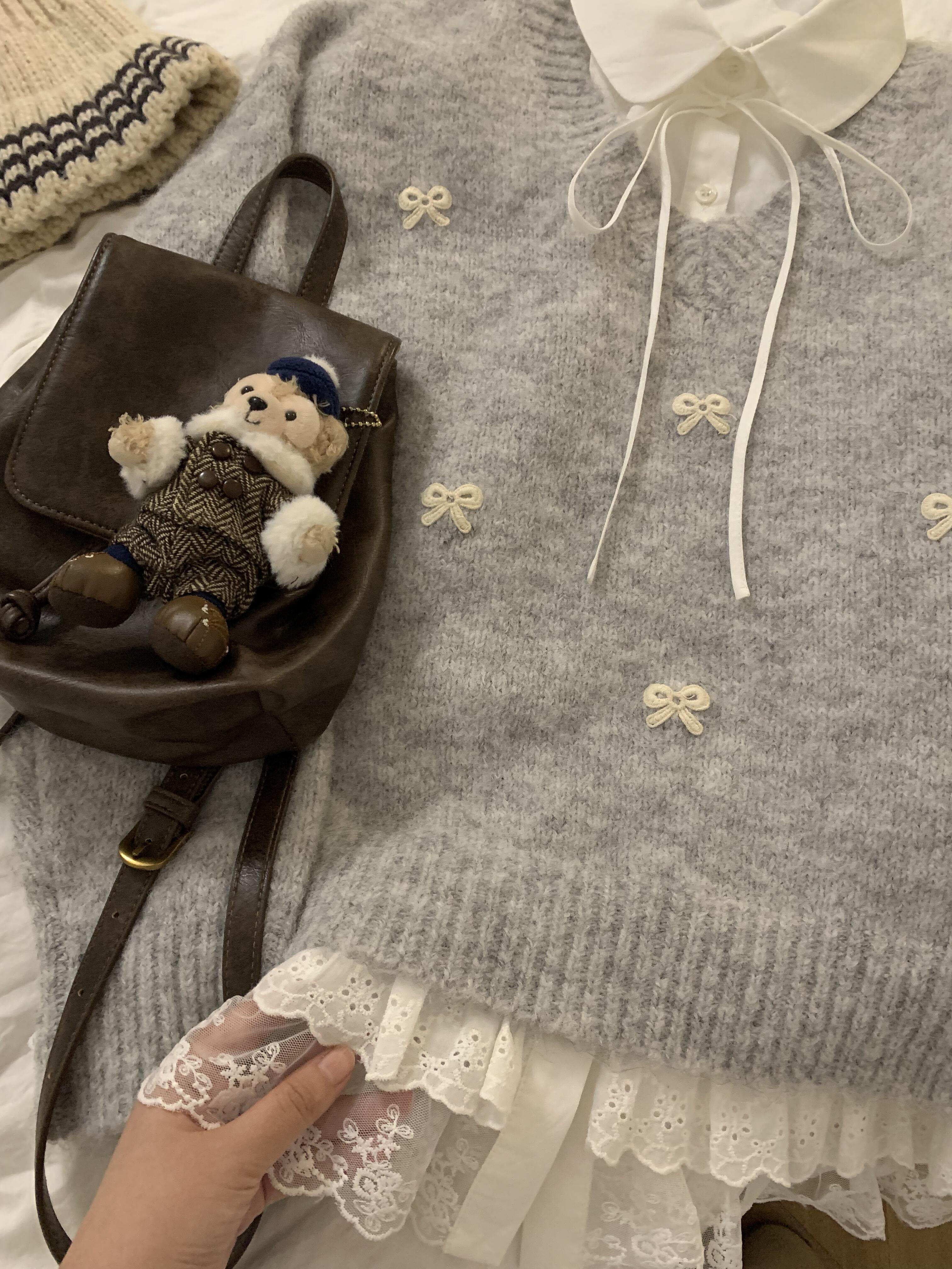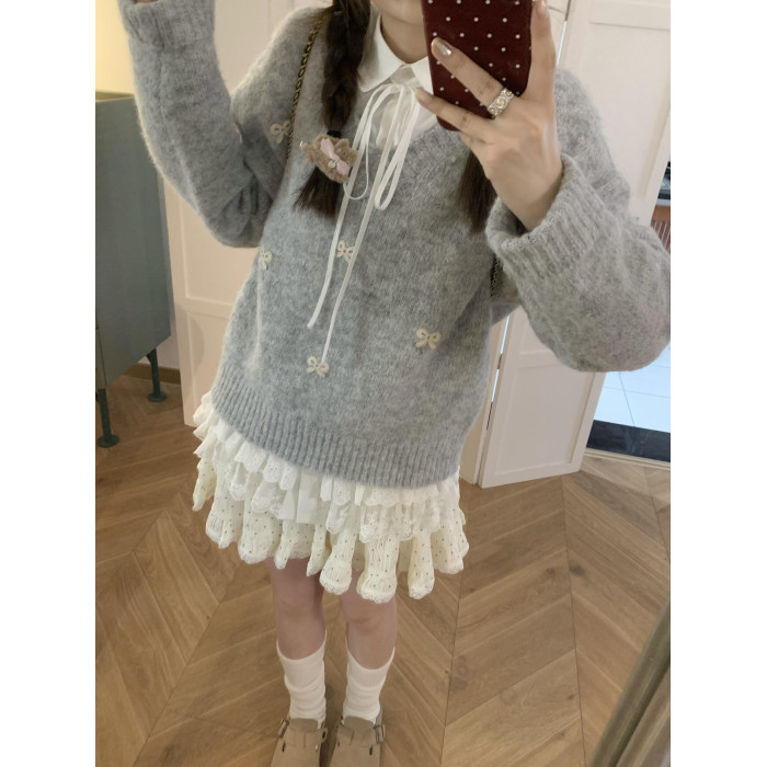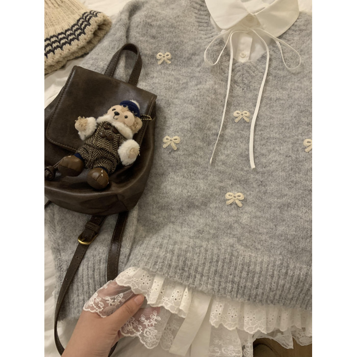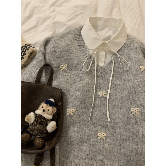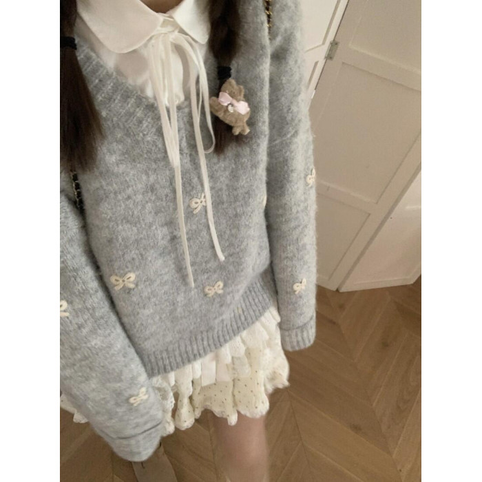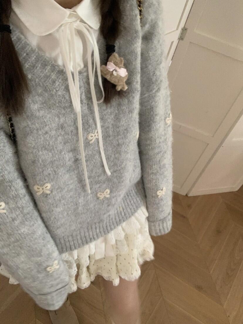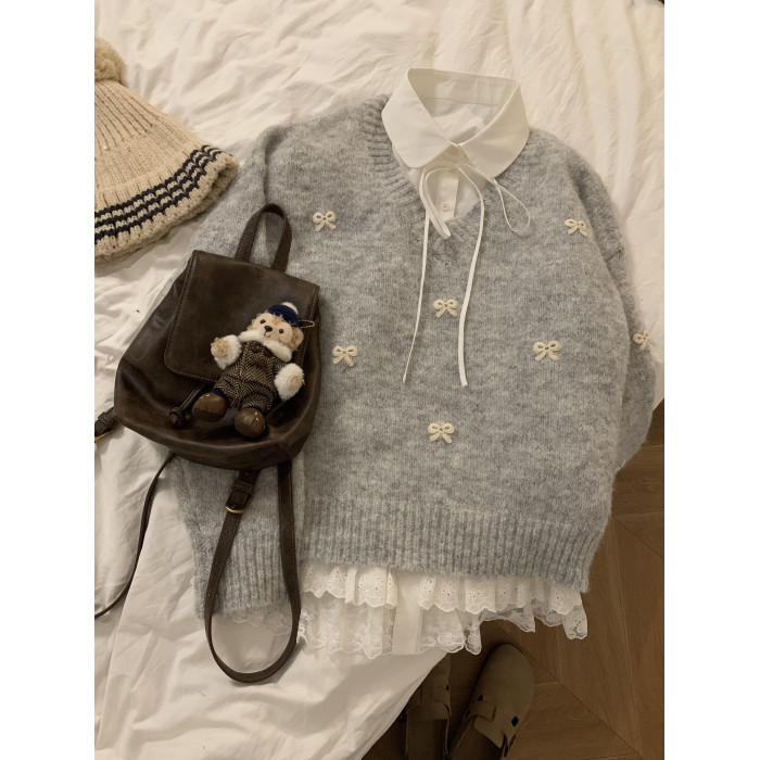 秋季軟糯提花蝴蝶結v領灰色毛衣女日系甜美寬松慵懶針織衫上衣冬