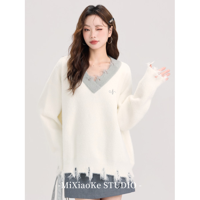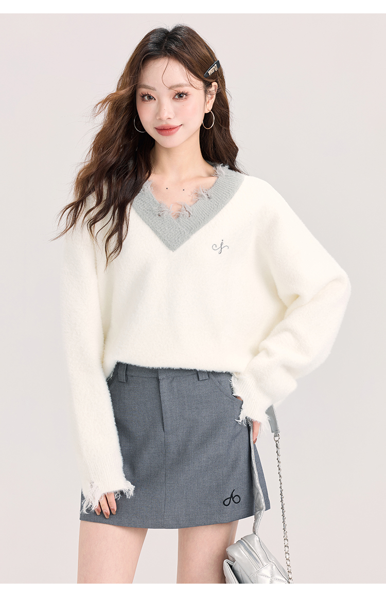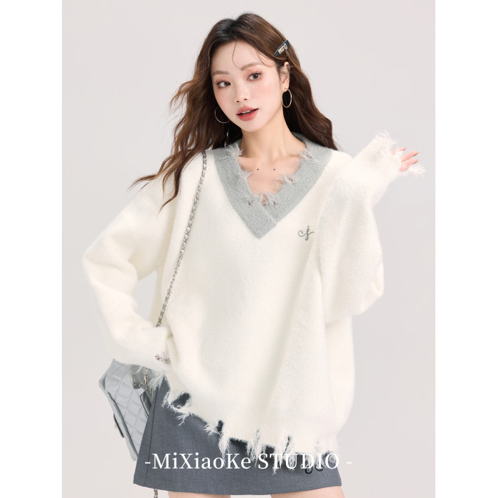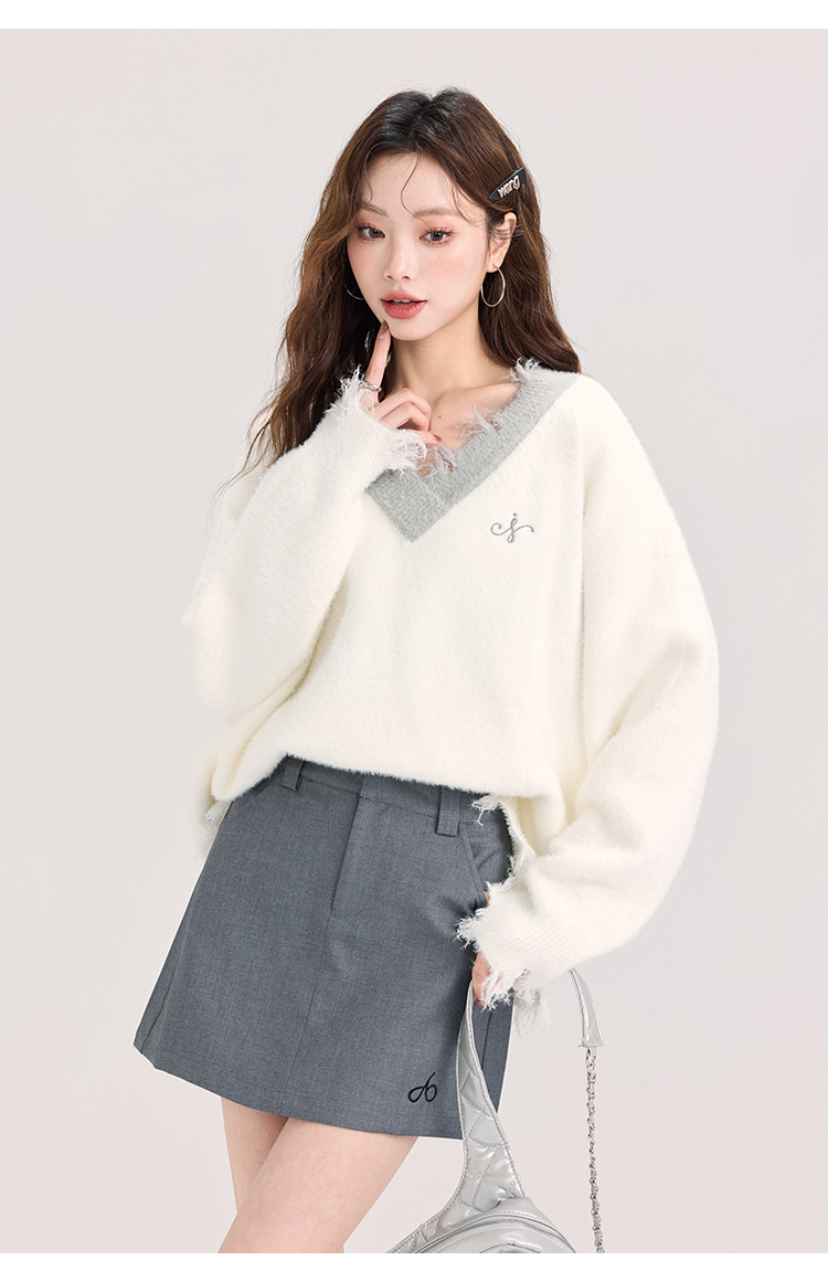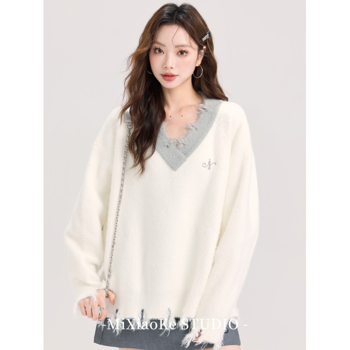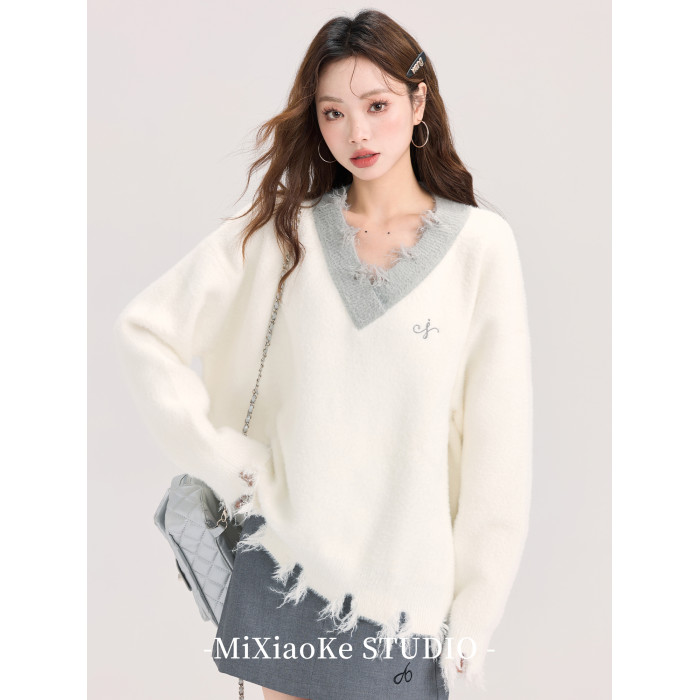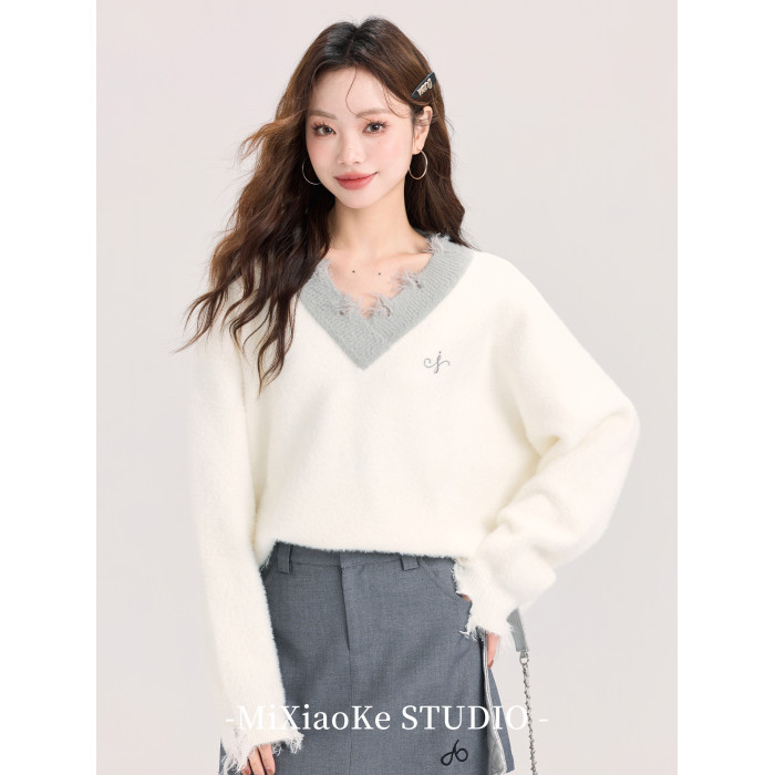 羋小可高級感V領白色毛衣女裝秋冬穿搭學院風內搭針織衫短款上衣