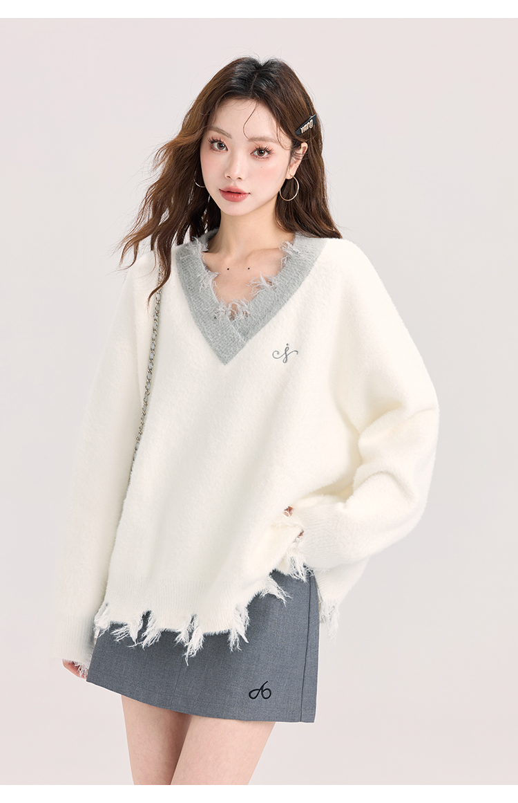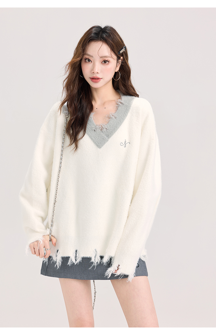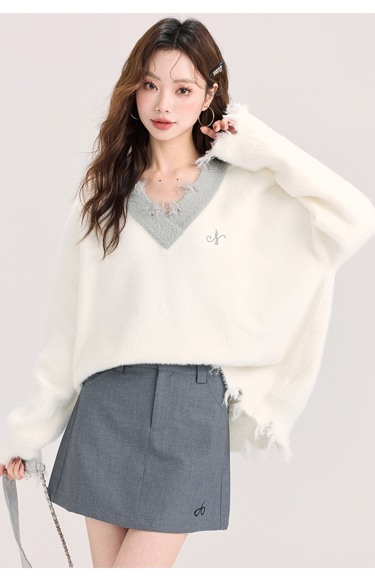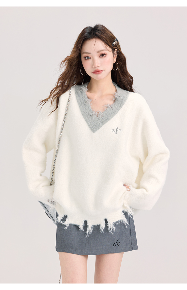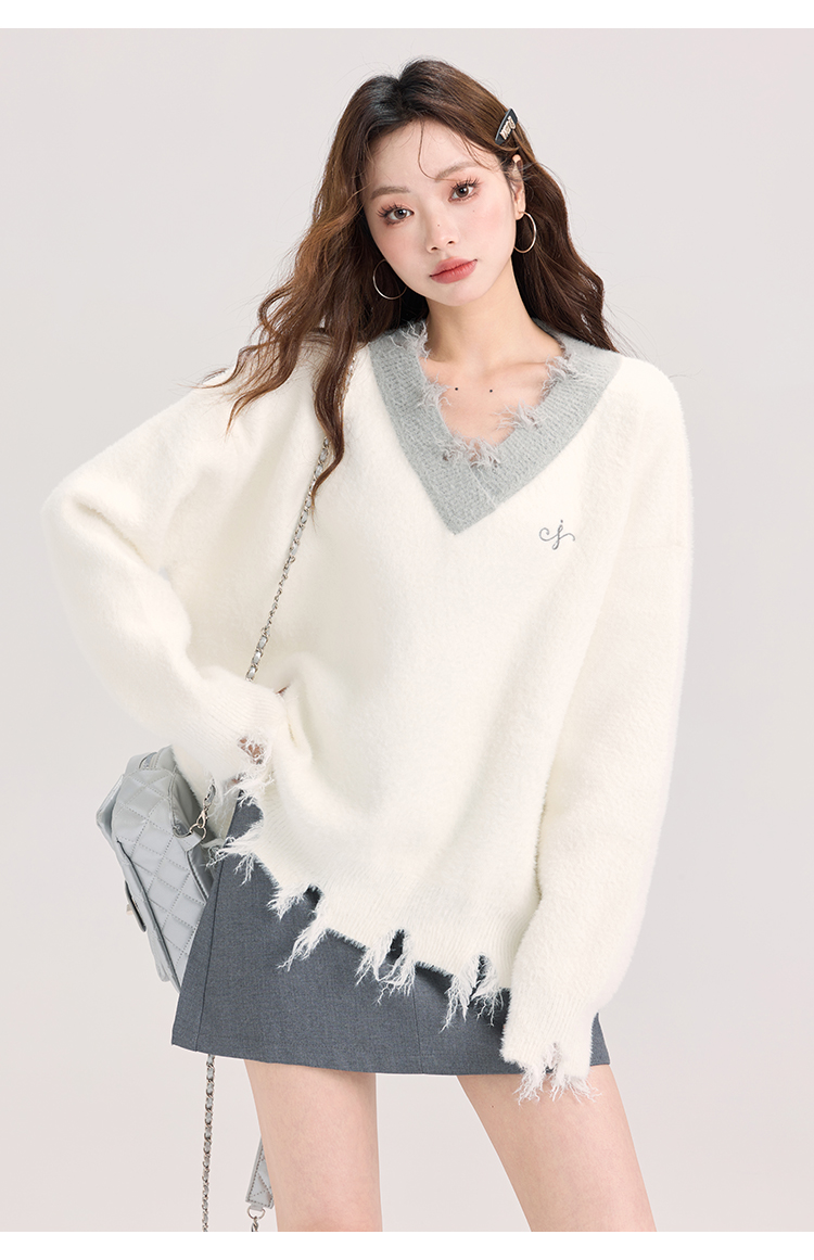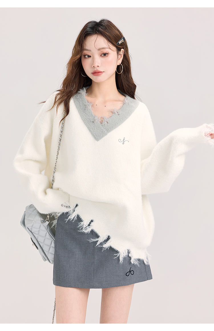 羋小可高級感V領白色毛衣女裝秋冬穿搭學院風內搭針織衫短款上衣