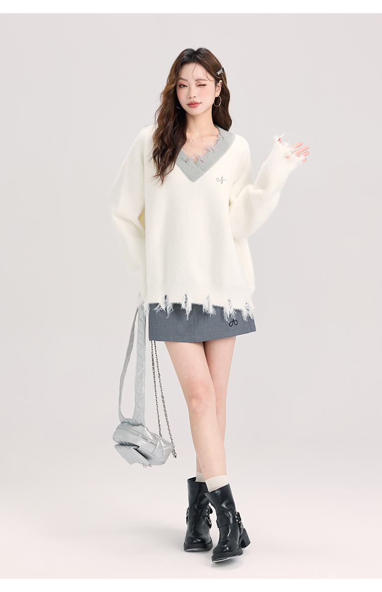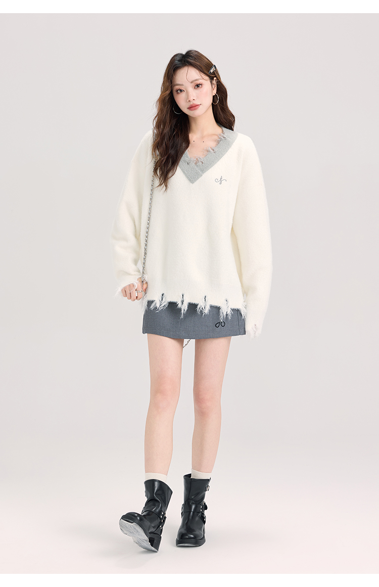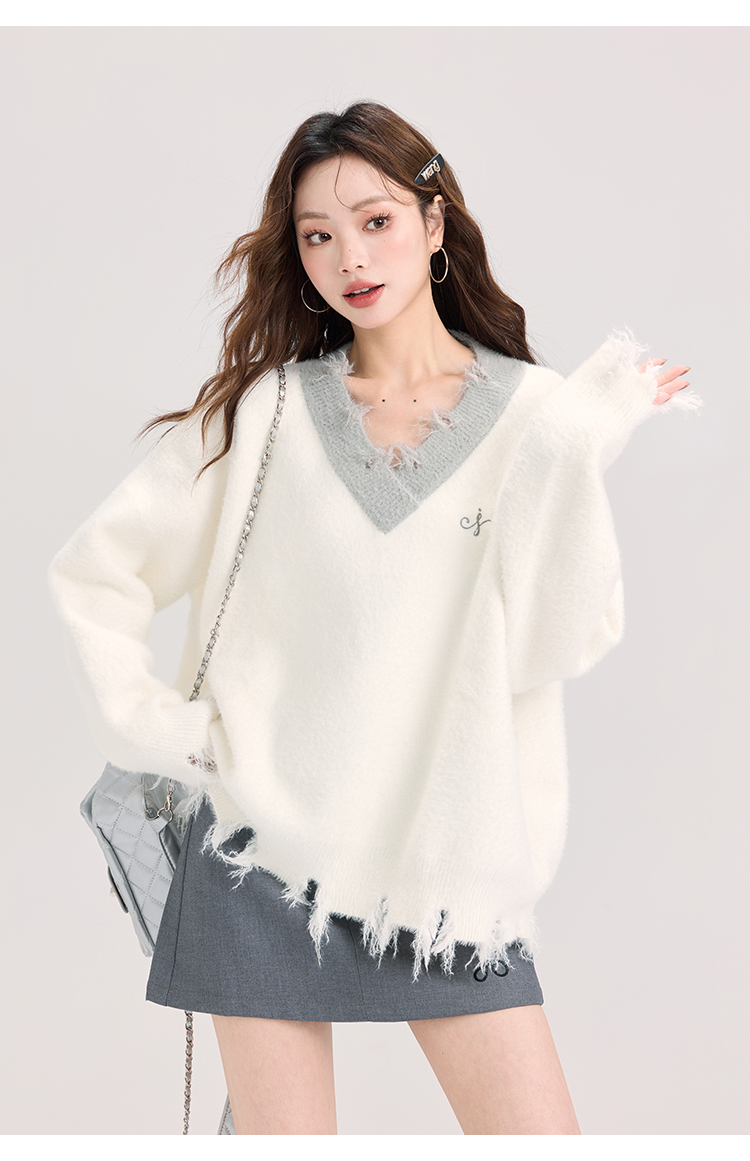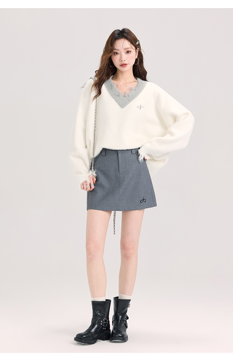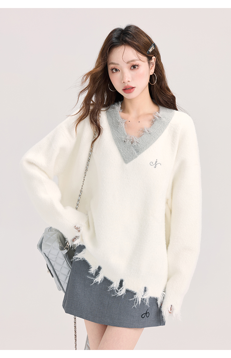 羋小可高級感V領白色毛衣女裝秋冬穿搭學院風內搭針織衫短款上衣