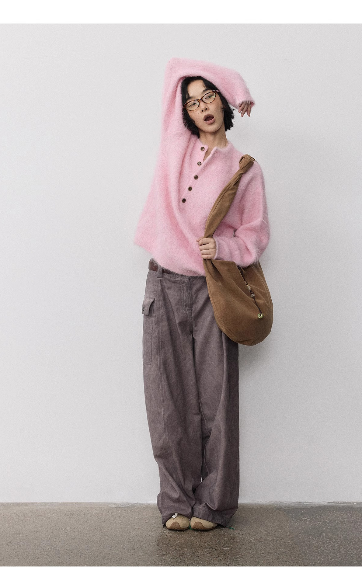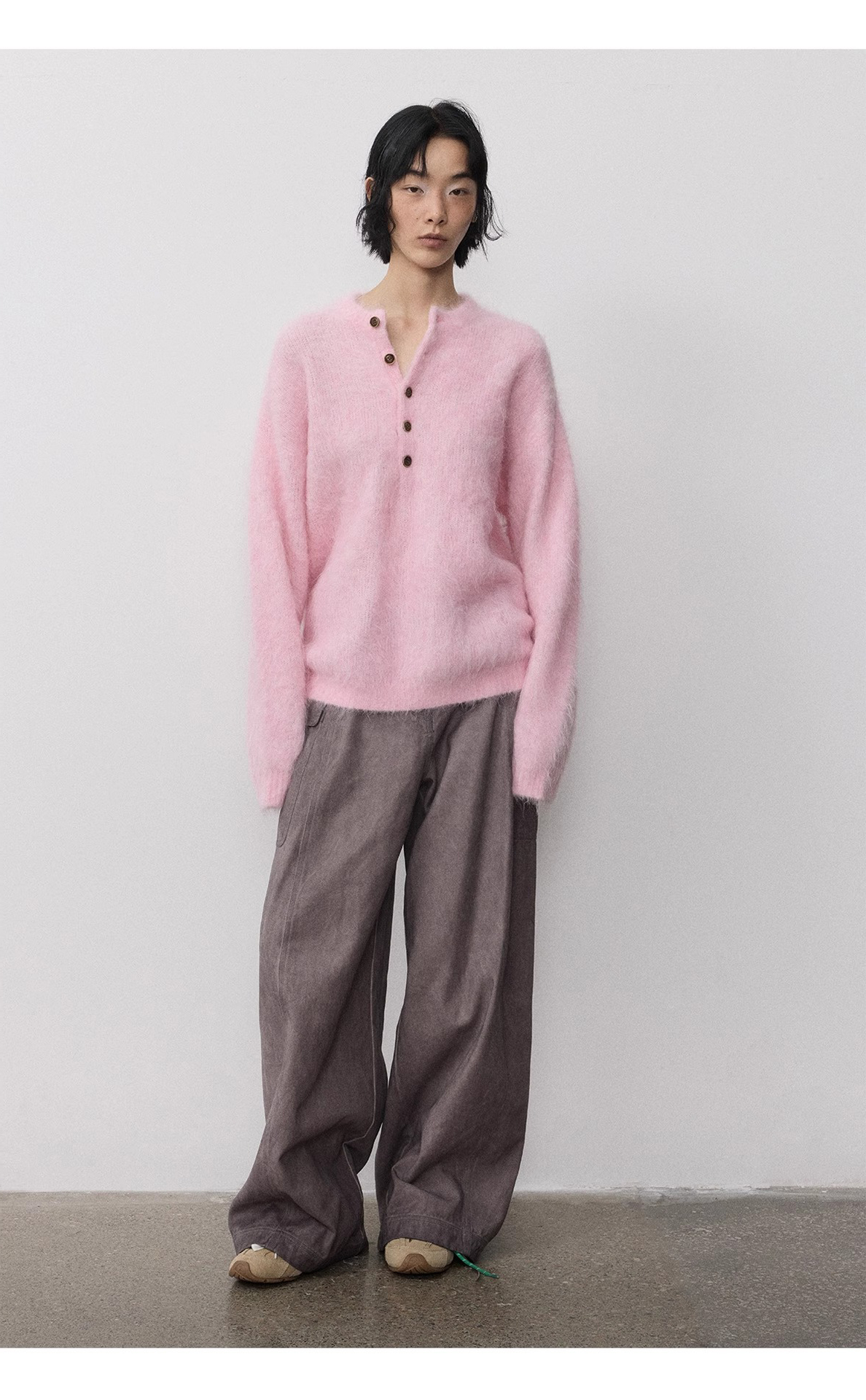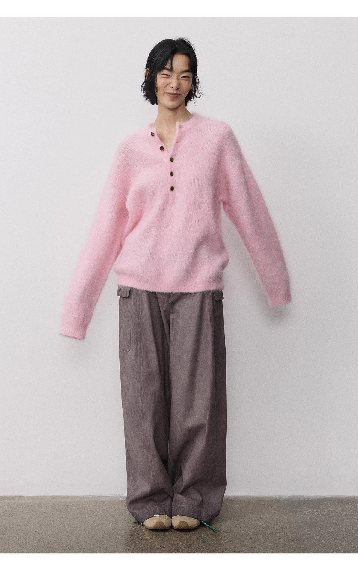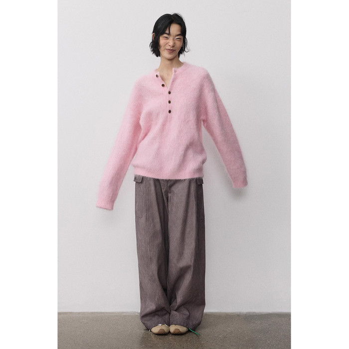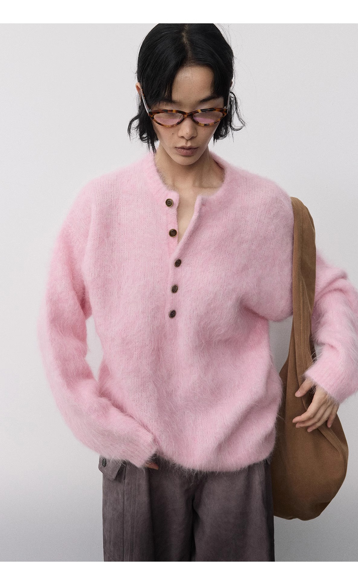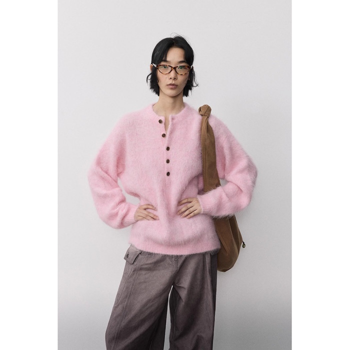 高級感粉色亨利領水貂絨毛衣女外穿針織衫上衣女新款慵懶風套頭