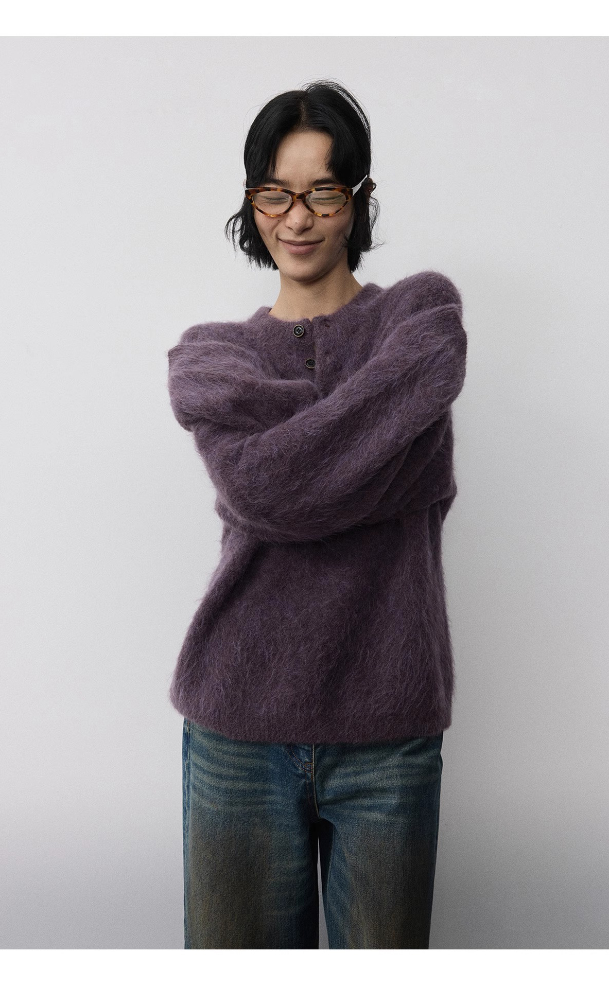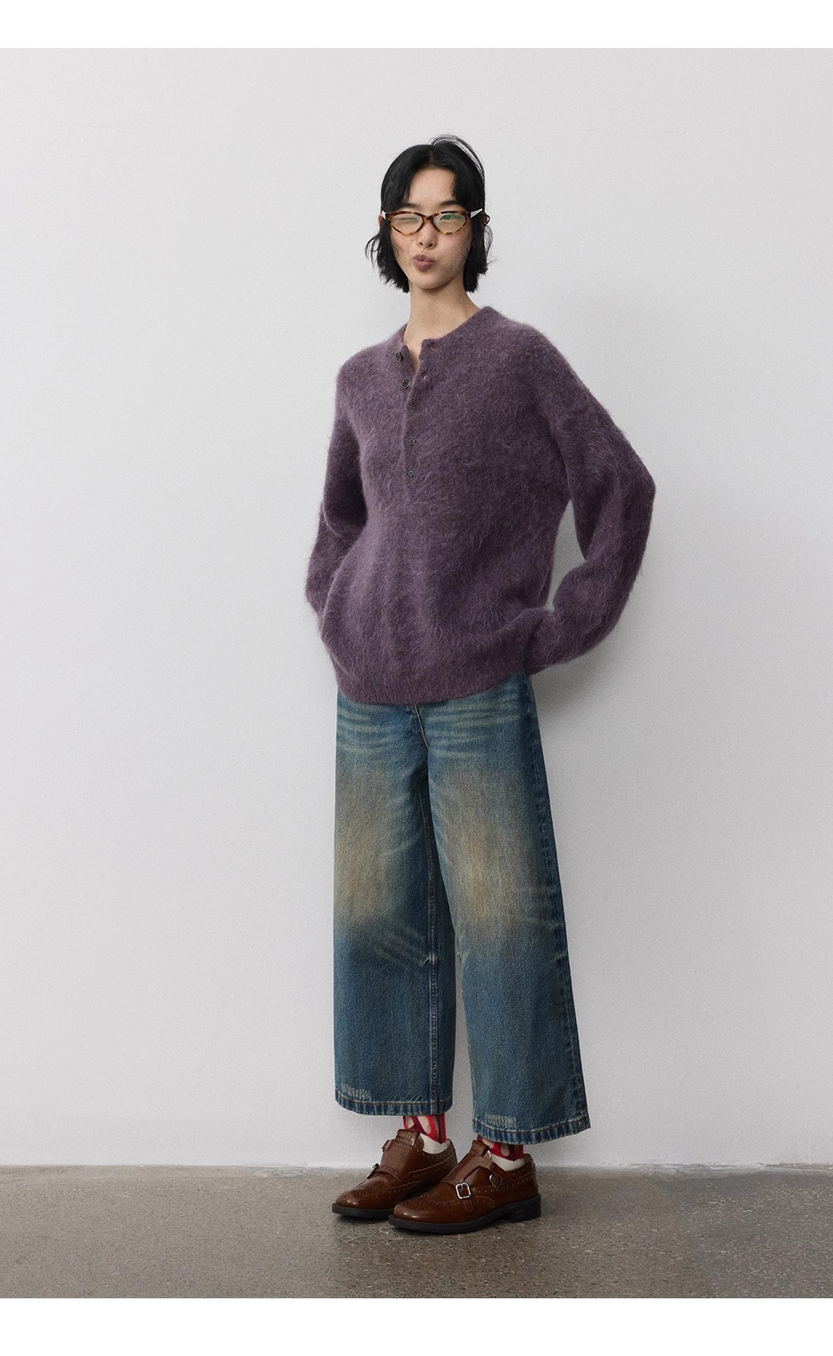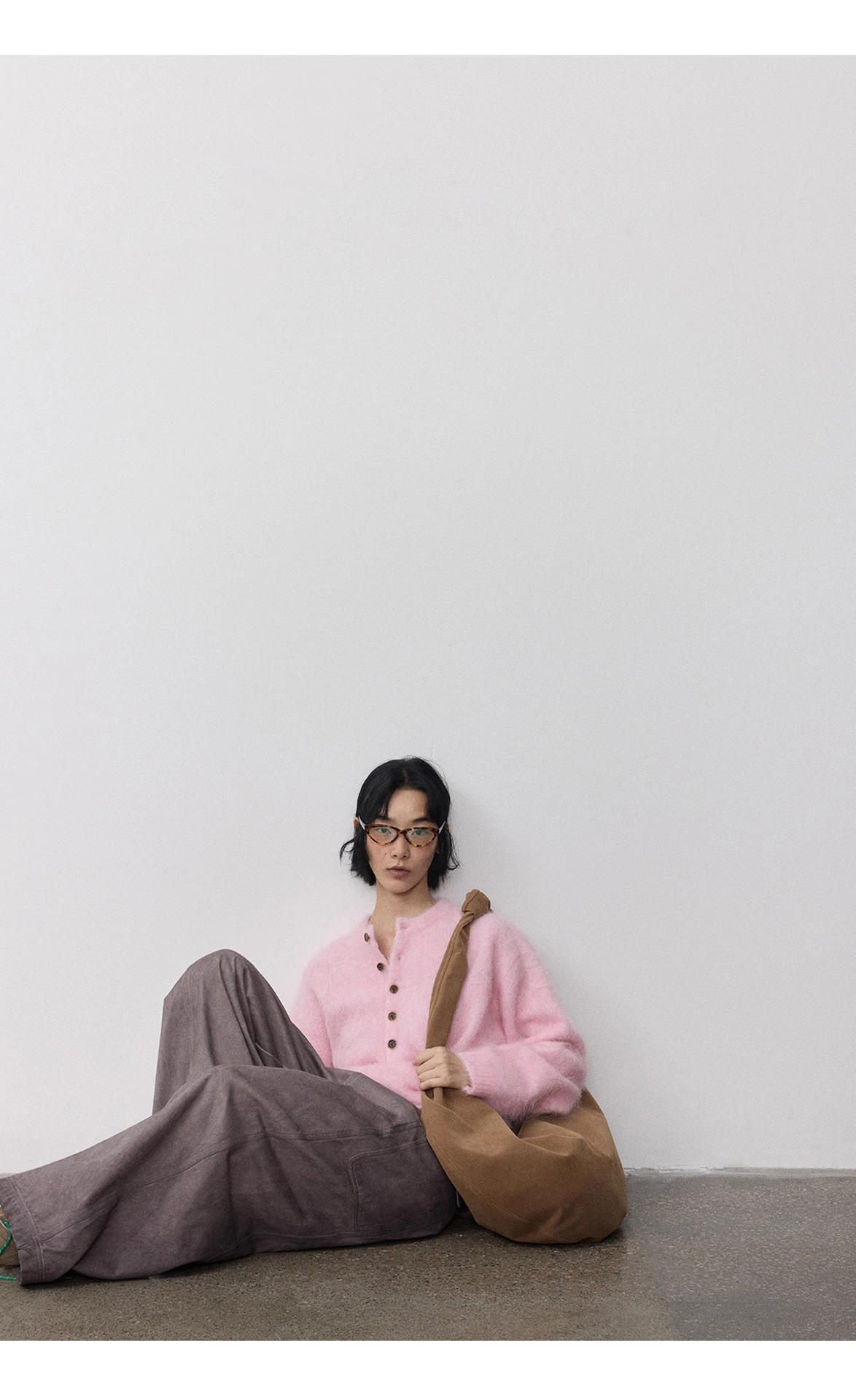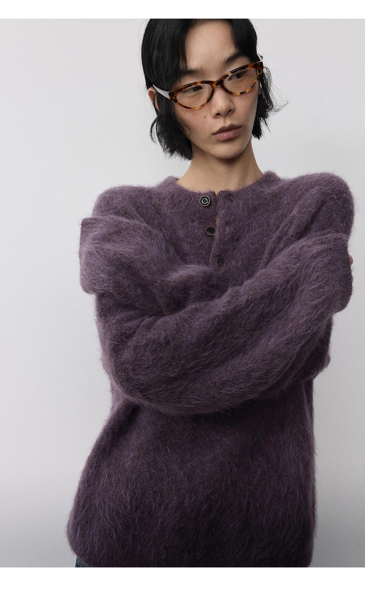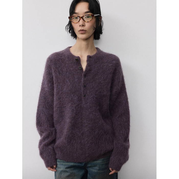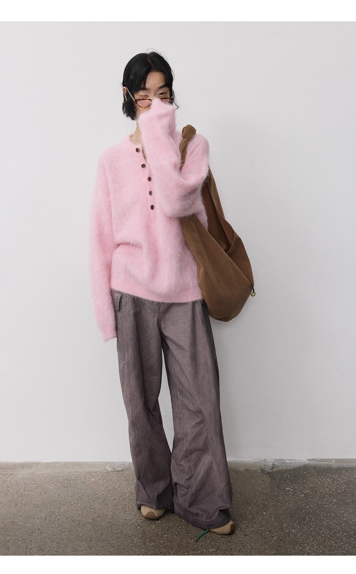 高級感粉色亨利領水貂絨毛衣女外穿針織衫上衣女新款慵懶風套頭