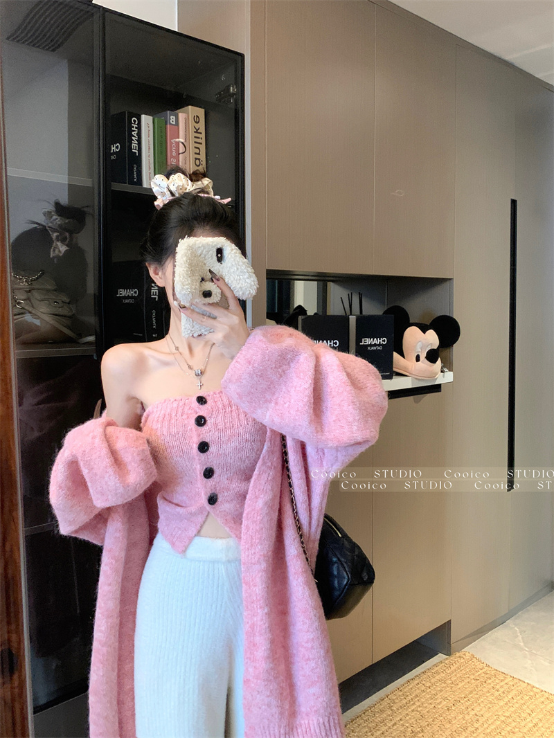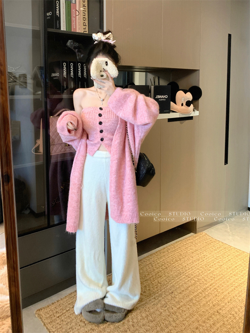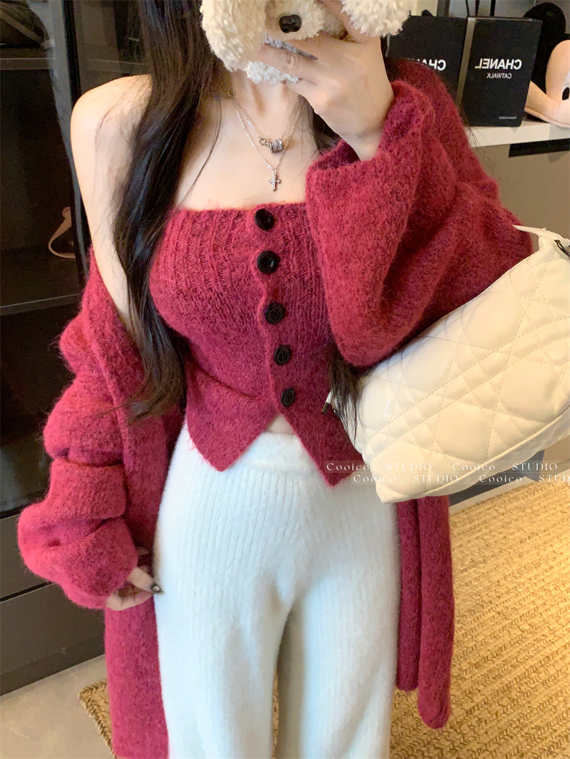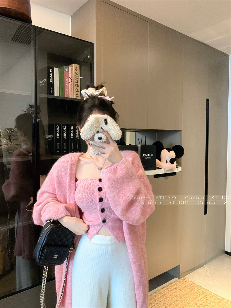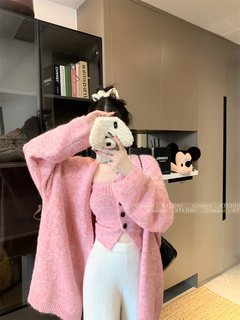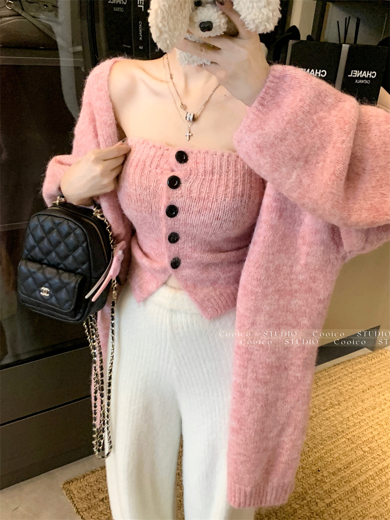 韓系慵懶風毛衣外套女秋季抹胸背心兩件套超好看寬松針織開衫上衣