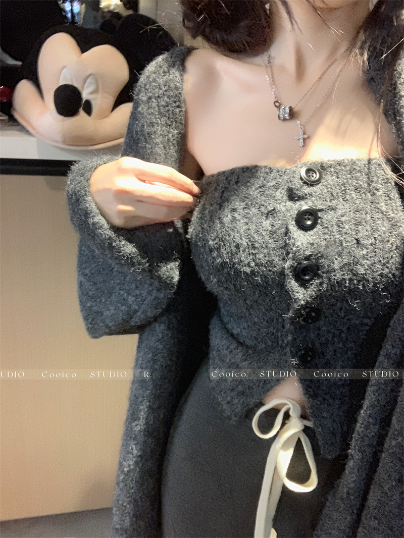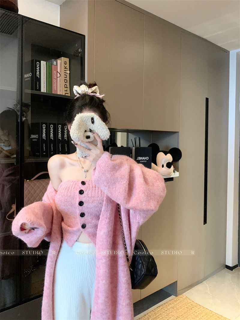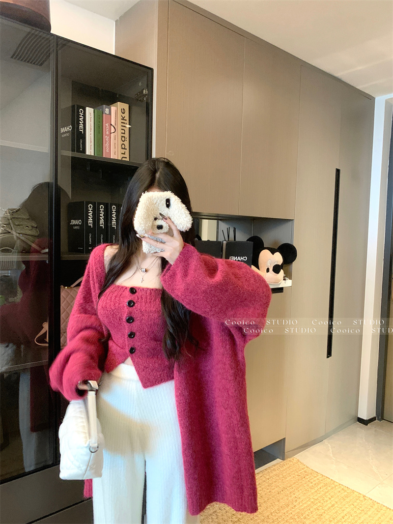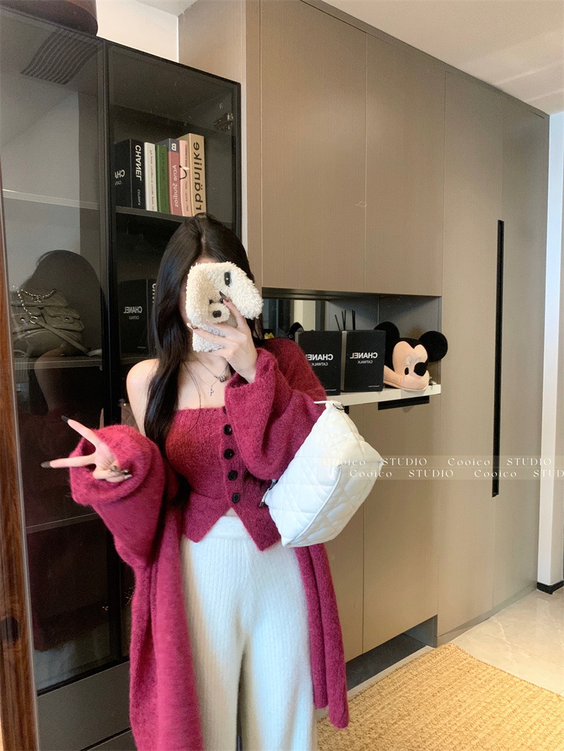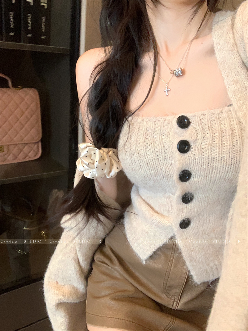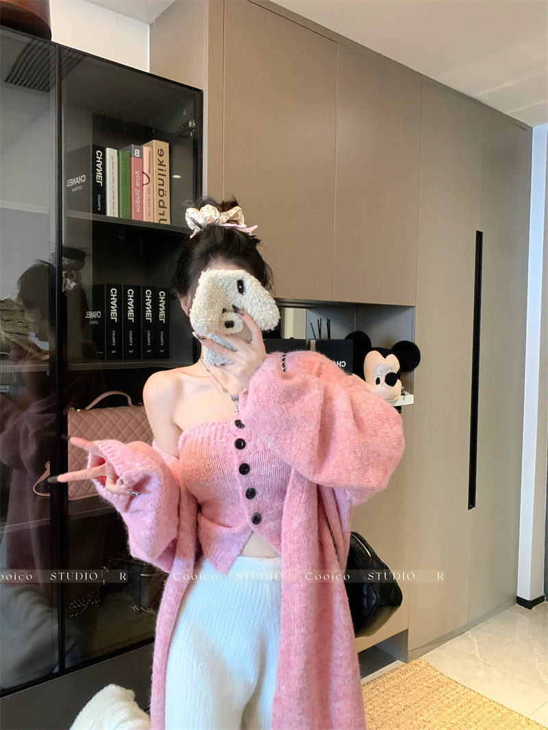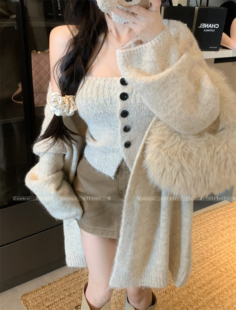 韓系慵懶風毛衣外套女秋季抹胸背心兩件套超好看寬松針織開衫上衣