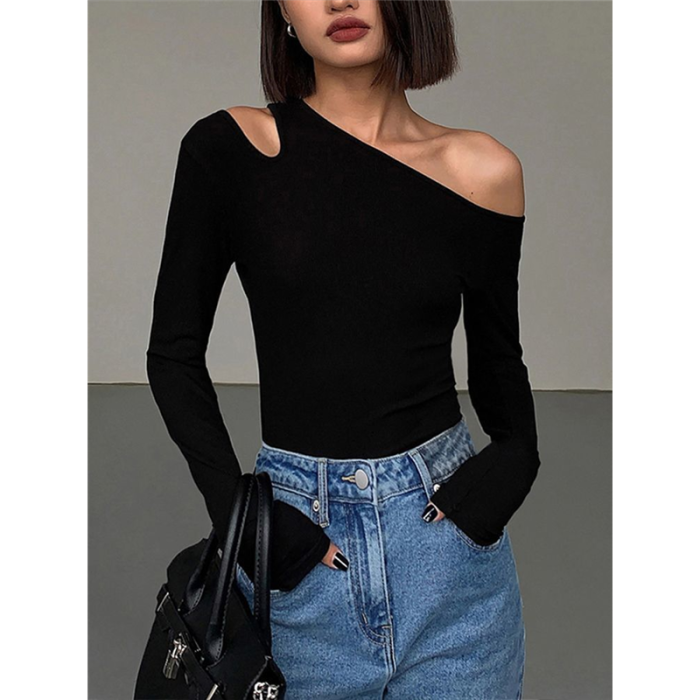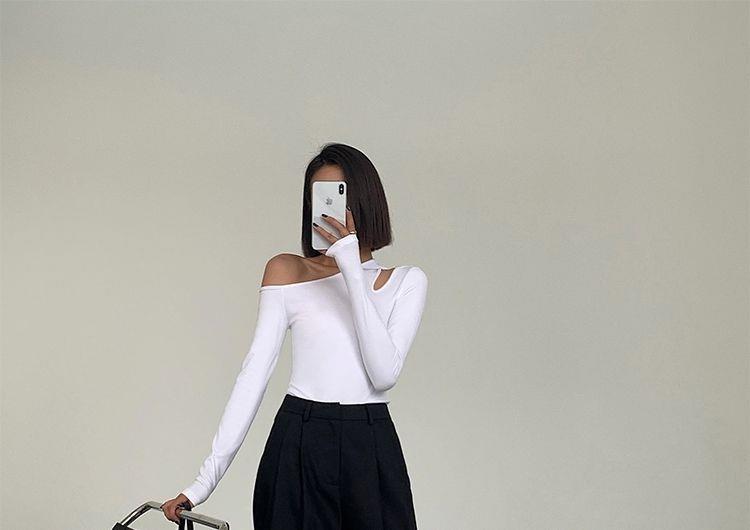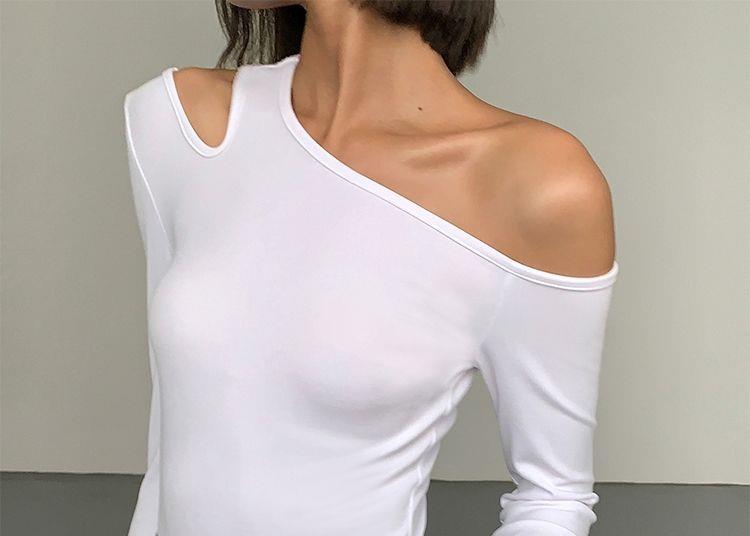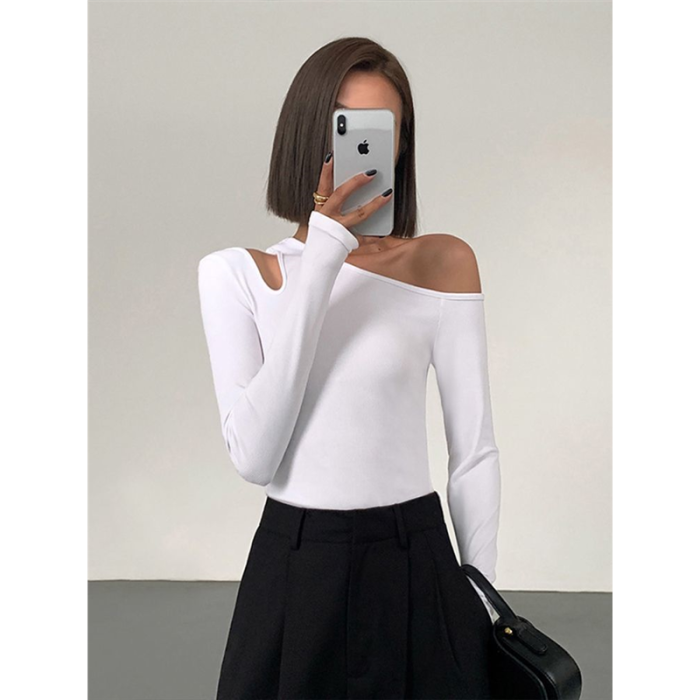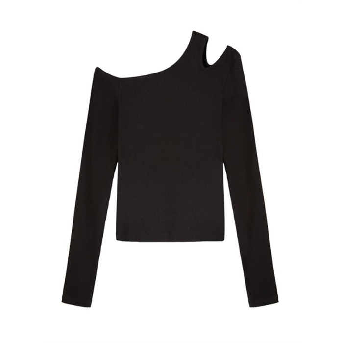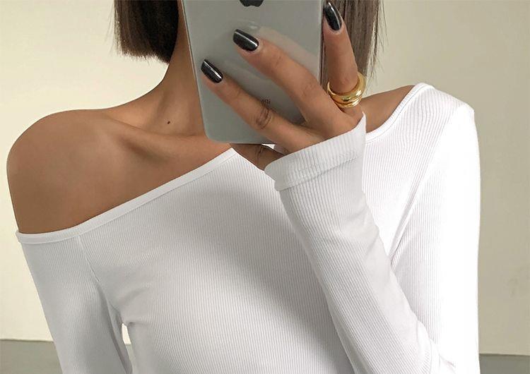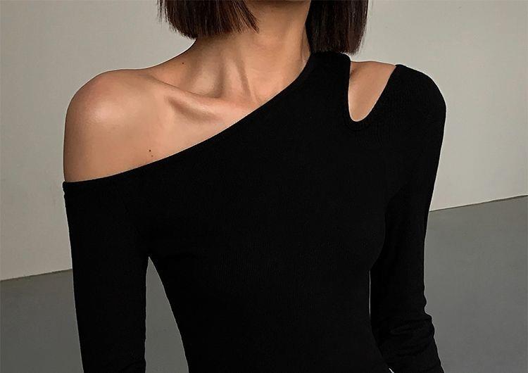 黑色斜肩打底衫女秋冬季長袖修身內搭性感露肩鎖骨挖肩設計款上衣