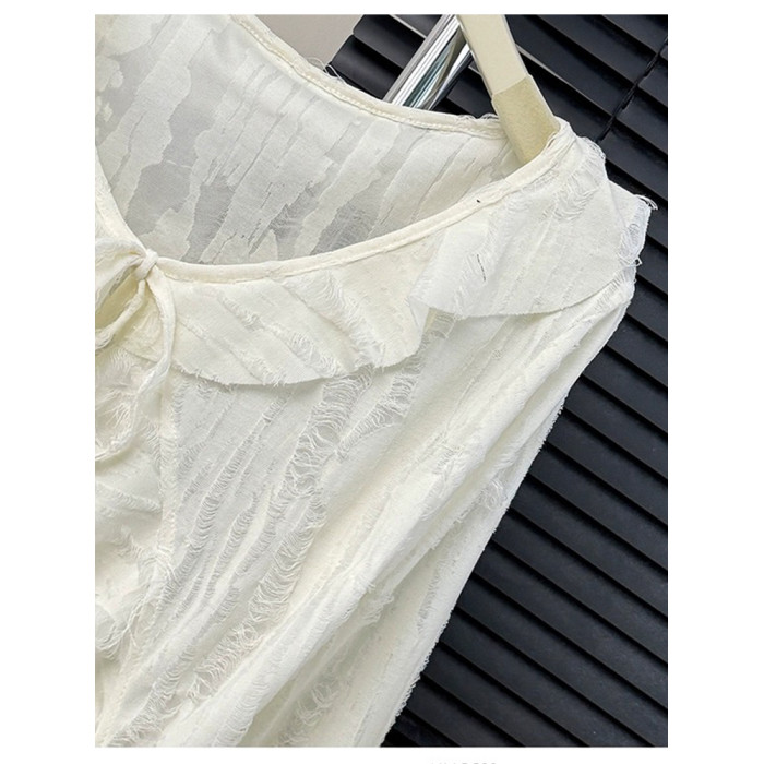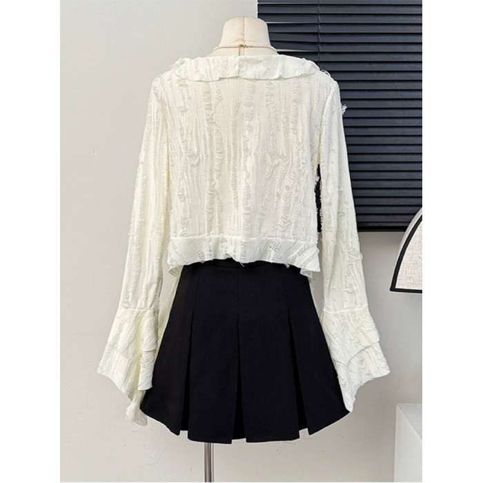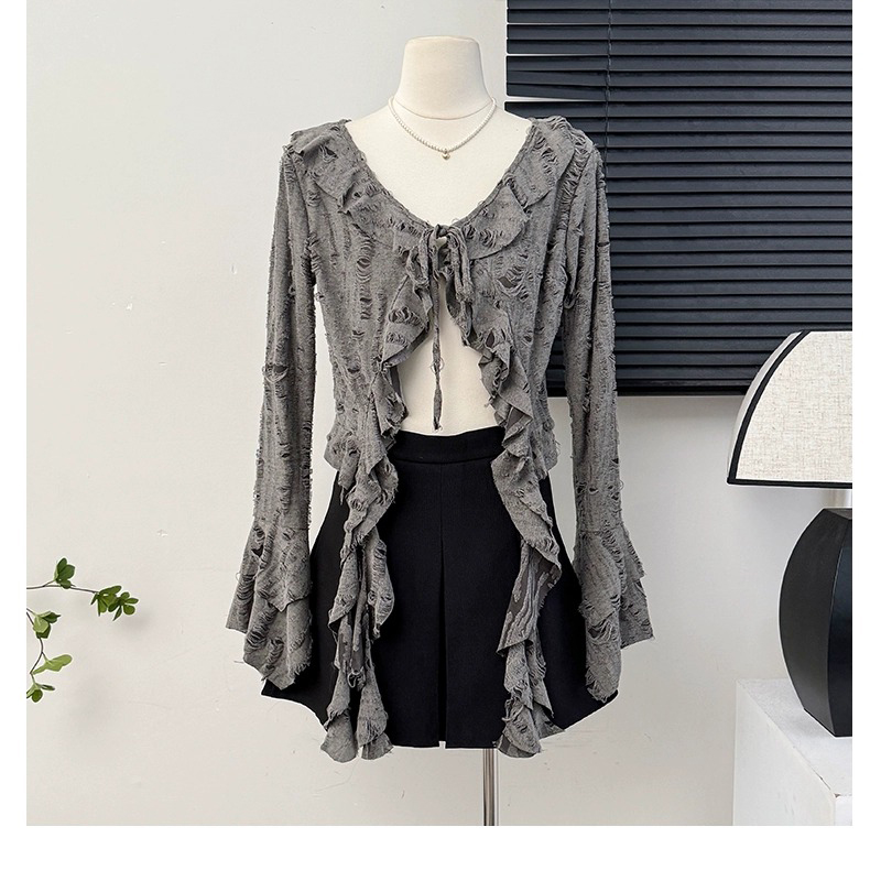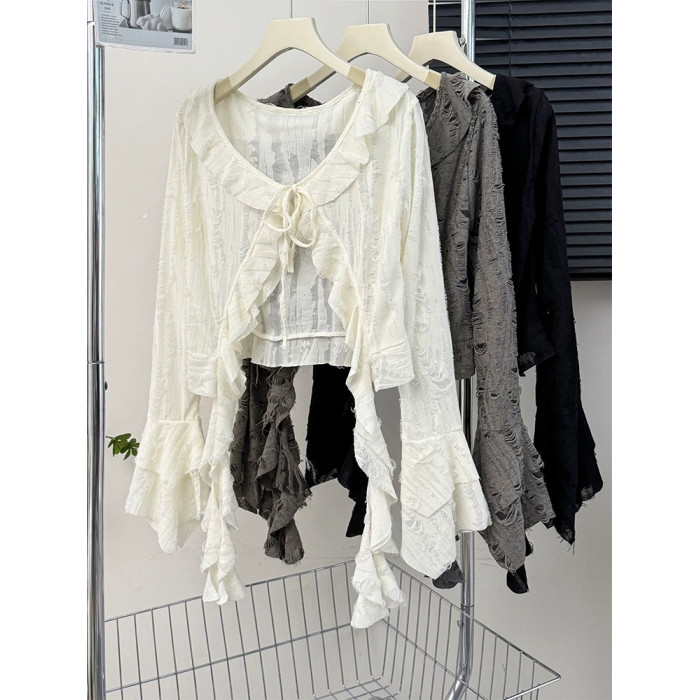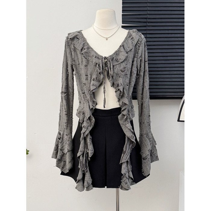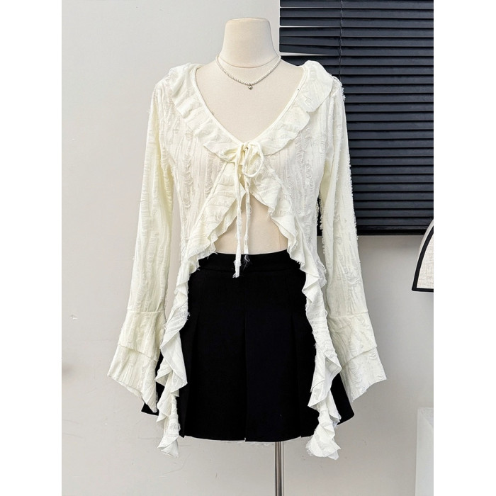 甜辣妹系帶不規則荷葉邊長袖罩衫女春秋新款設計感別致小衆上衣服