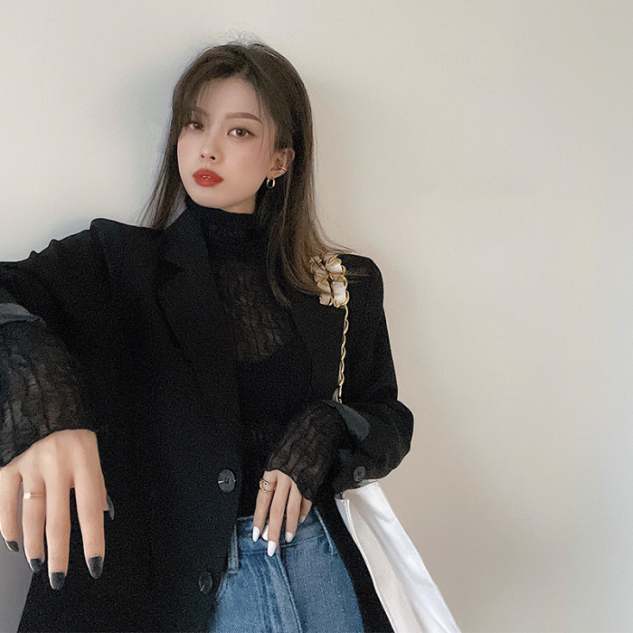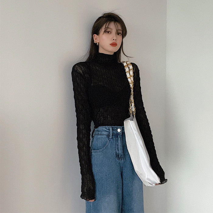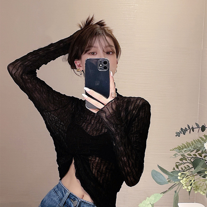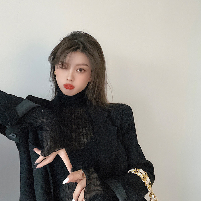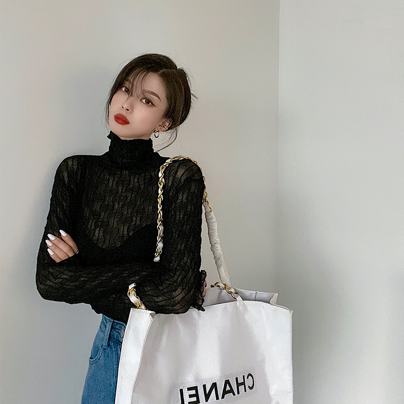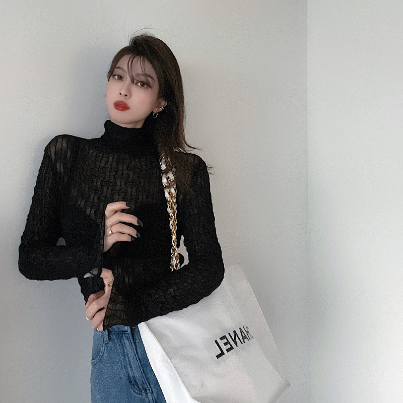 大碼胖妹妹高領網紗內搭打底衫女春秋冬新款加絨蕾絲性感長袖上衣
