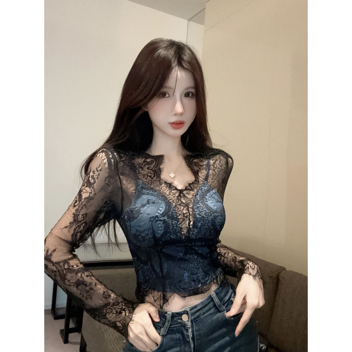 純欲辣妹鏤空透視上衣女秋冬名媛帶胸墊蕾絲打底衫內搭高級感小衫