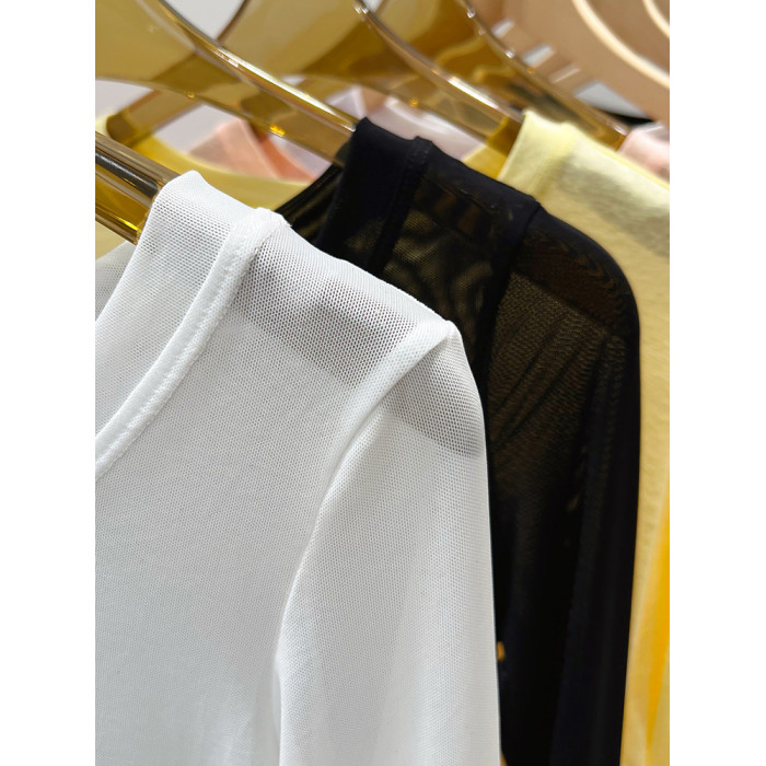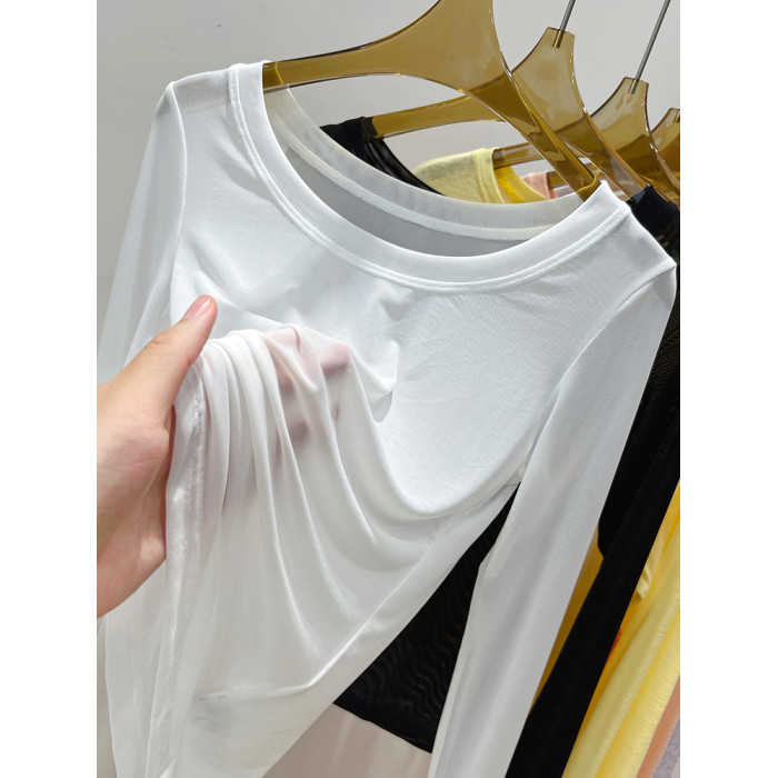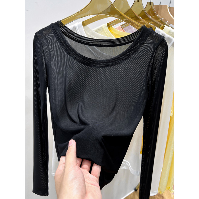 黑色網紗打底衫女春秋長袖t恤低領透明紗衣薄內搭蕾絲上衣高級感