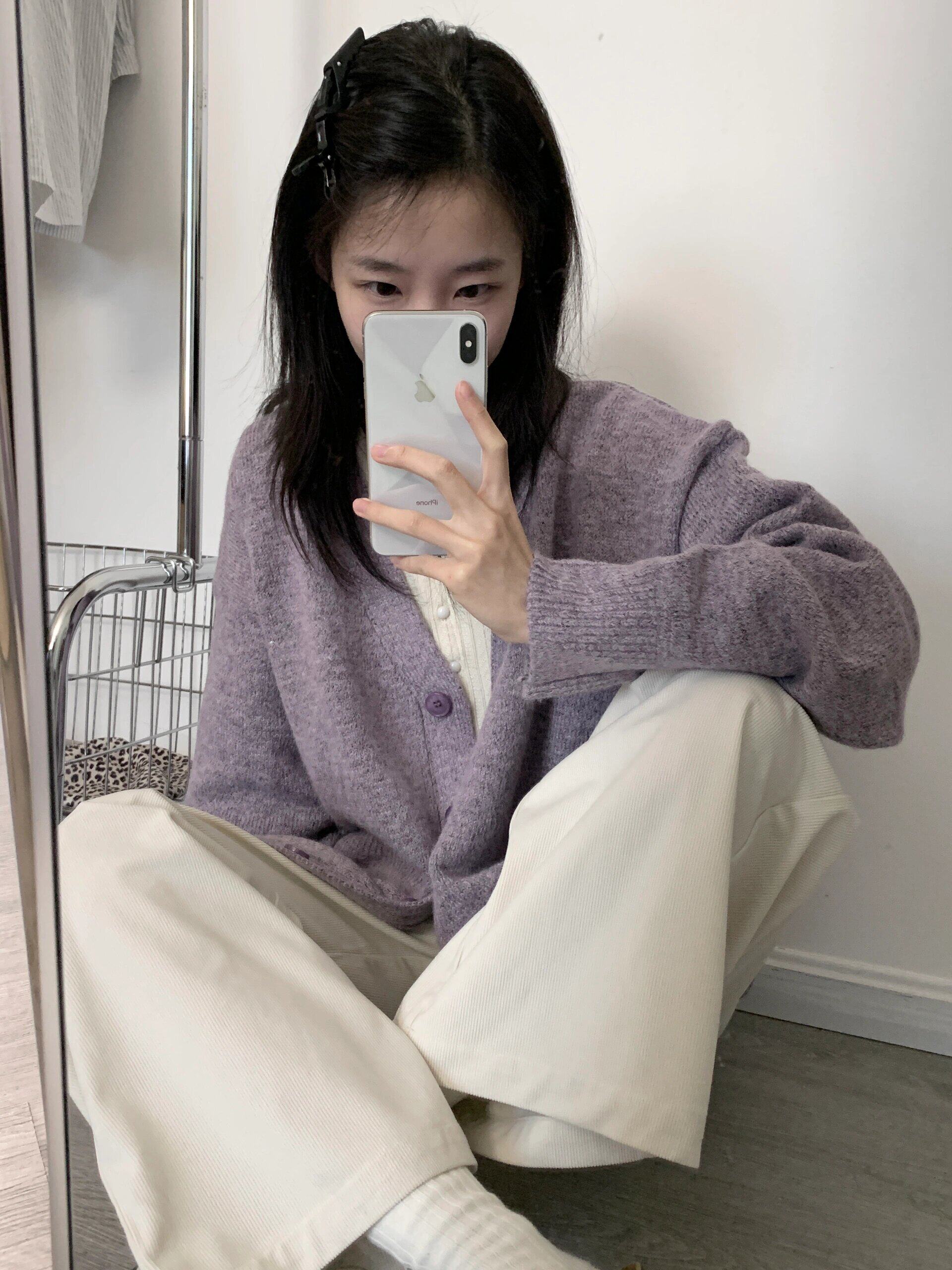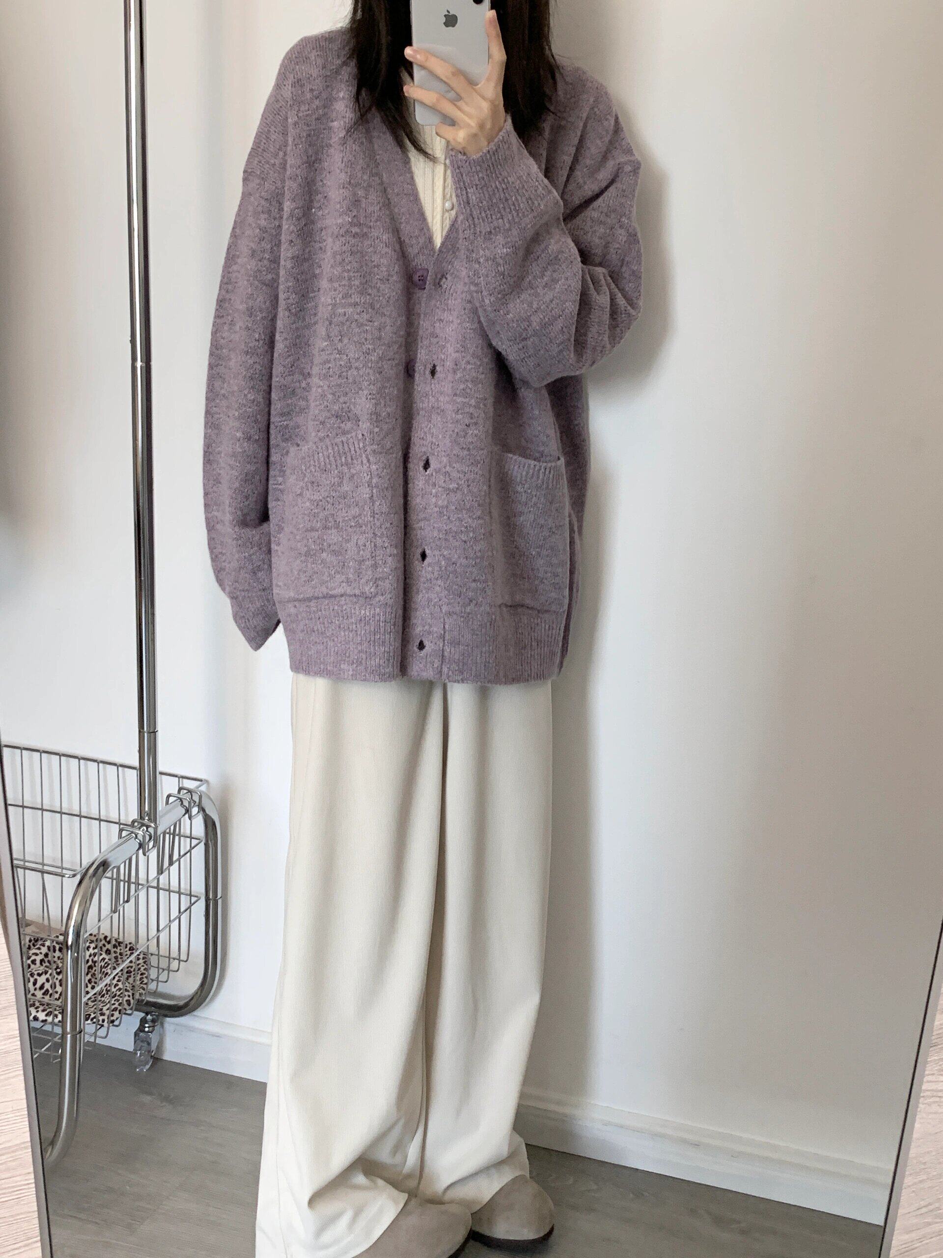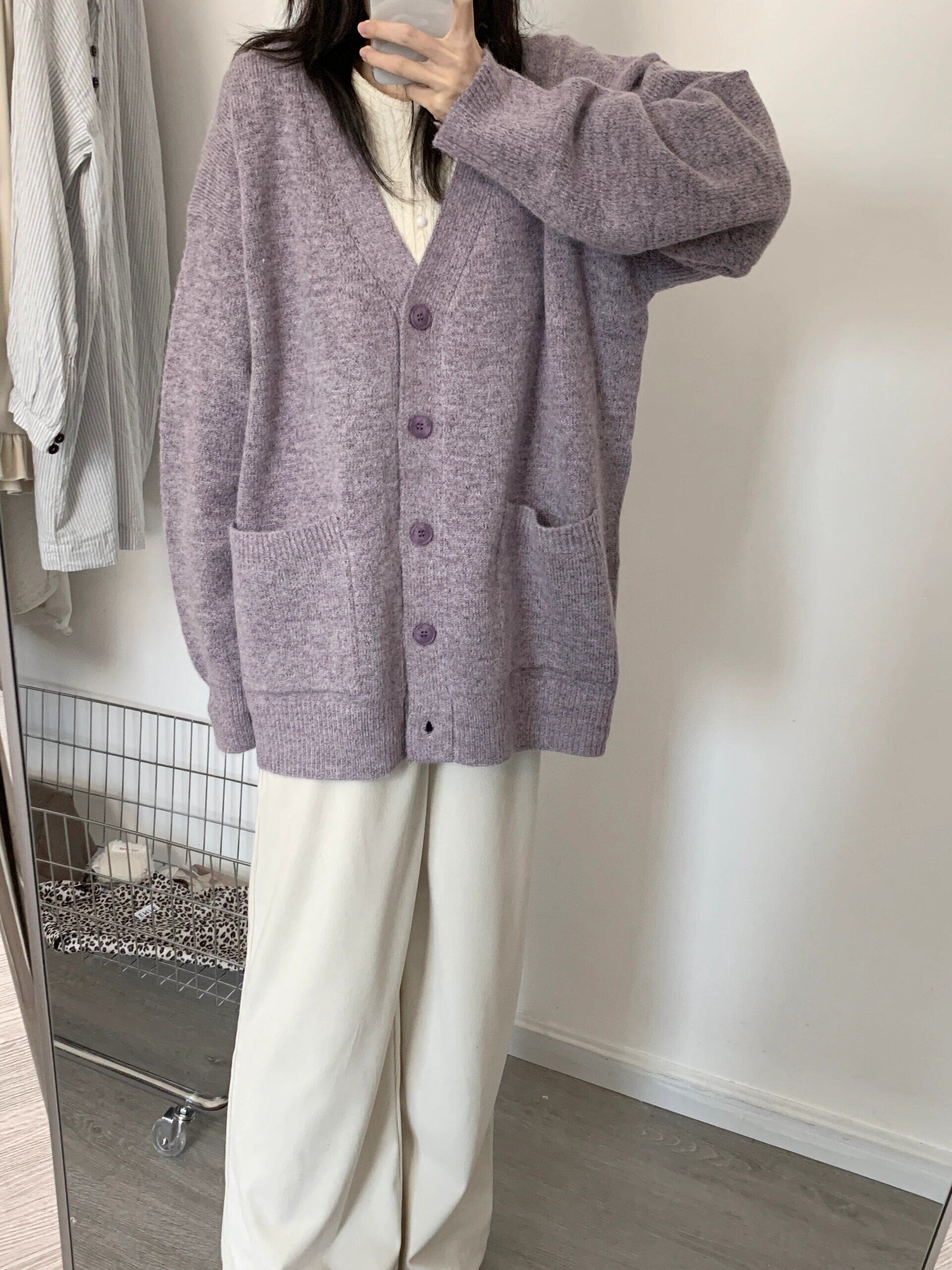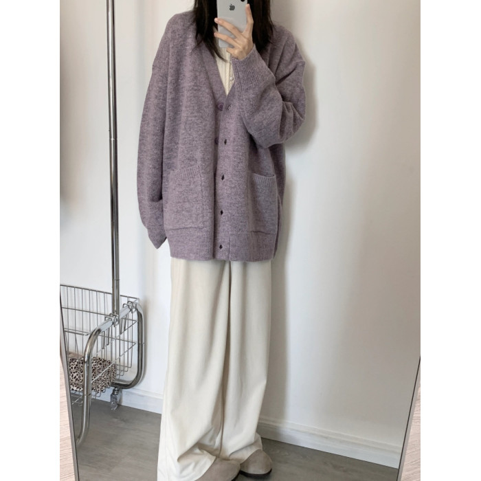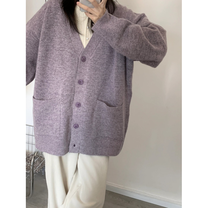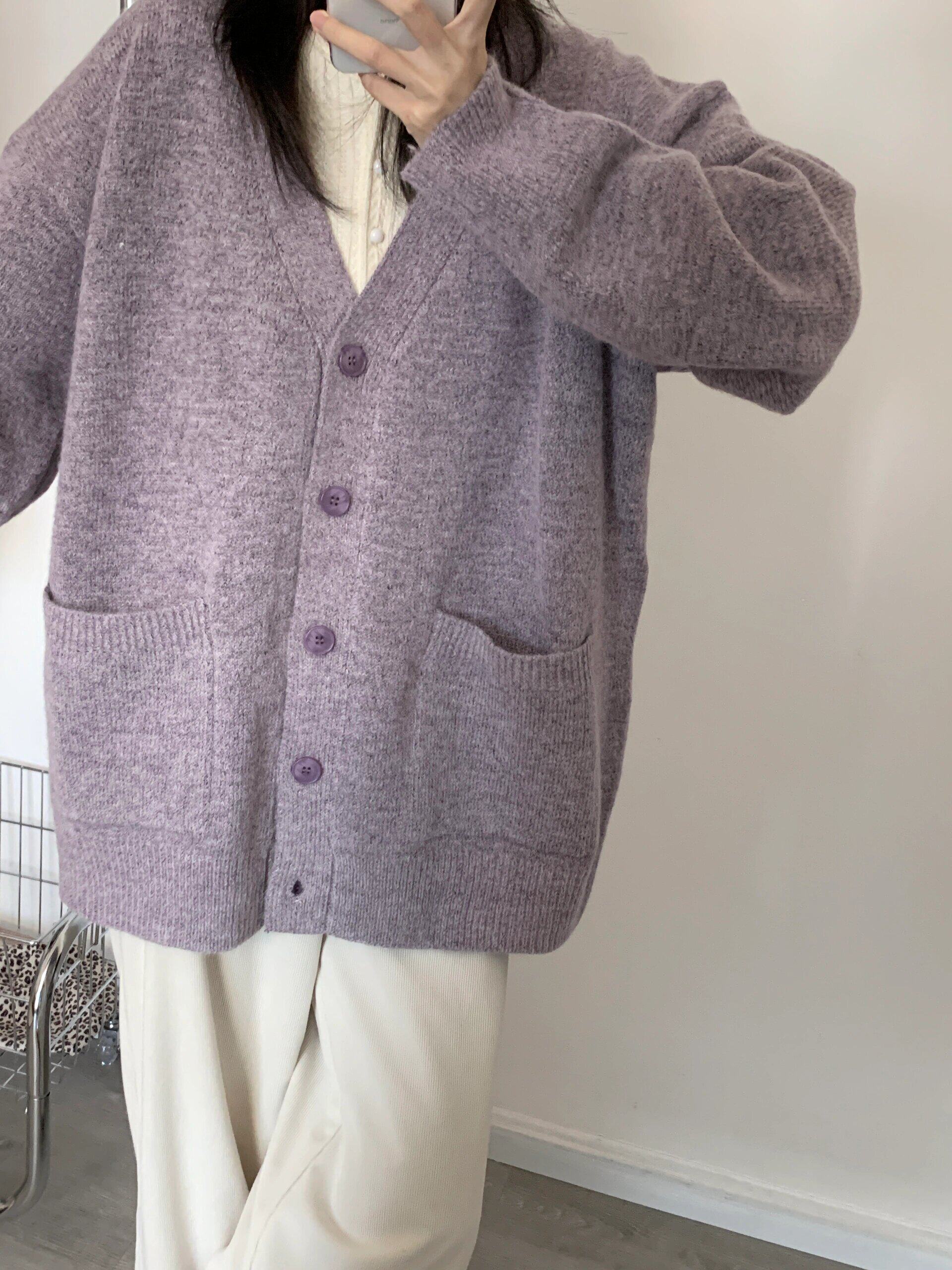 寬松慵懶風紫色毛衣外套女春秋季2025新款V領針織開衫高級感上衣
