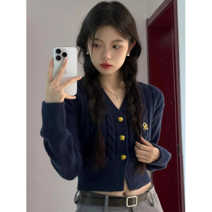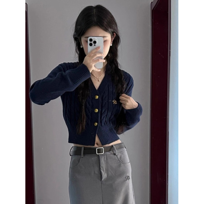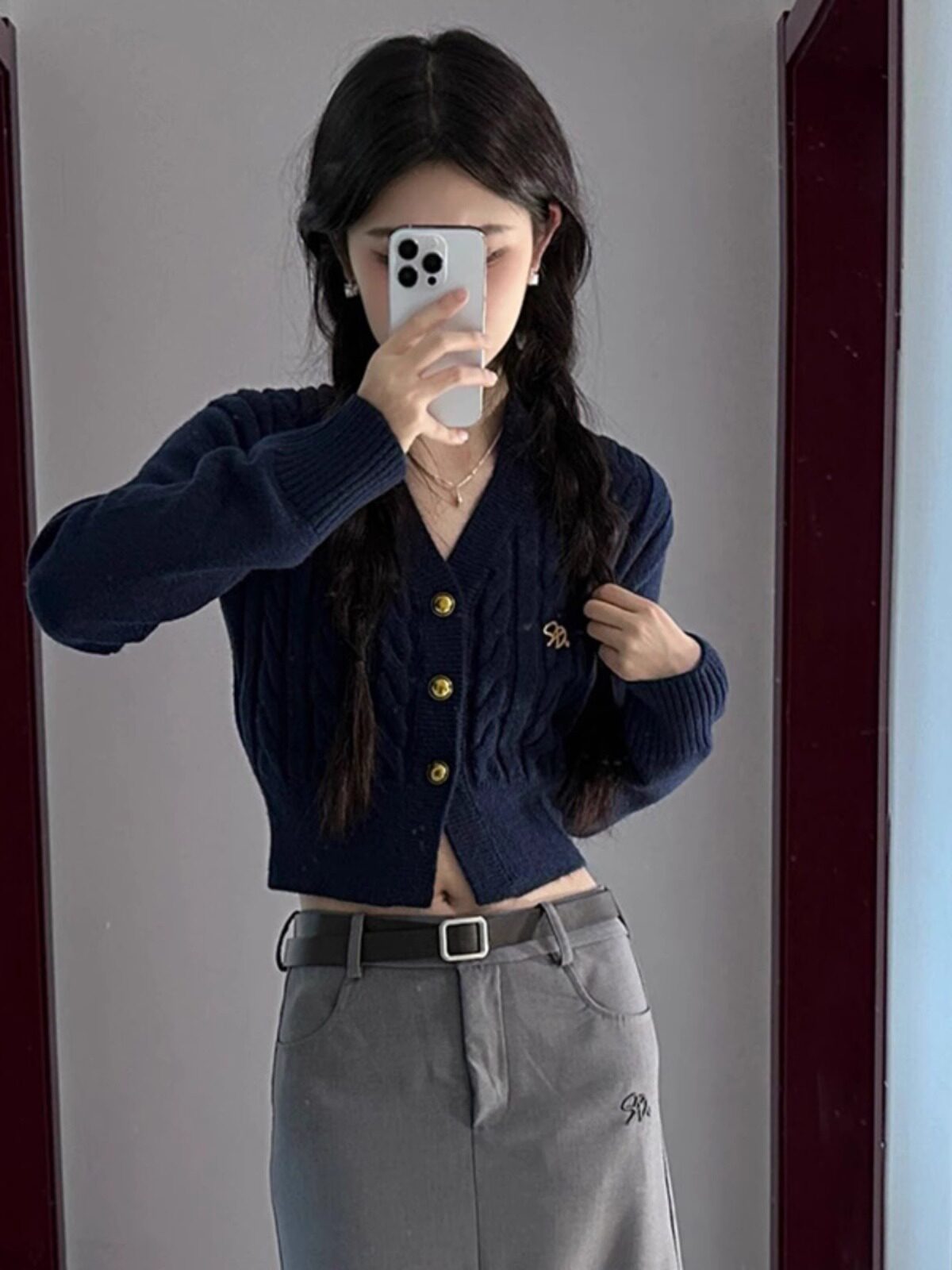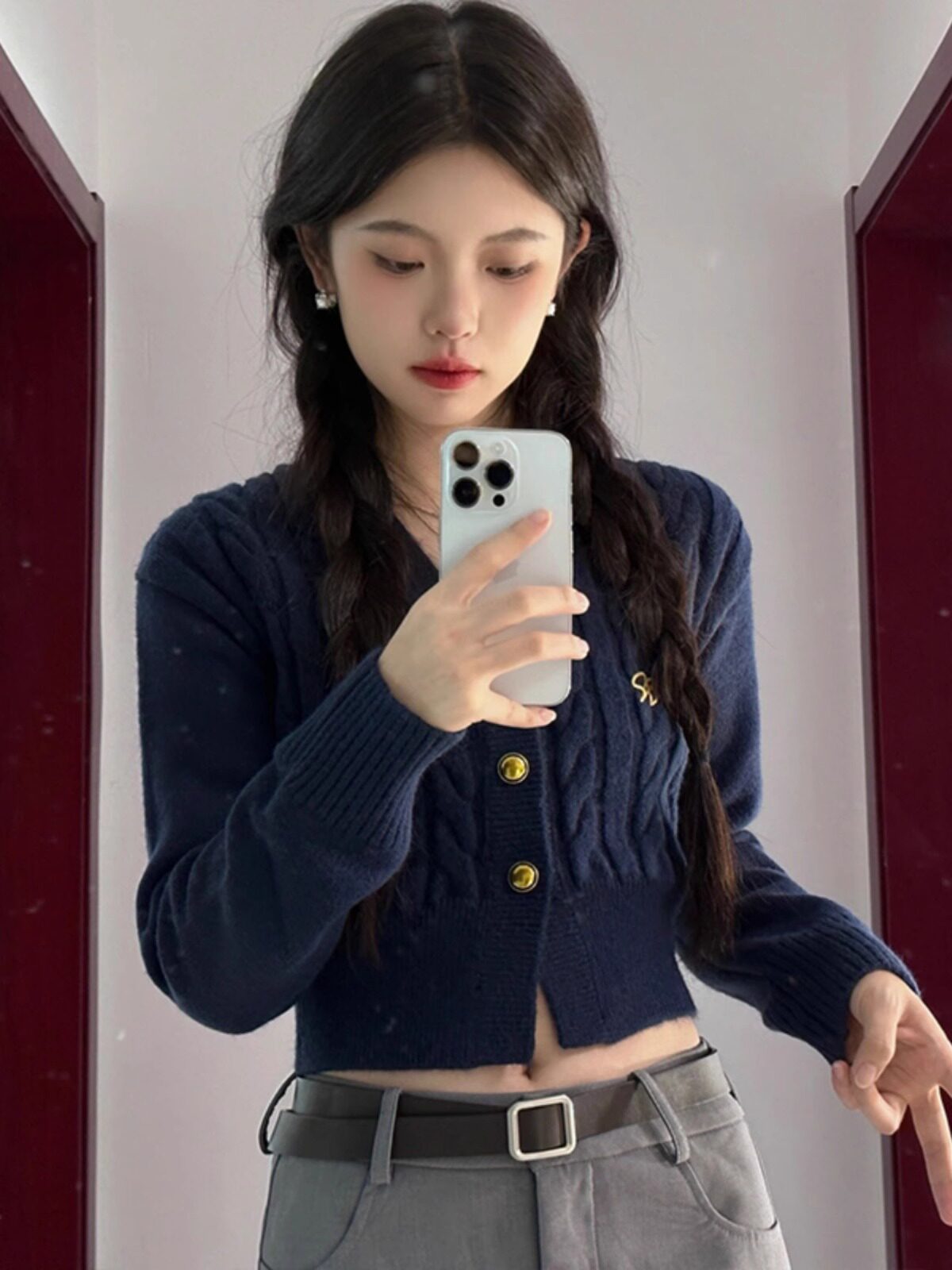 學院風麻花針織開衫女春秋高級感修身小個子短款內搭辣妹毛衣外套