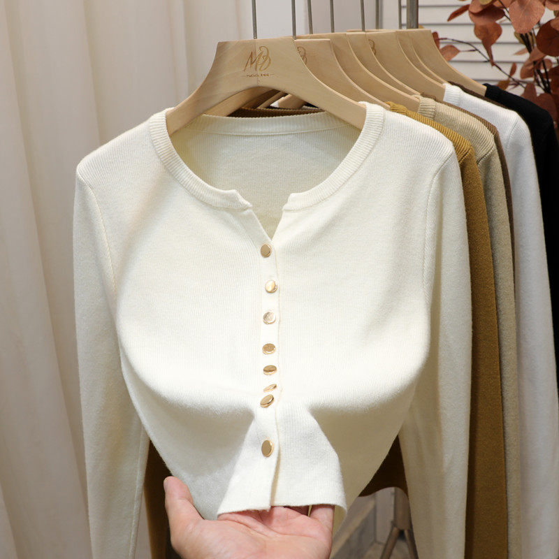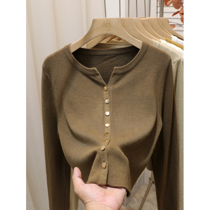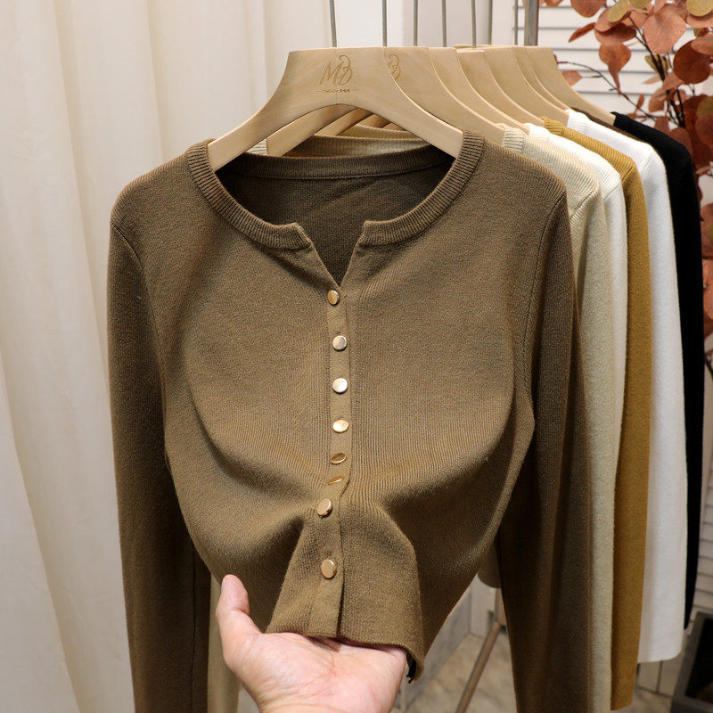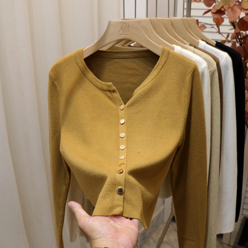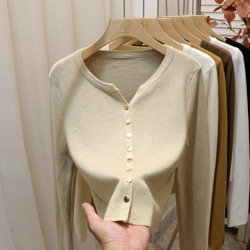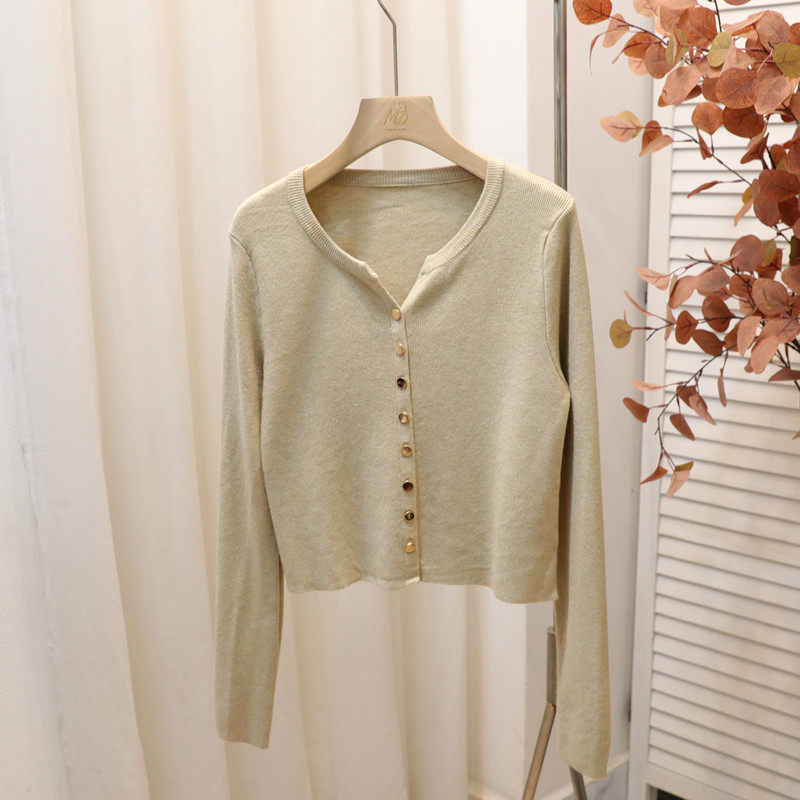 韓系溫柔風格純色金屬釦簡約短款針織長袖開衫v領毛衣女秋冬上衣