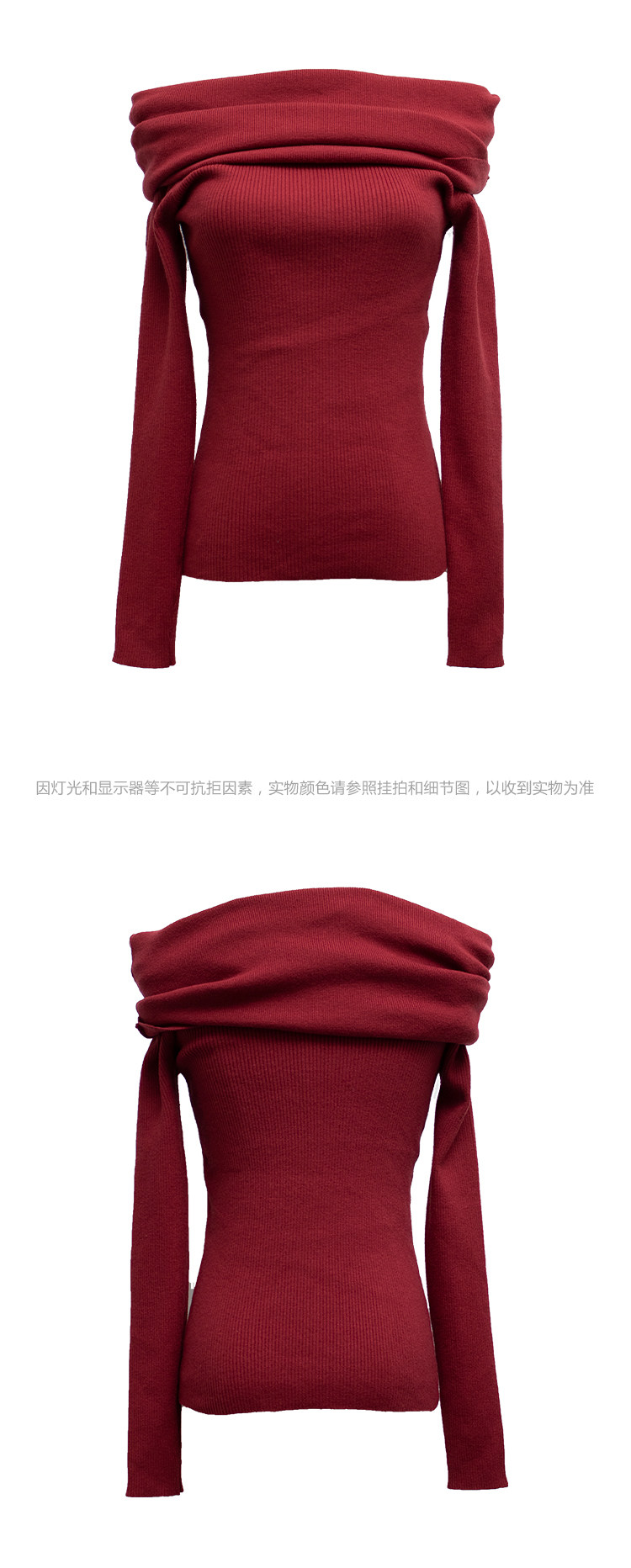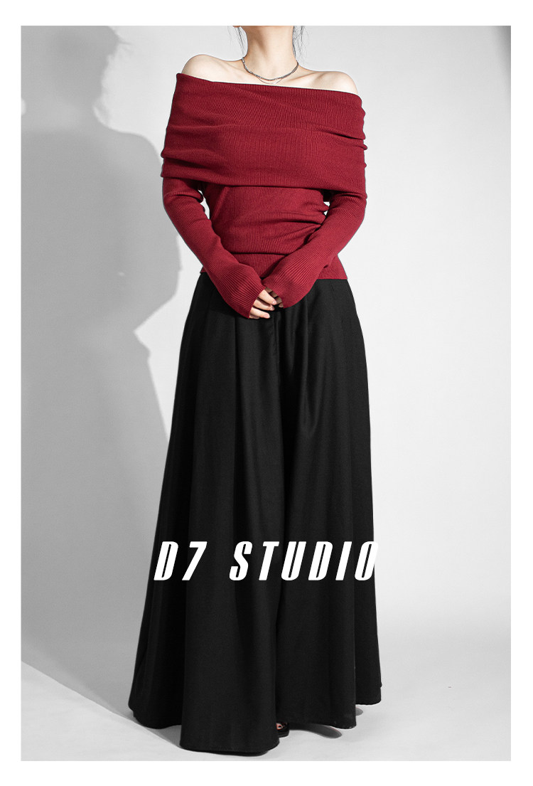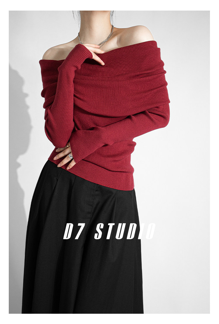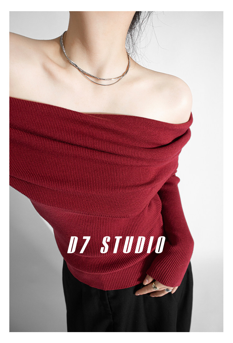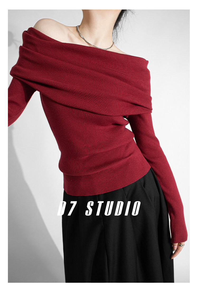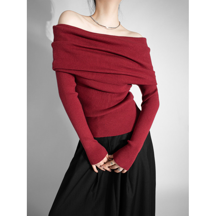 性感一字肩大翻領軟糯針織衫法式溫柔修身長袖酒紅色絕美毛衣春秋