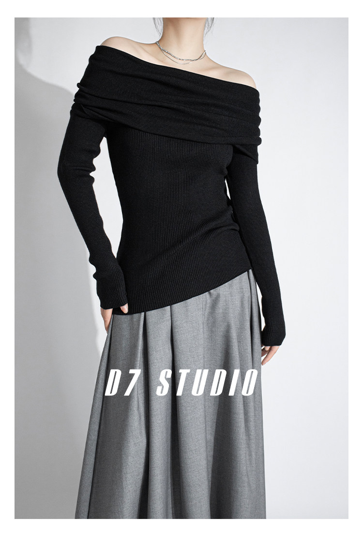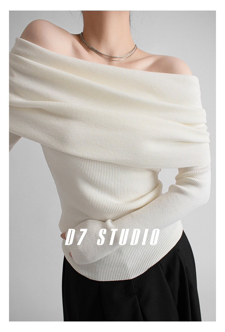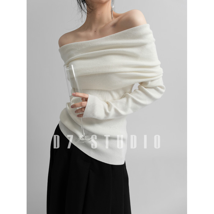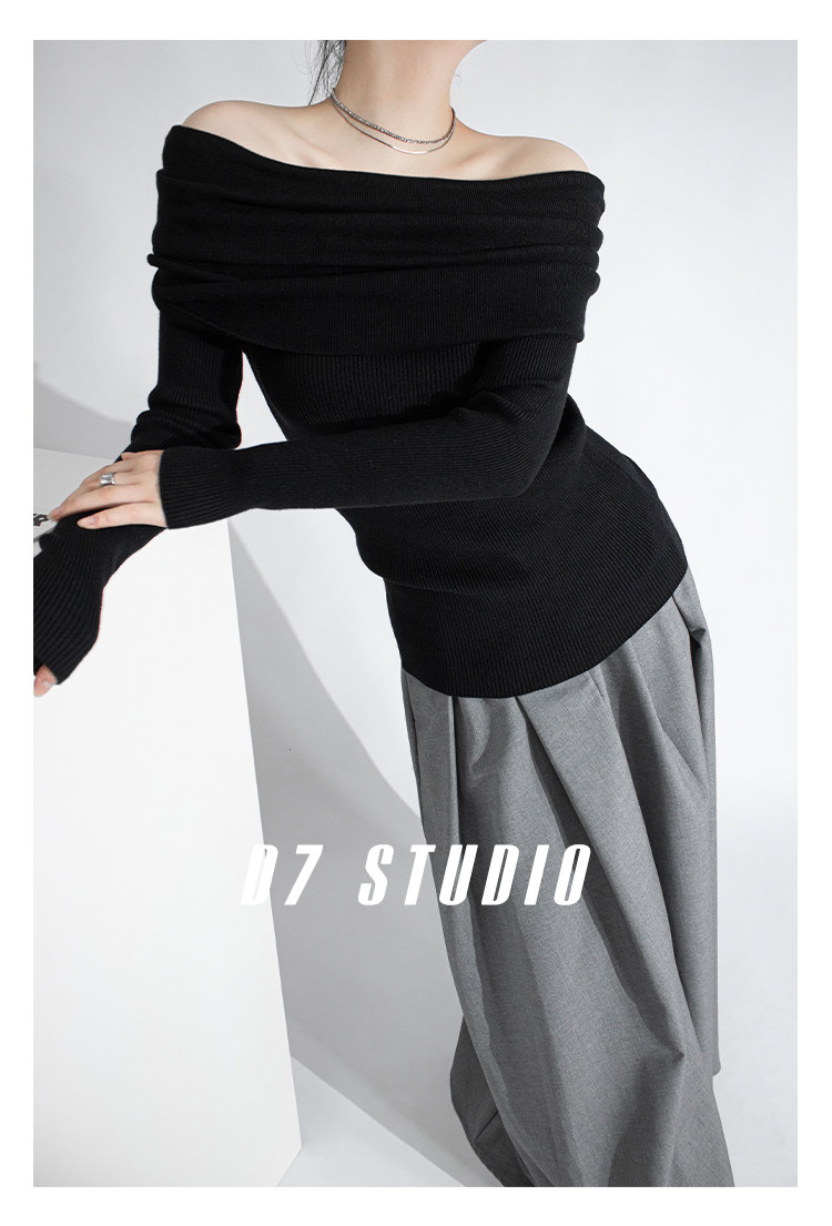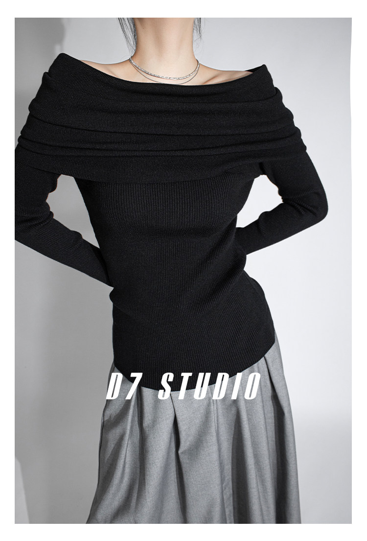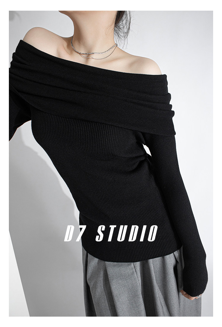 性感一字肩大翻領軟糯針織衫法式溫柔修身長袖酒紅色絕美毛衣春秋