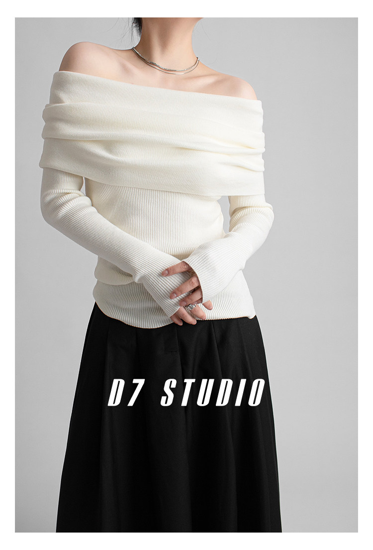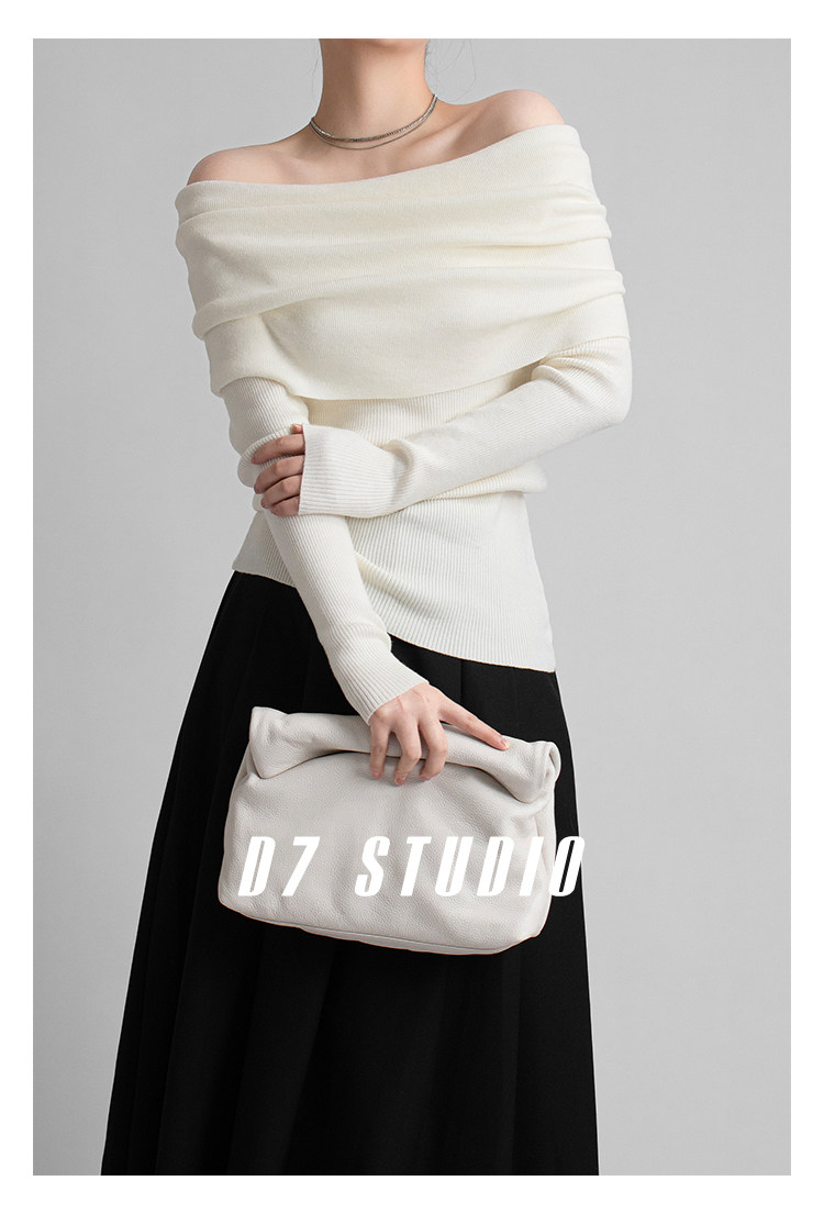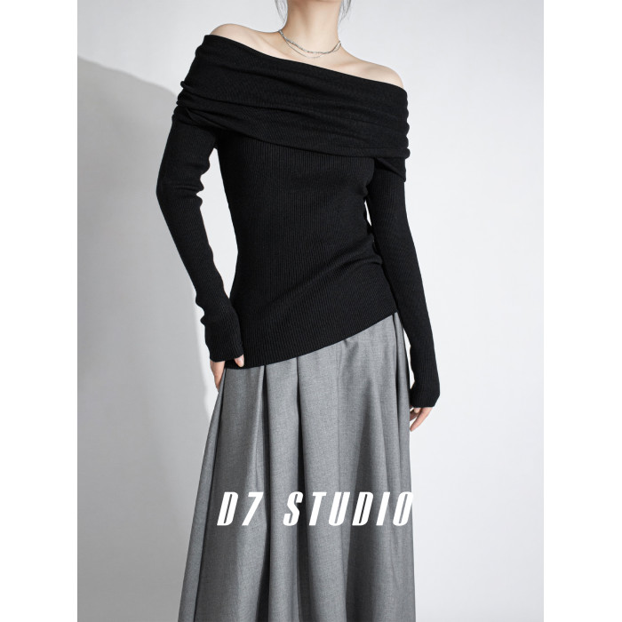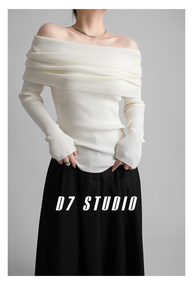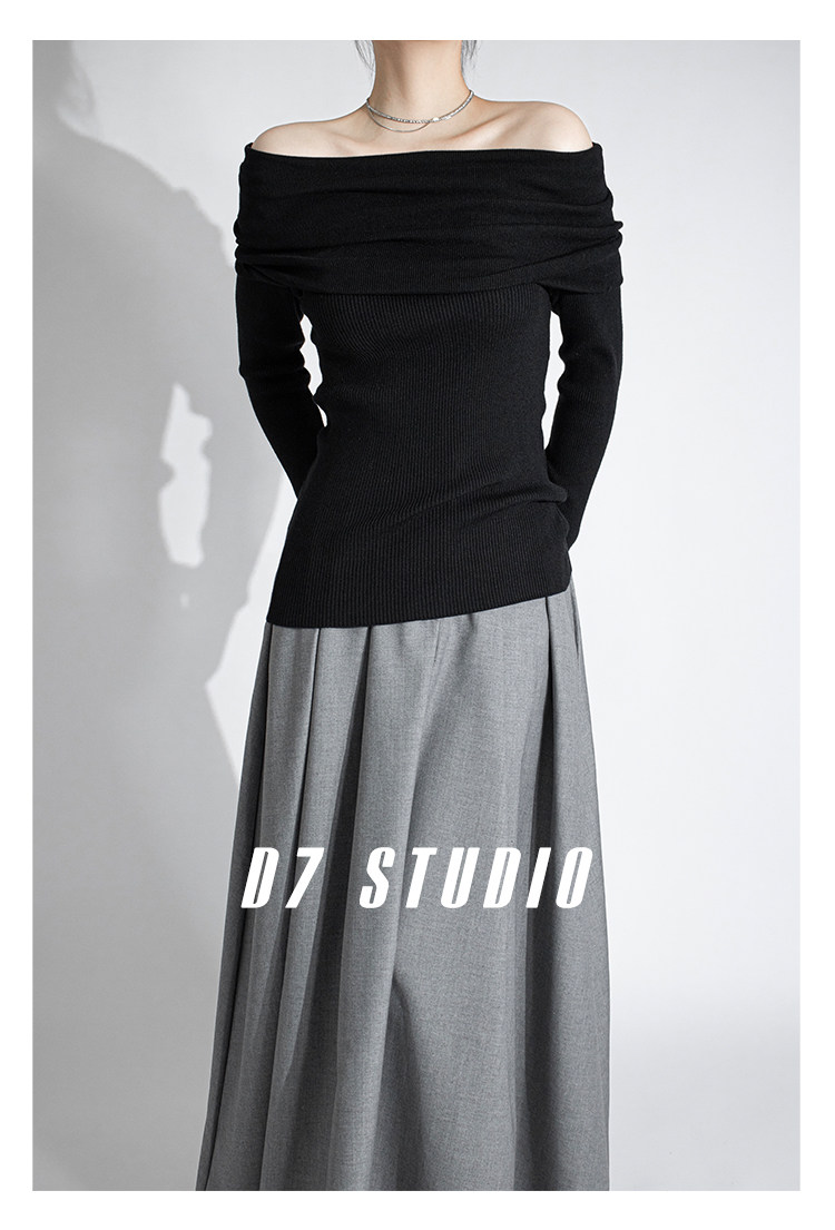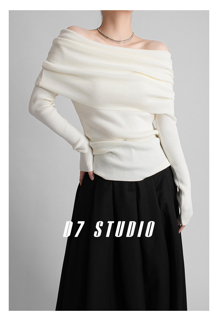 性感一字肩大翻領軟糯針織衫法式溫柔修身長袖酒紅色絕美毛衣春秋