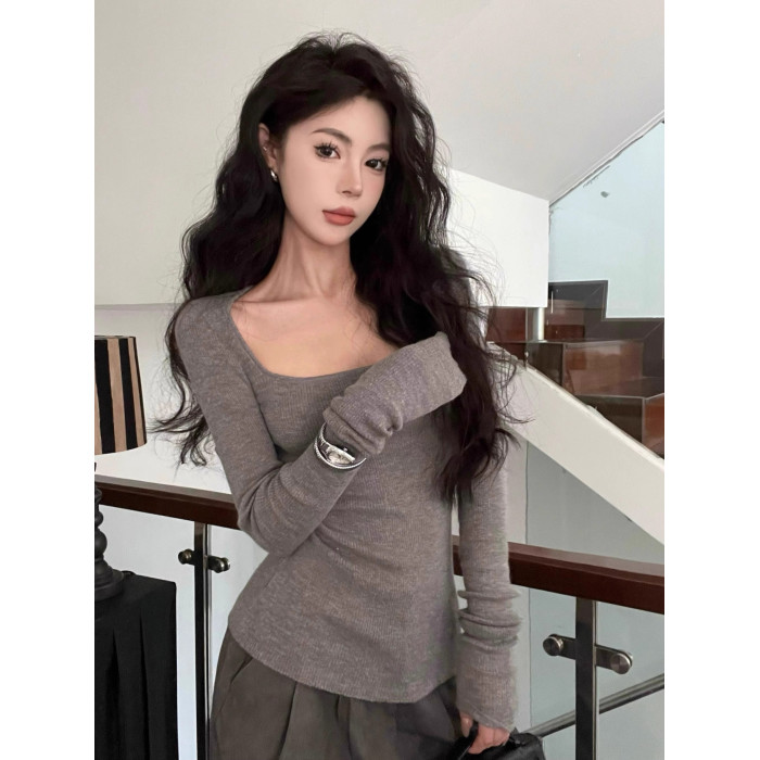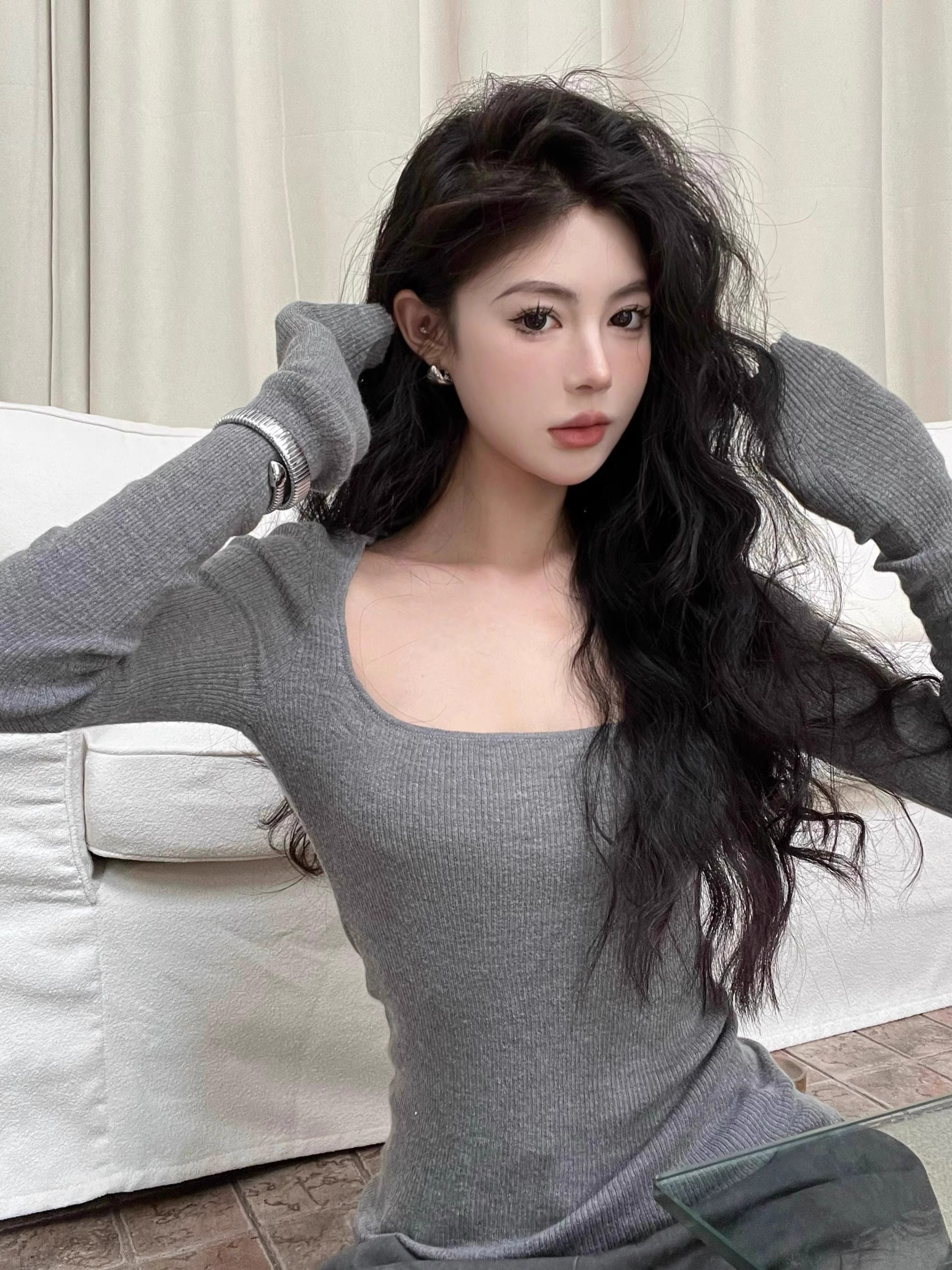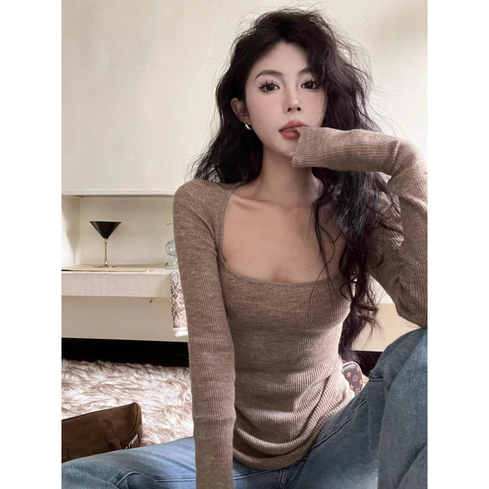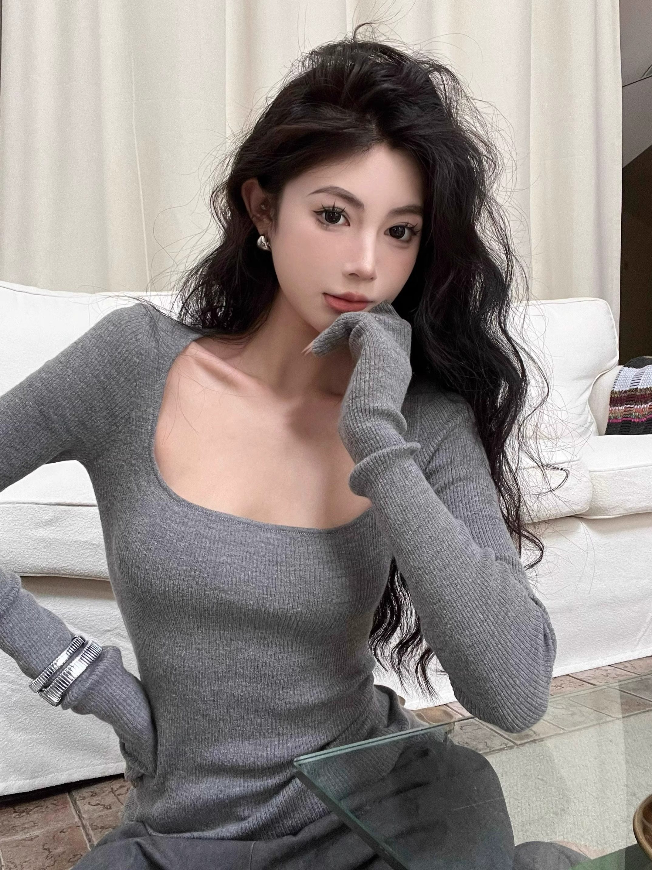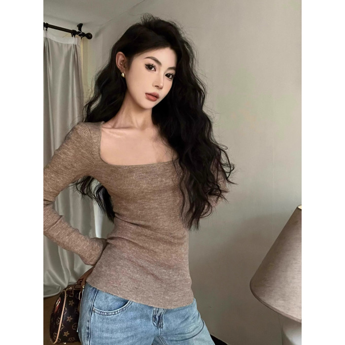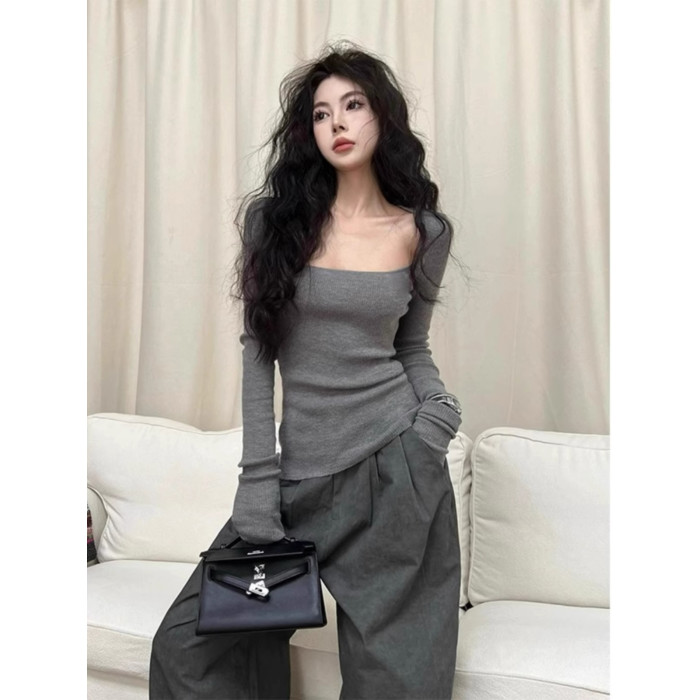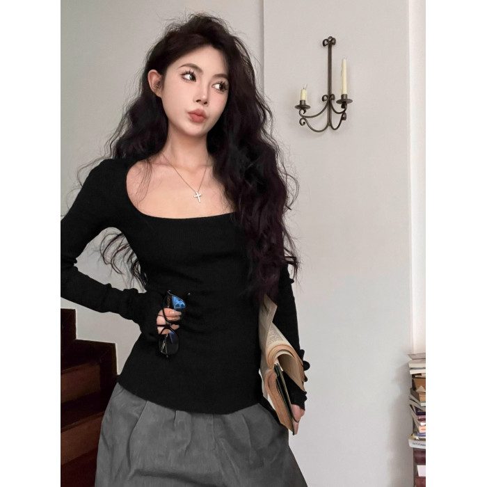 美式復古辣妹方領露鎖骨針織衫女秋冬慵懶風長袖修身顯瘦打底上衣