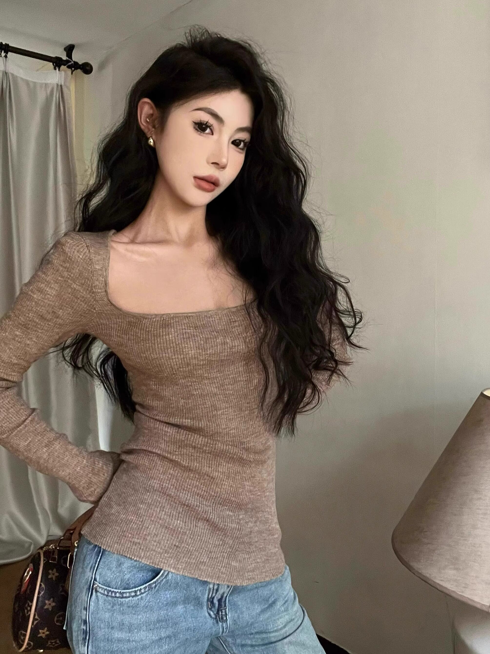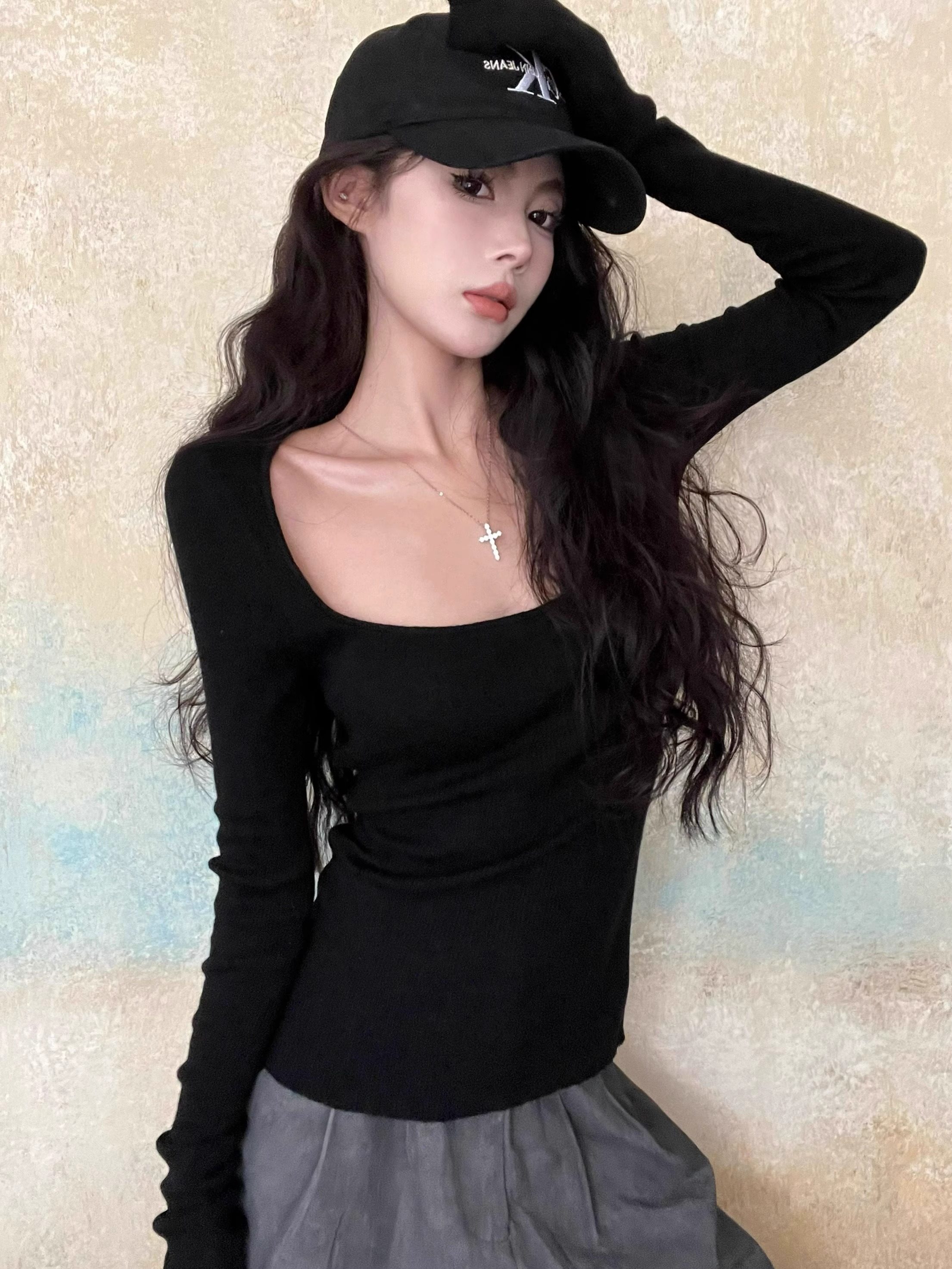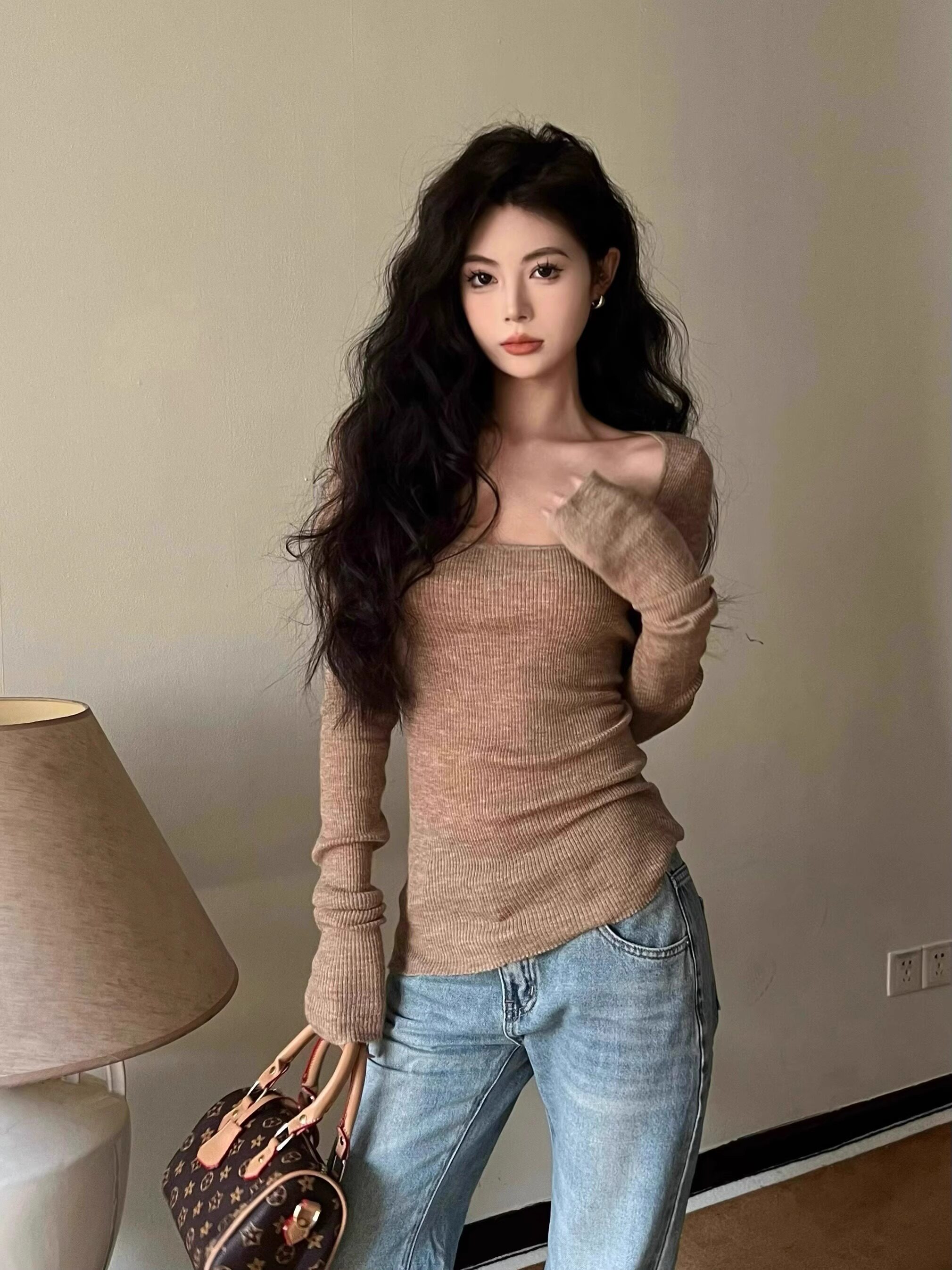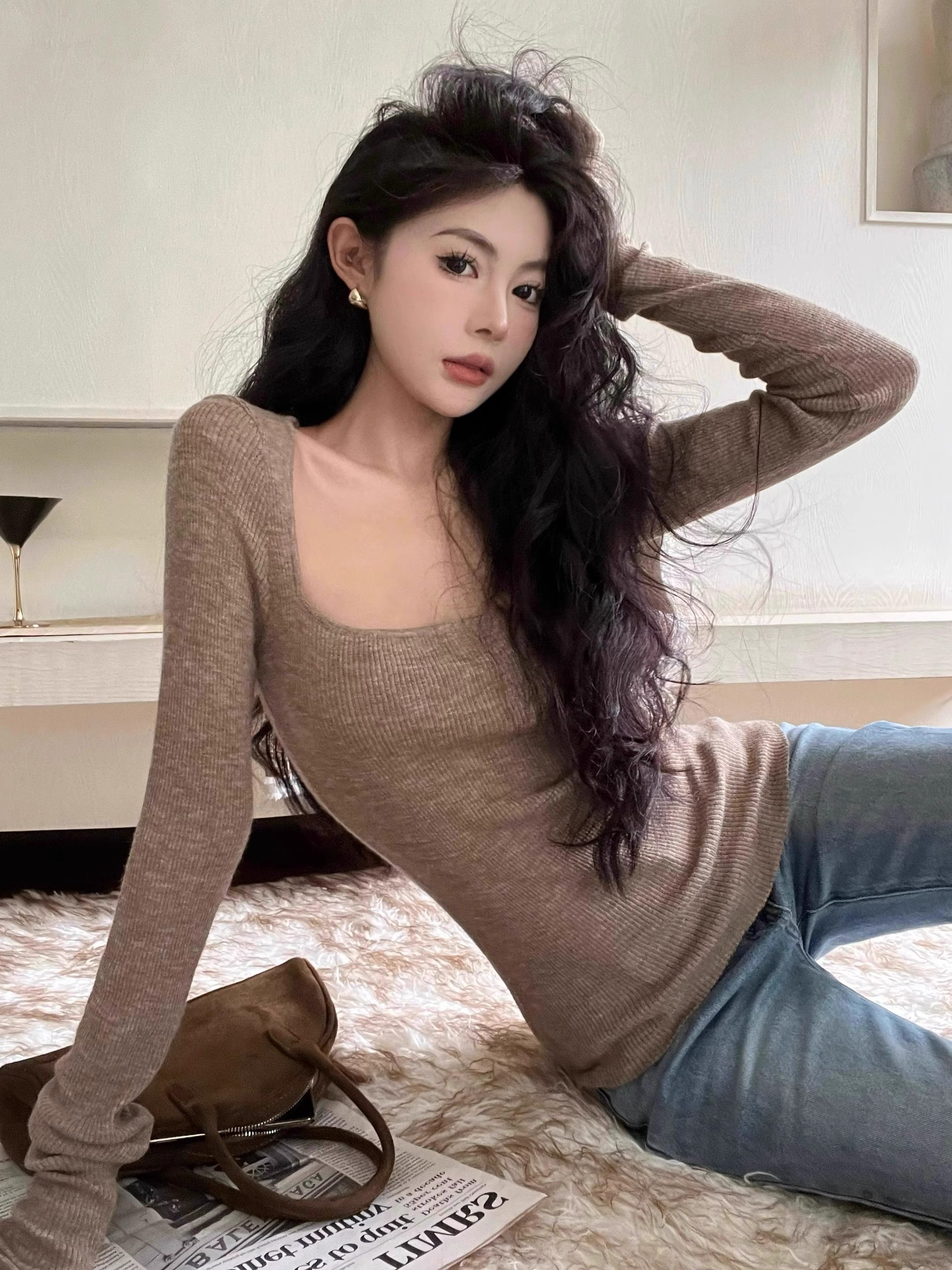 美式復古辣妹方領露鎖骨針織衫女秋冬慵懶風長袖修身顯瘦打底上衣