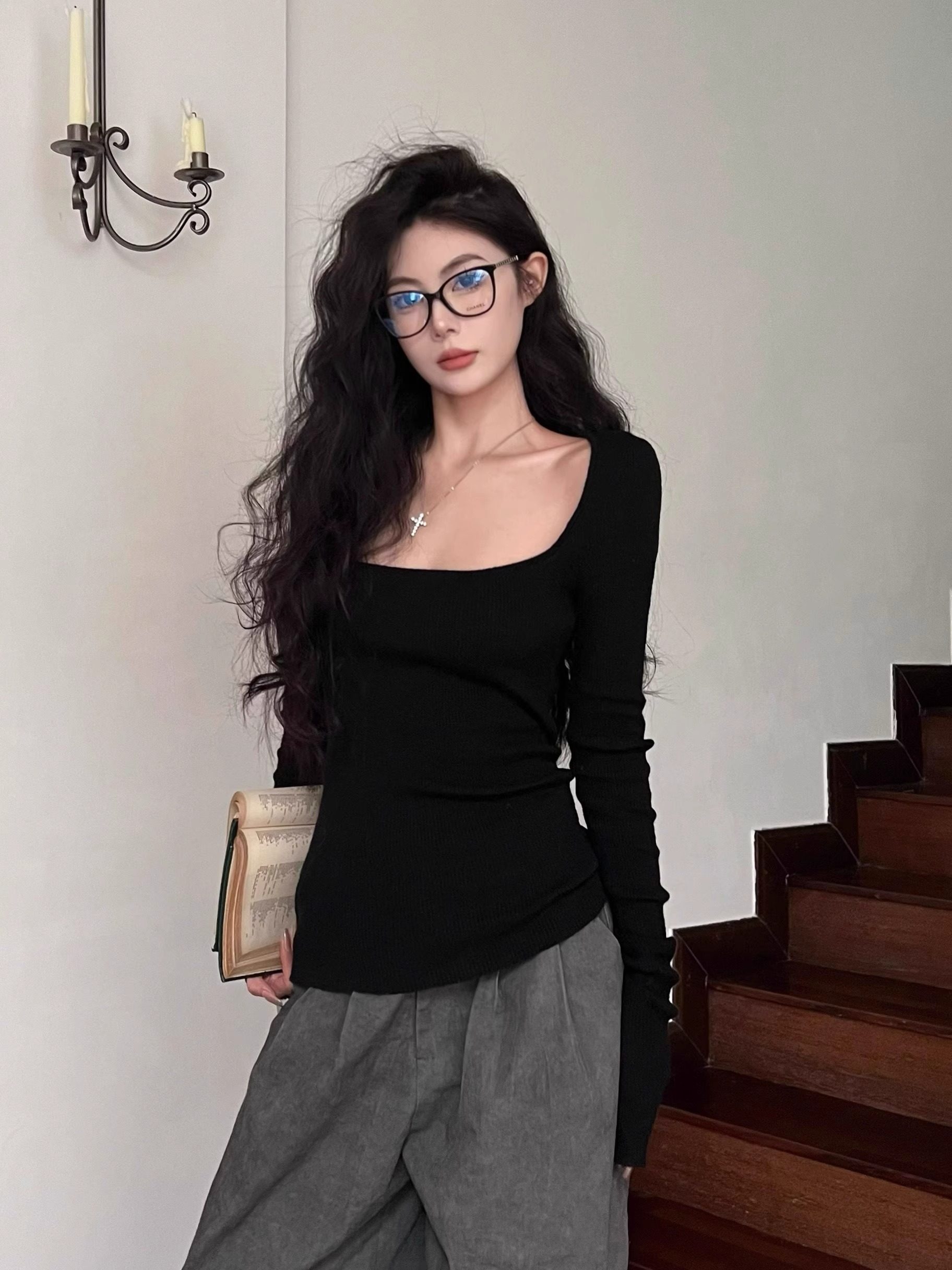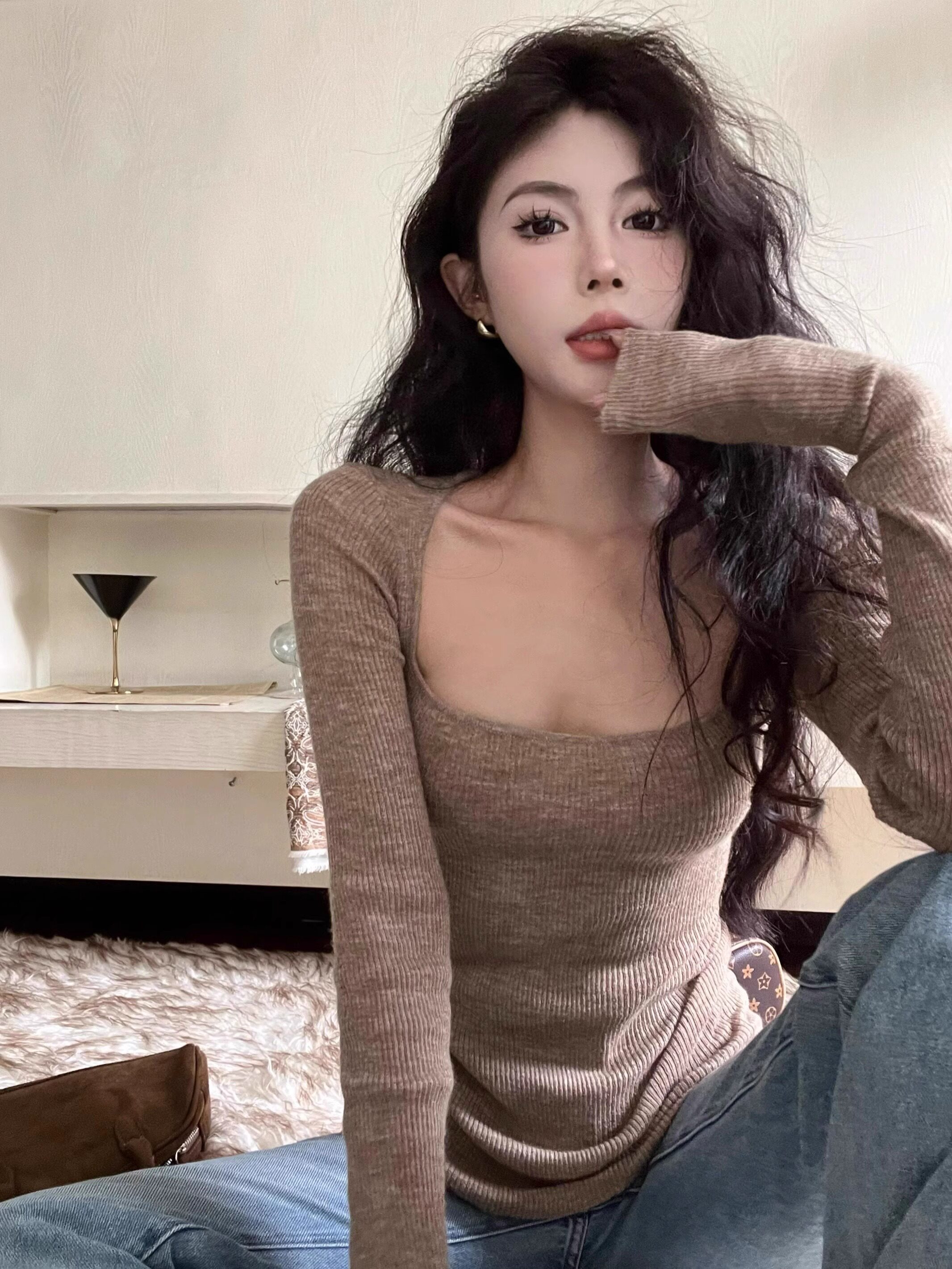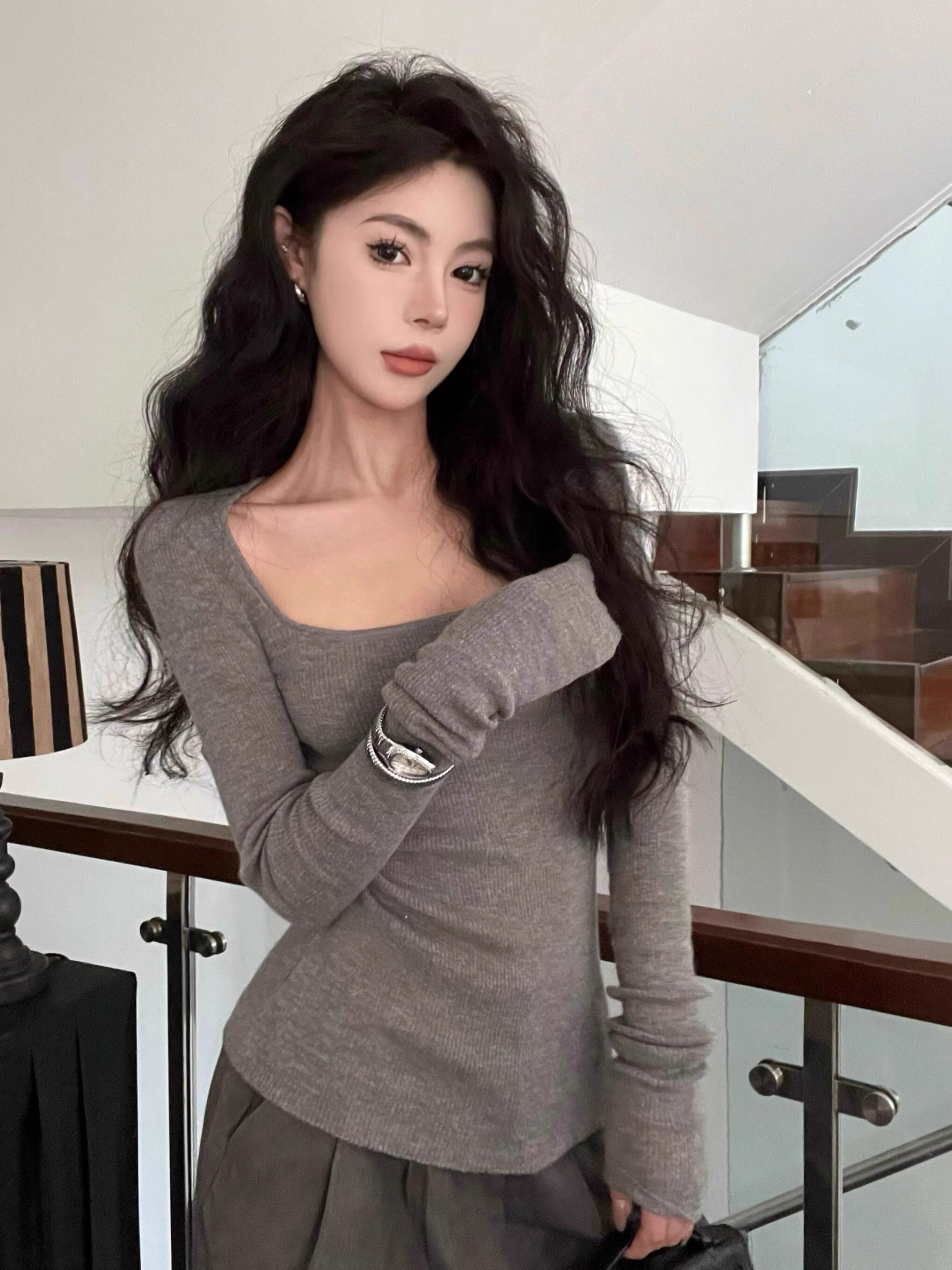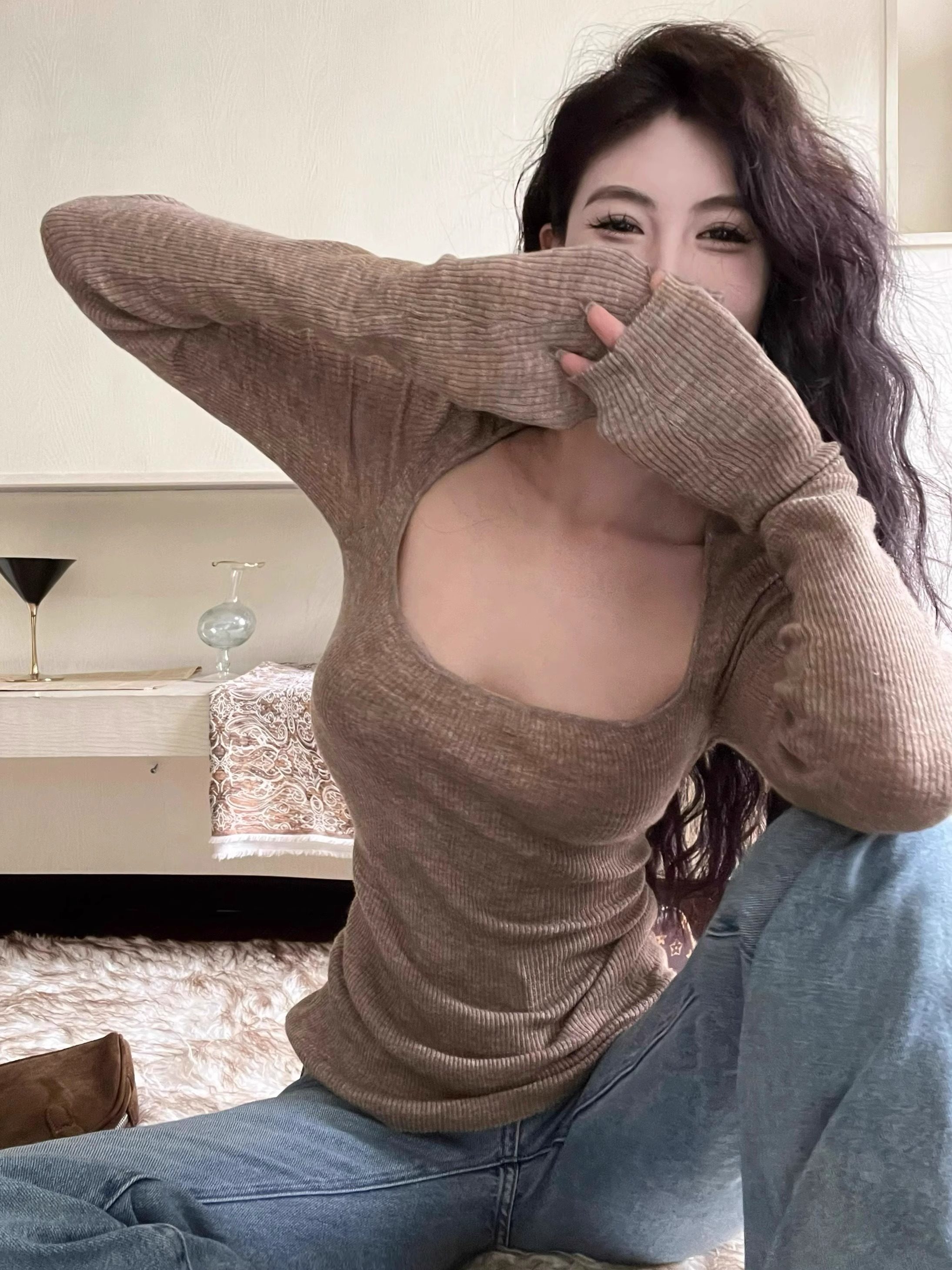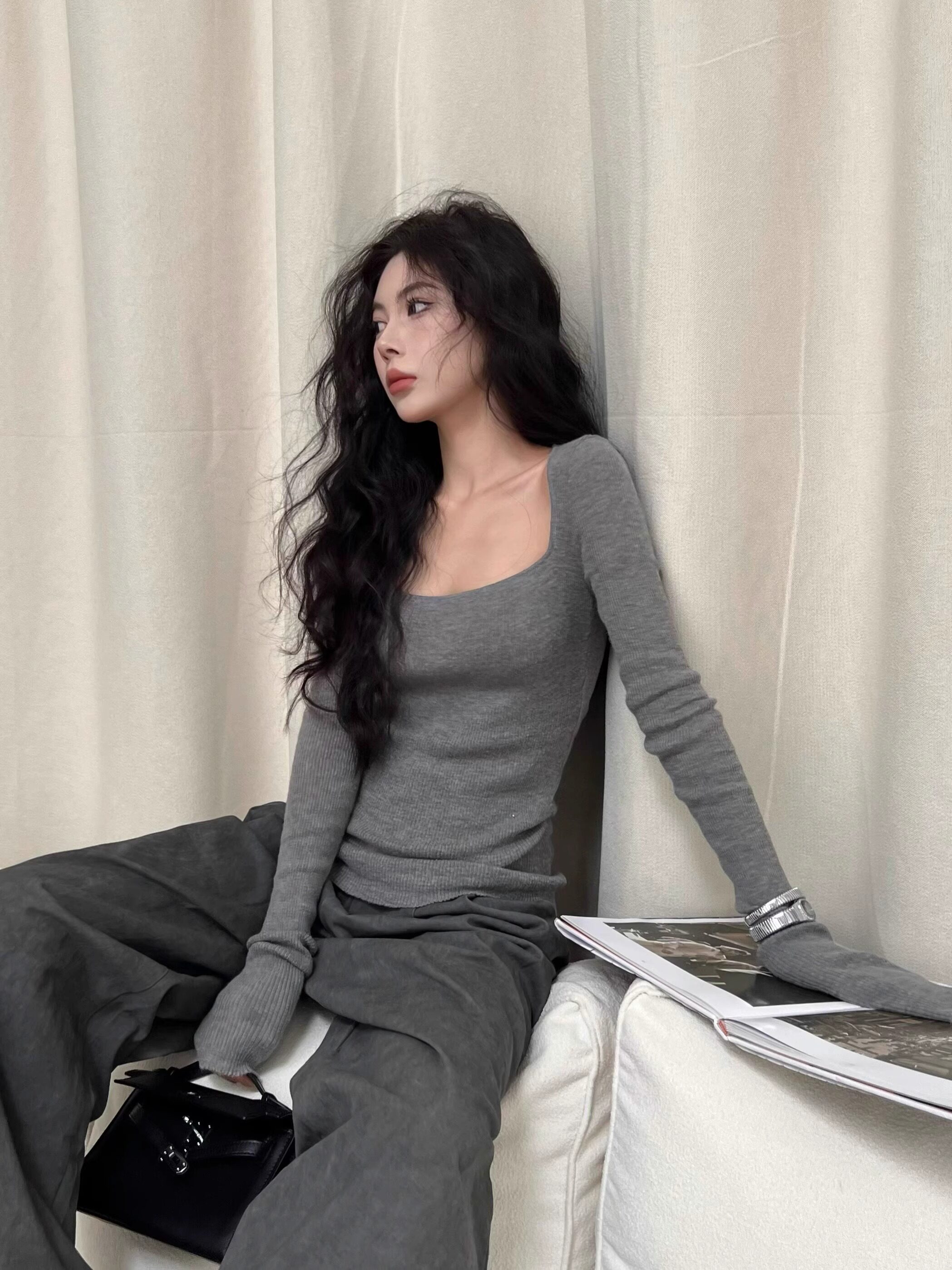 美式復古辣妹方領露鎖骨針織衫女秋冬慵懶風長袖修身顯瘦打底上衣