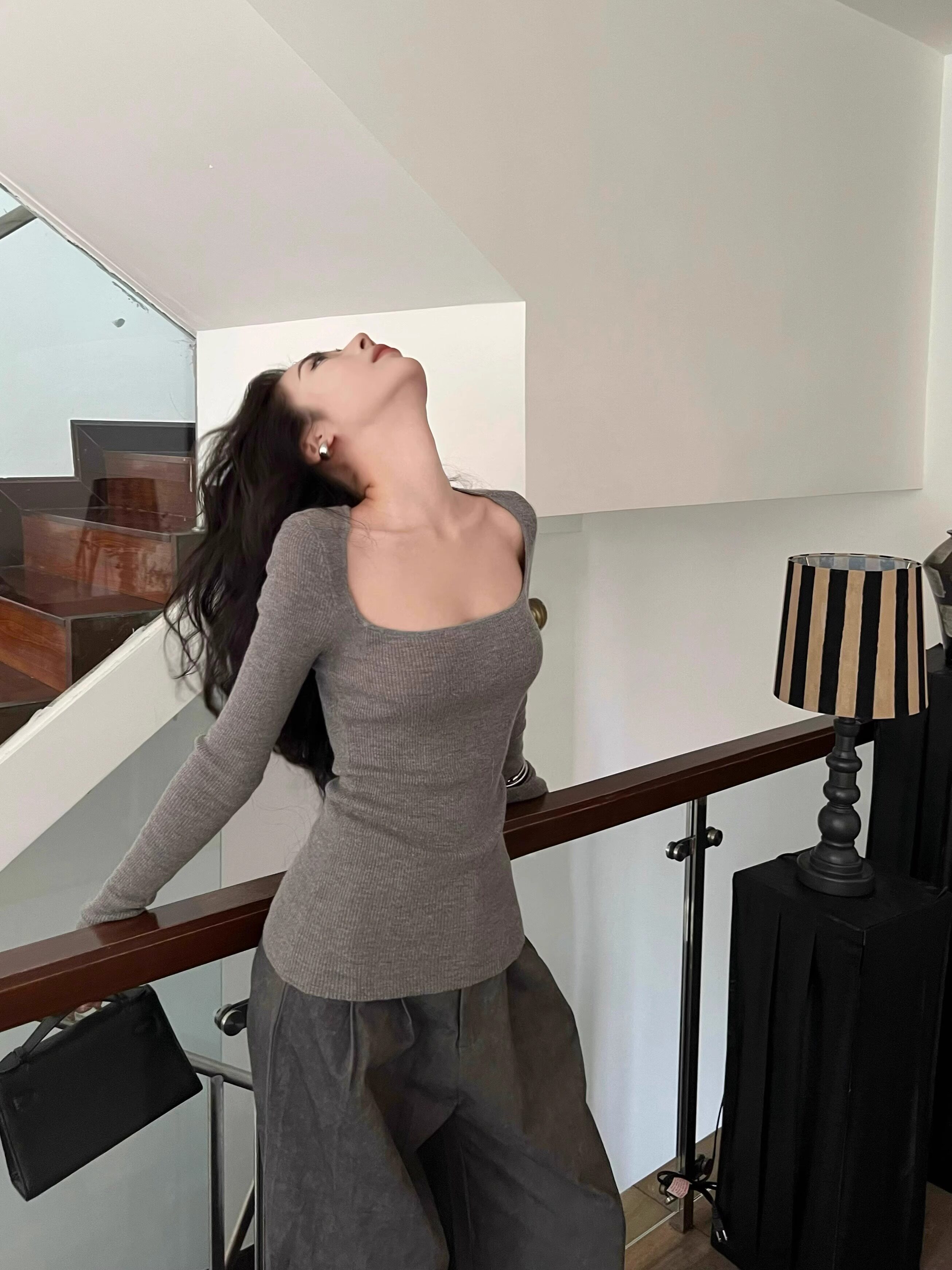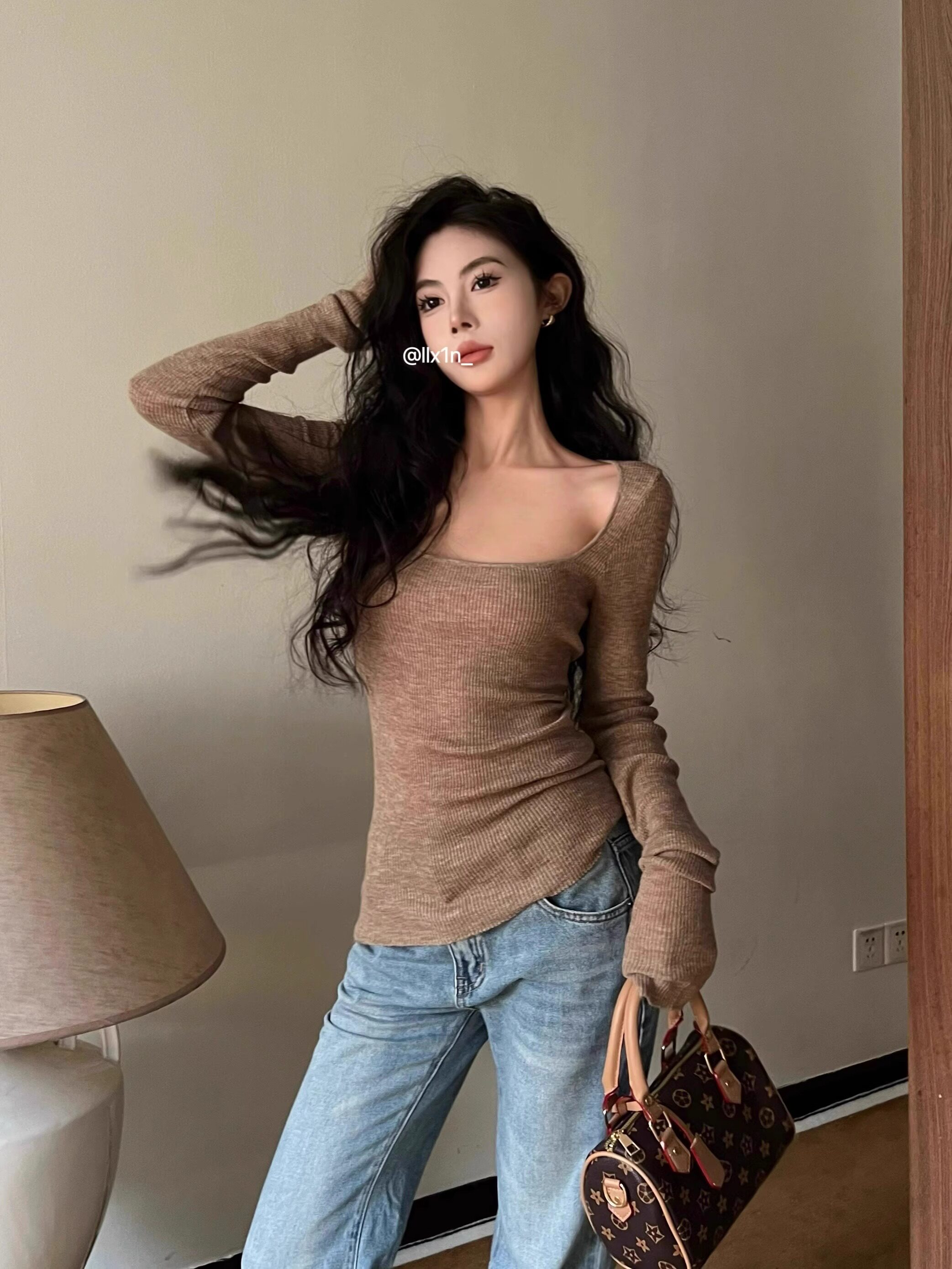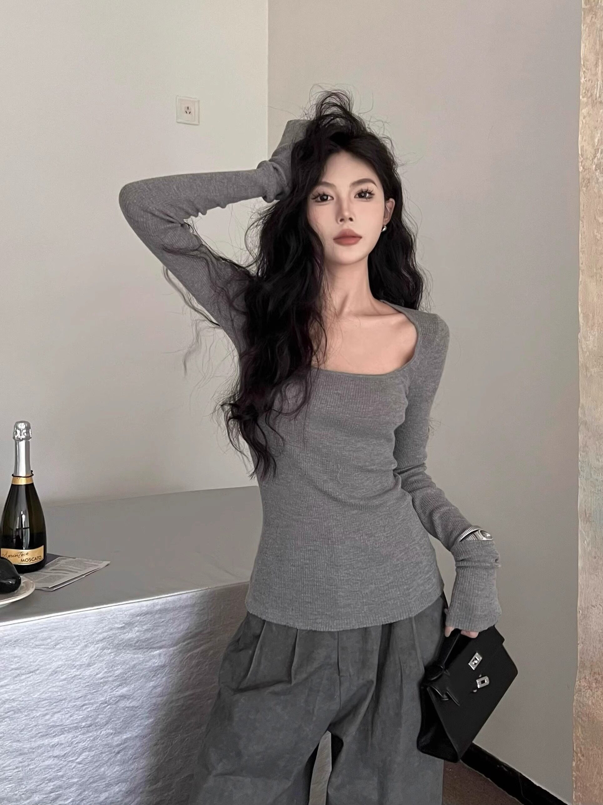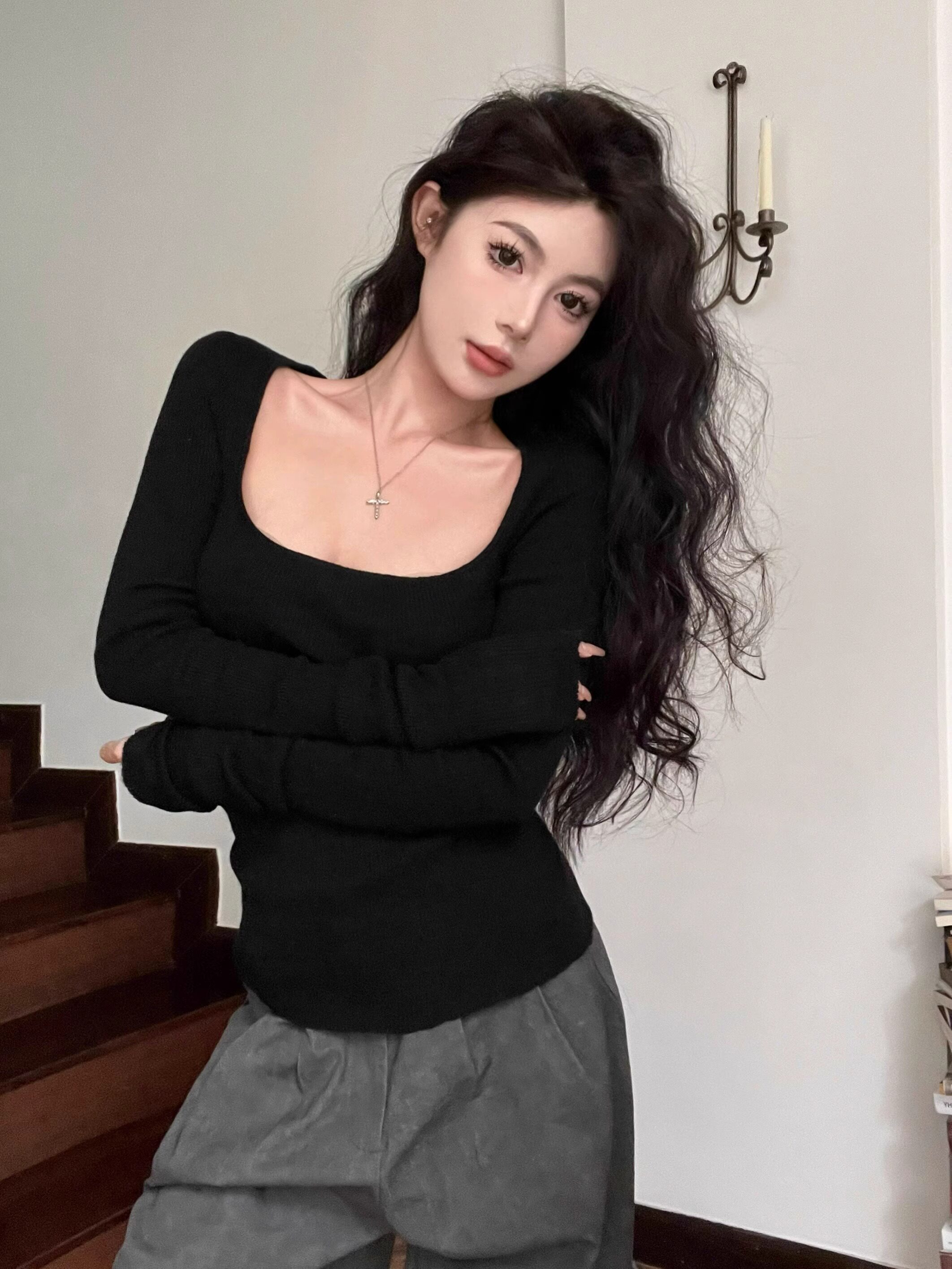 美式復古辣妹方領露鎖骨針織衫女秋冬慵懶風長袖修身顯瘦打底上衣