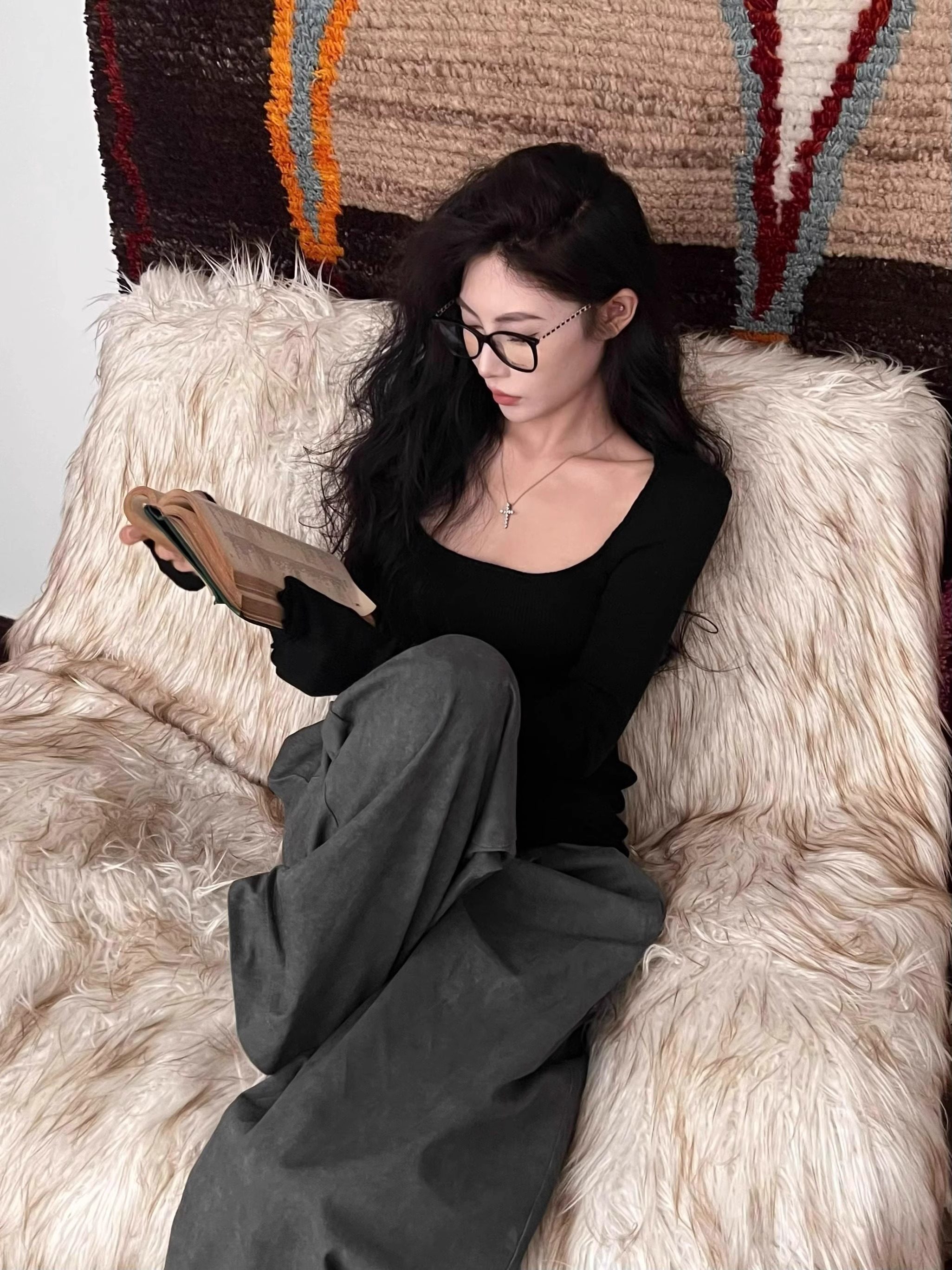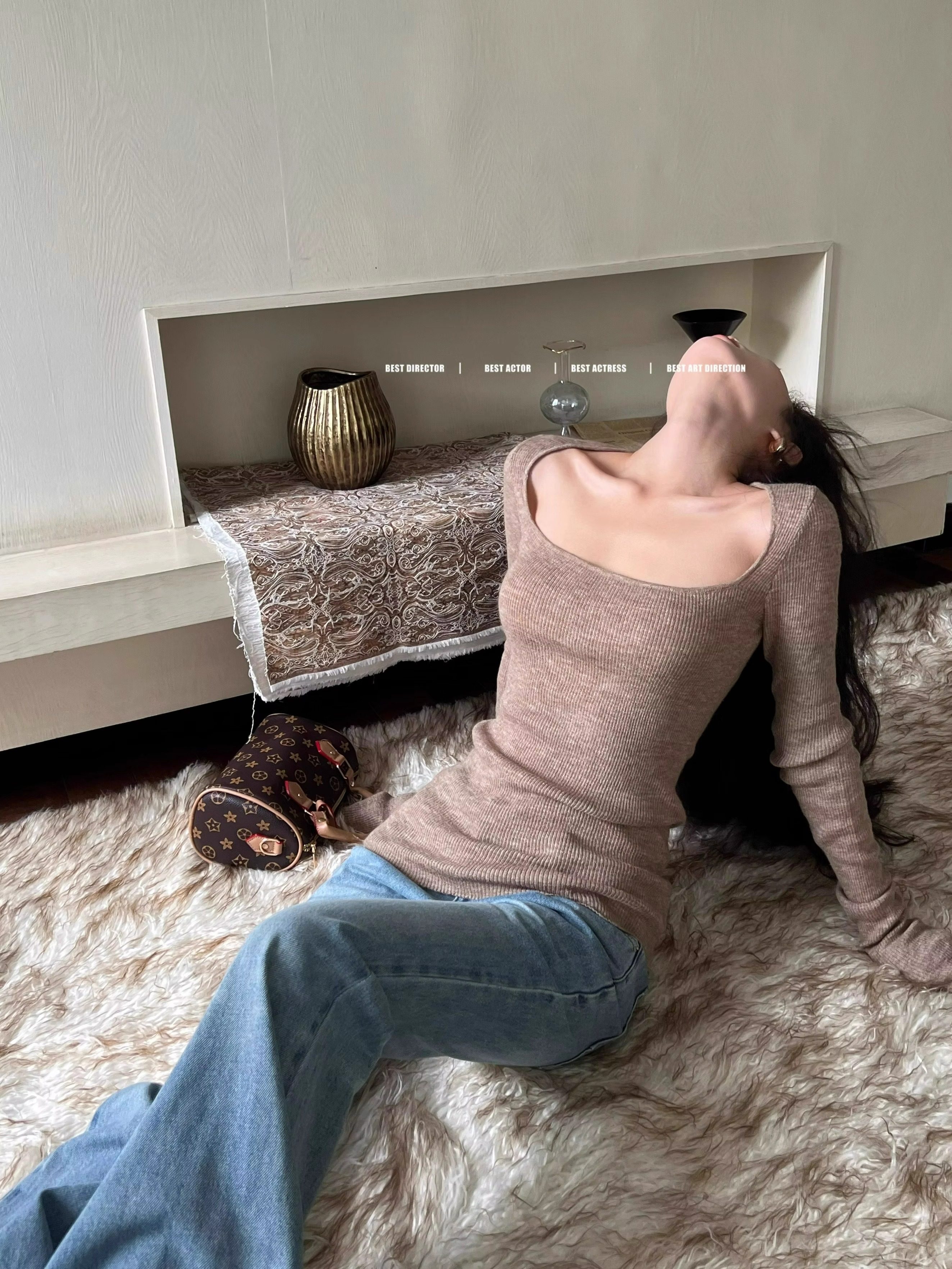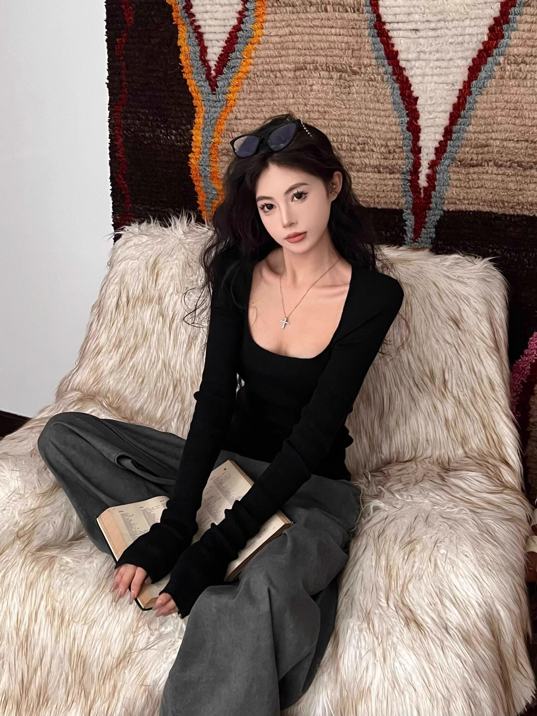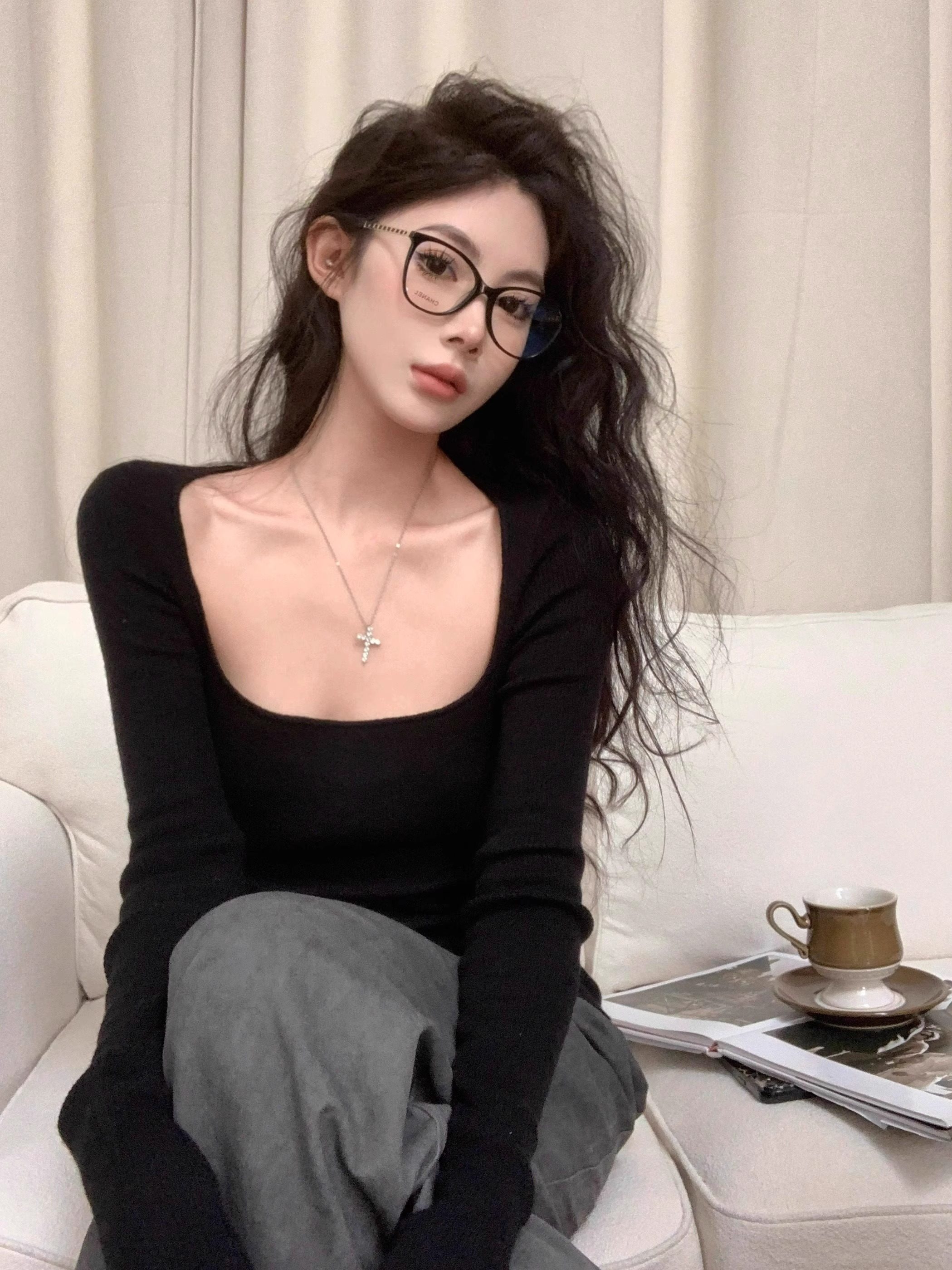 美式復古辣妹方領露鎖骨針織衫女秋冬慵懶風長袖修身顯瘦打底上衣
