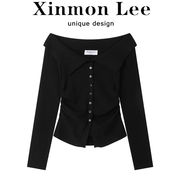 XinmonLee高級感性感露肩針織打底衫一字肩早秋季收腰顯瘦短上衣