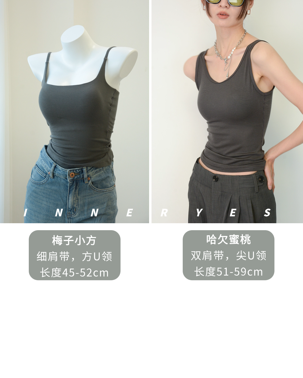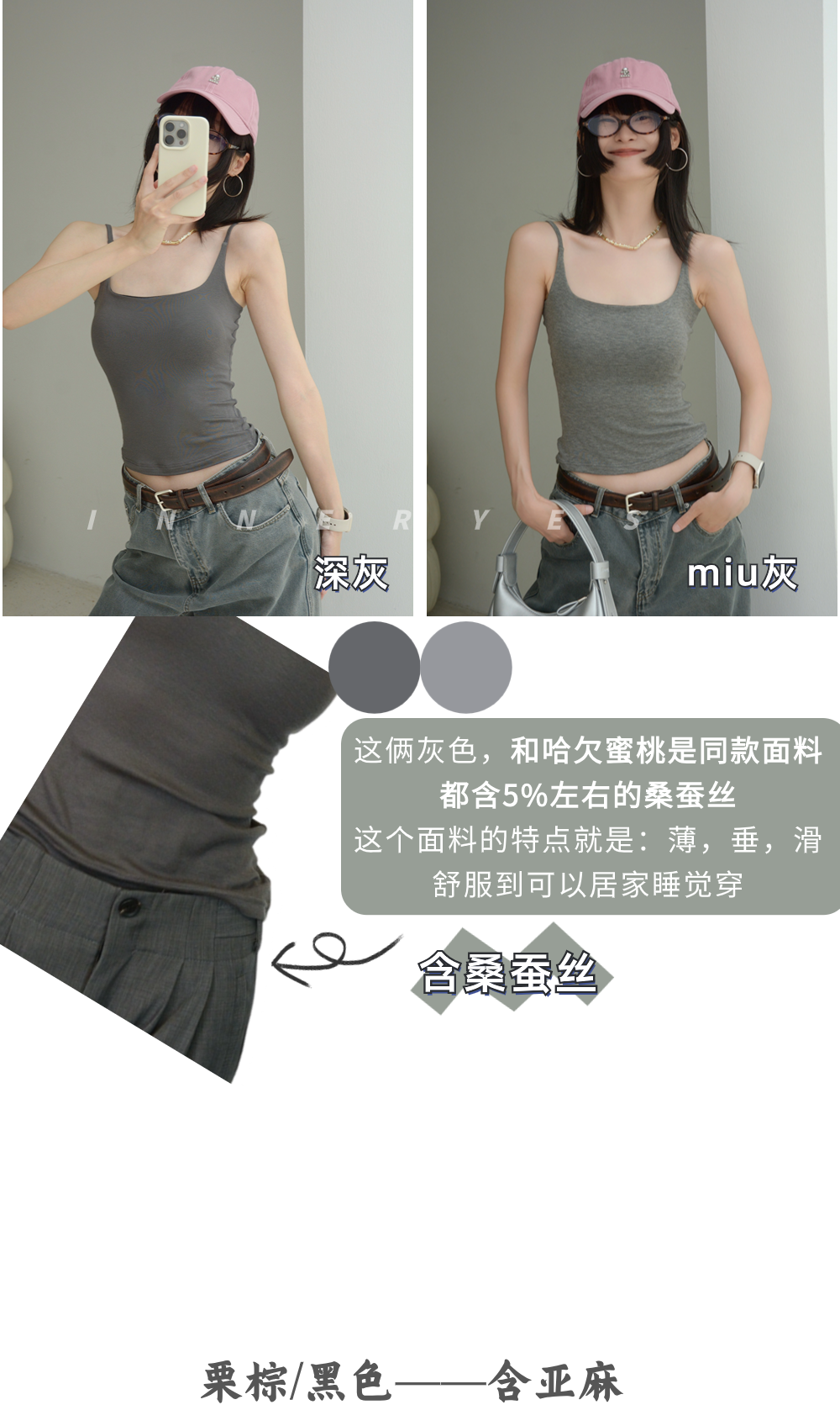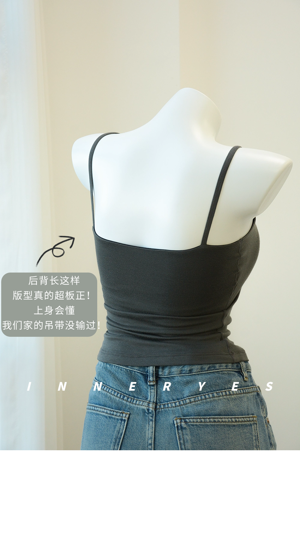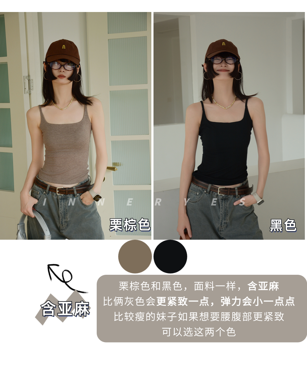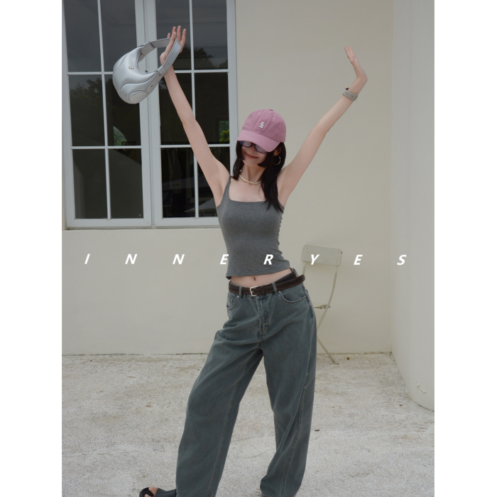 INNER YES梅子小方亞麻帶胸墊吊帶背心女內搭外穿灰色黑色上衣