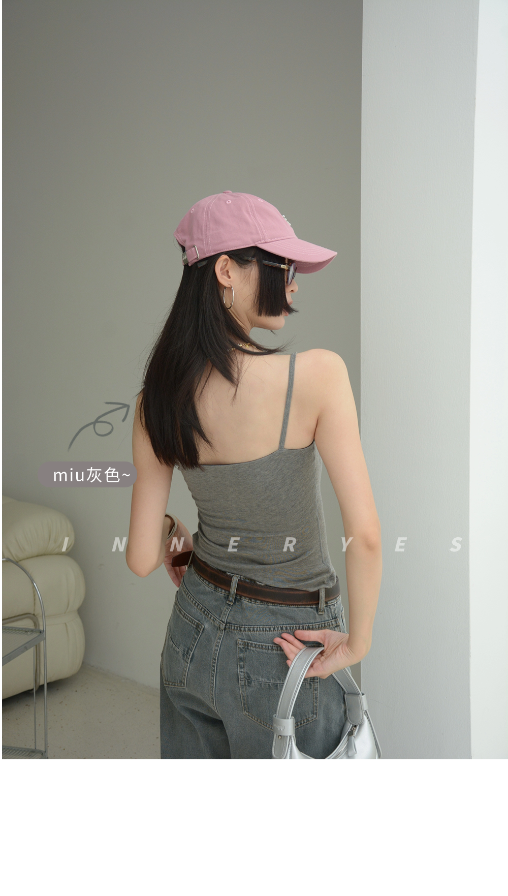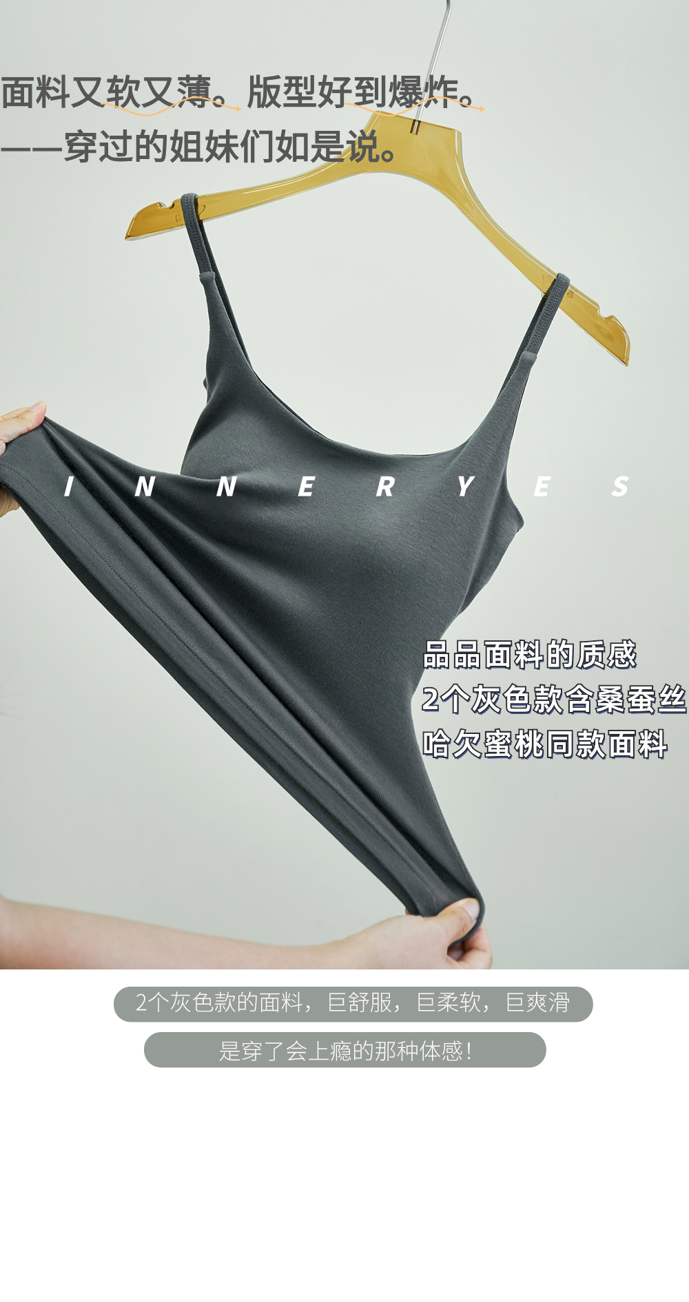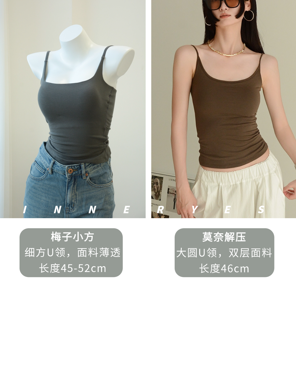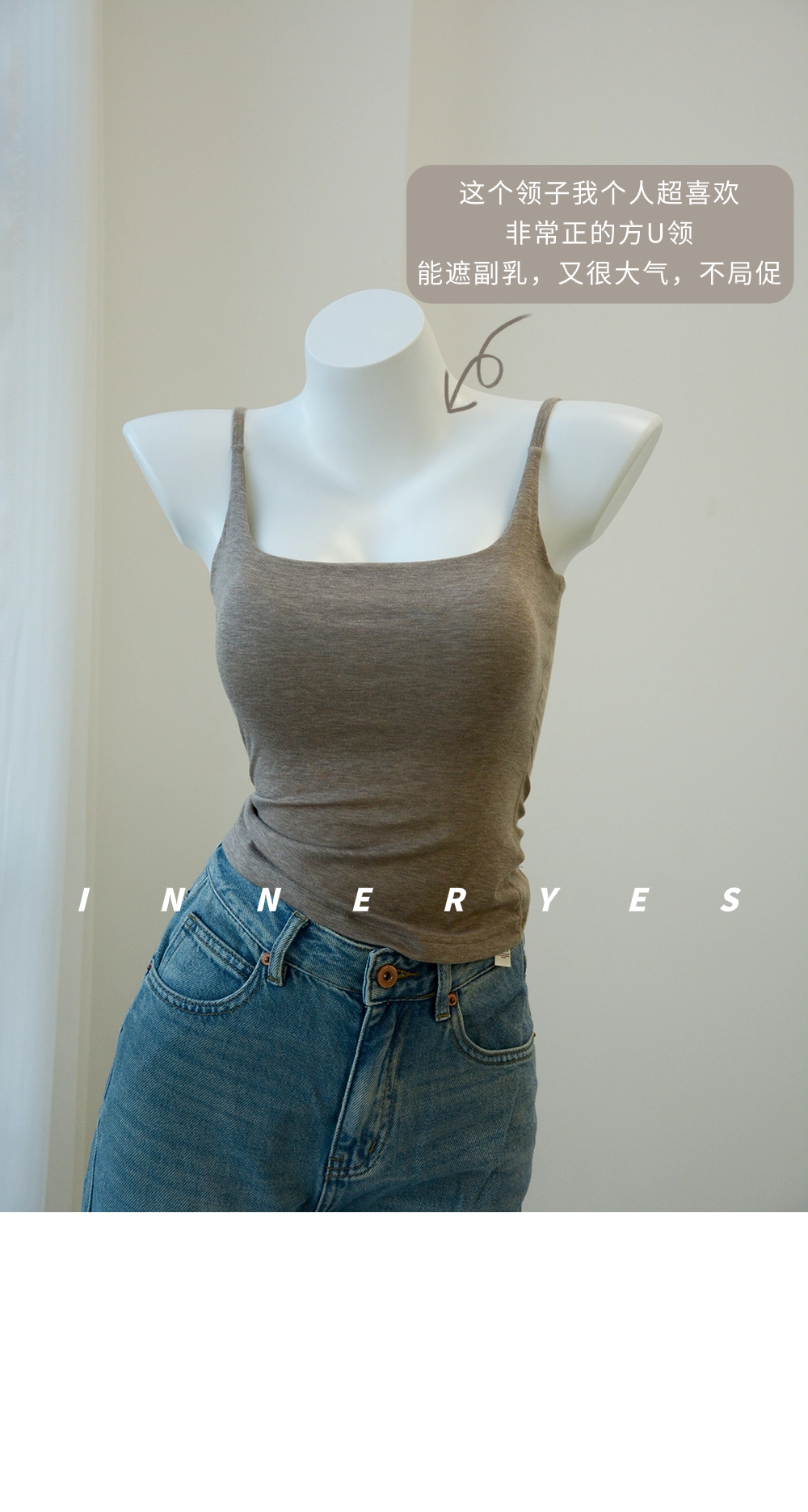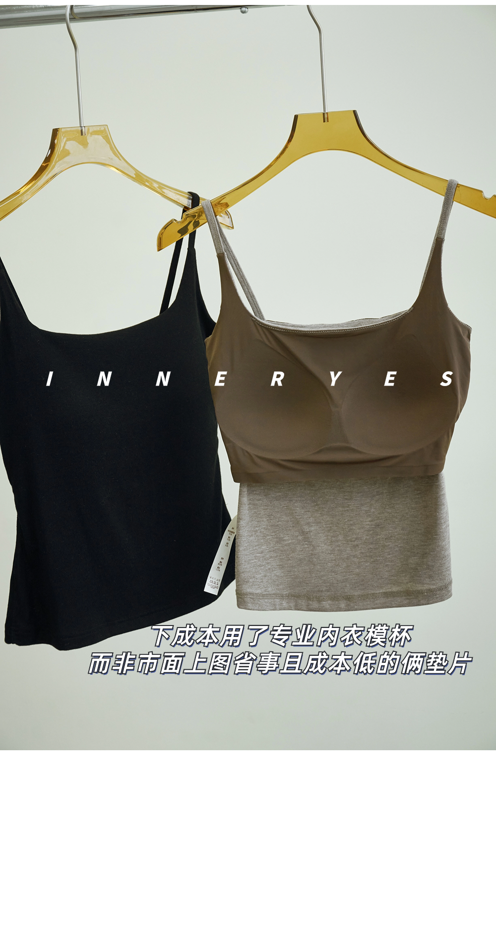 INNER YES梅子小方亞麻帶胸墊吊帶背心女內搭外穿灰色黑色上衣