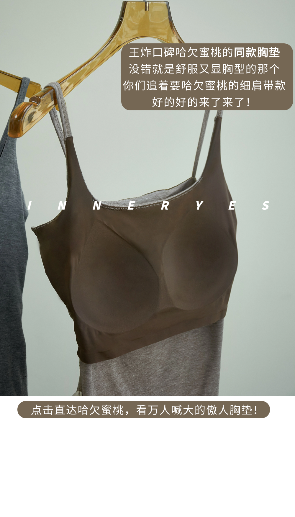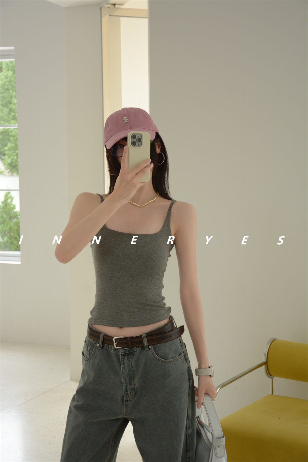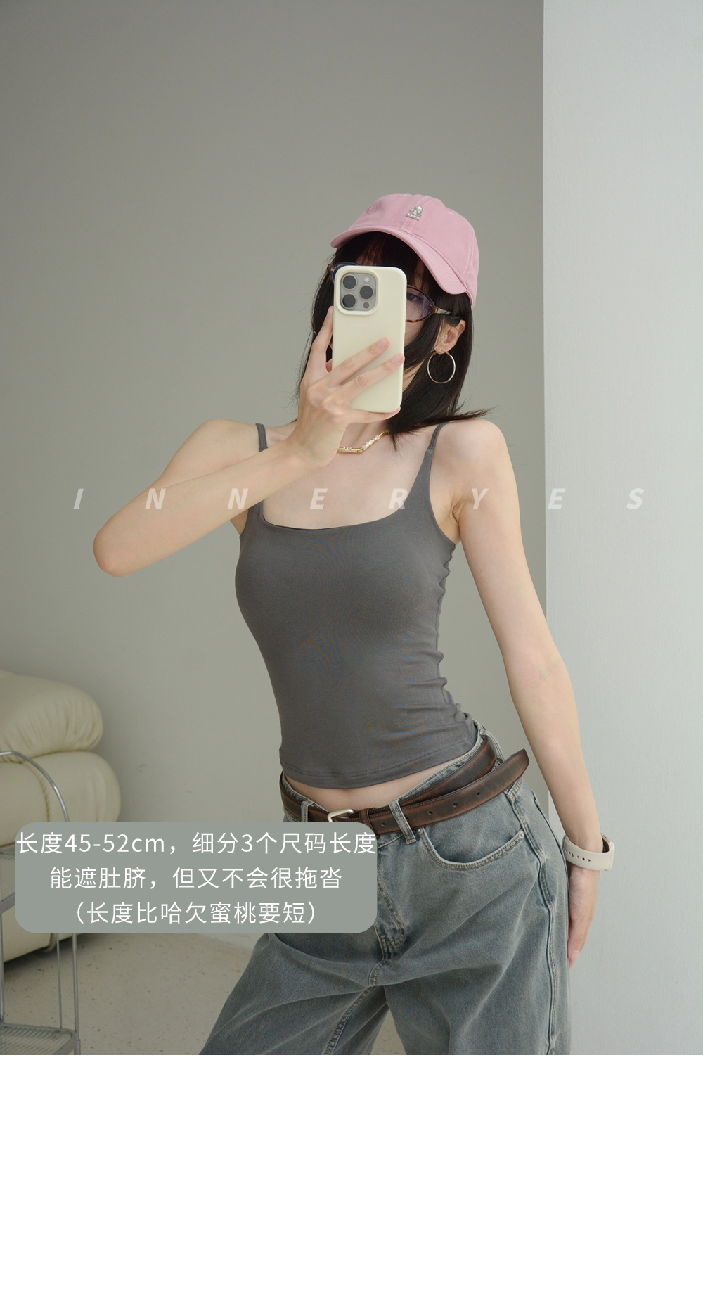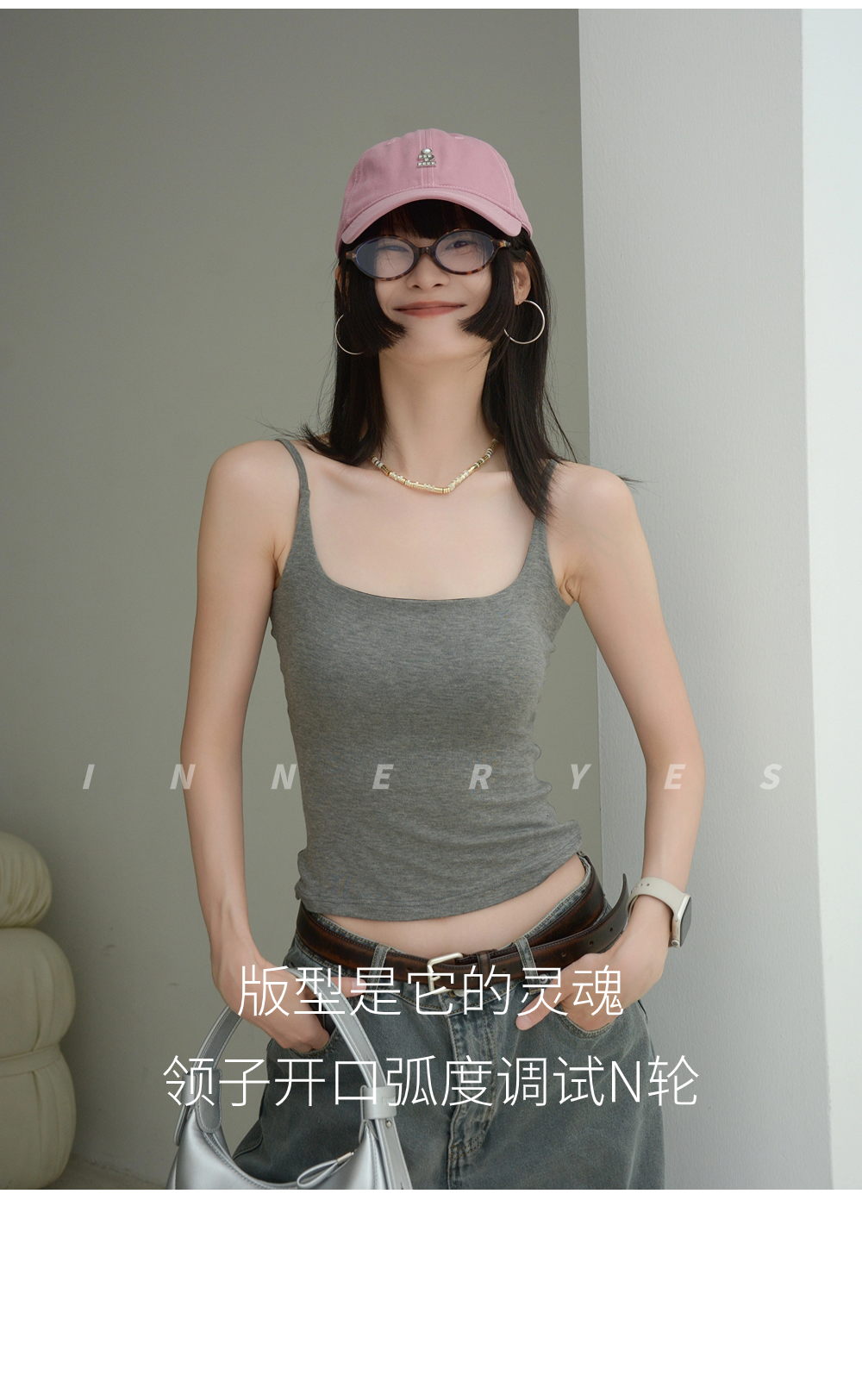 INNER YES梅子小方亞麻帶胸墊吊帶背心女內搭外穿灰色黑色上衣