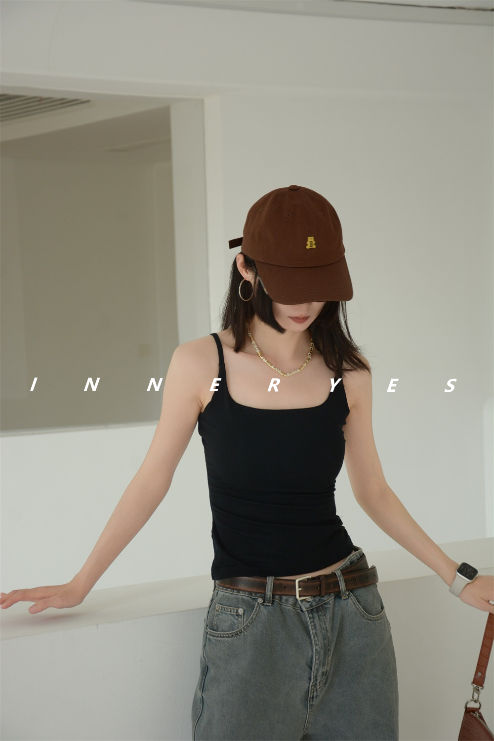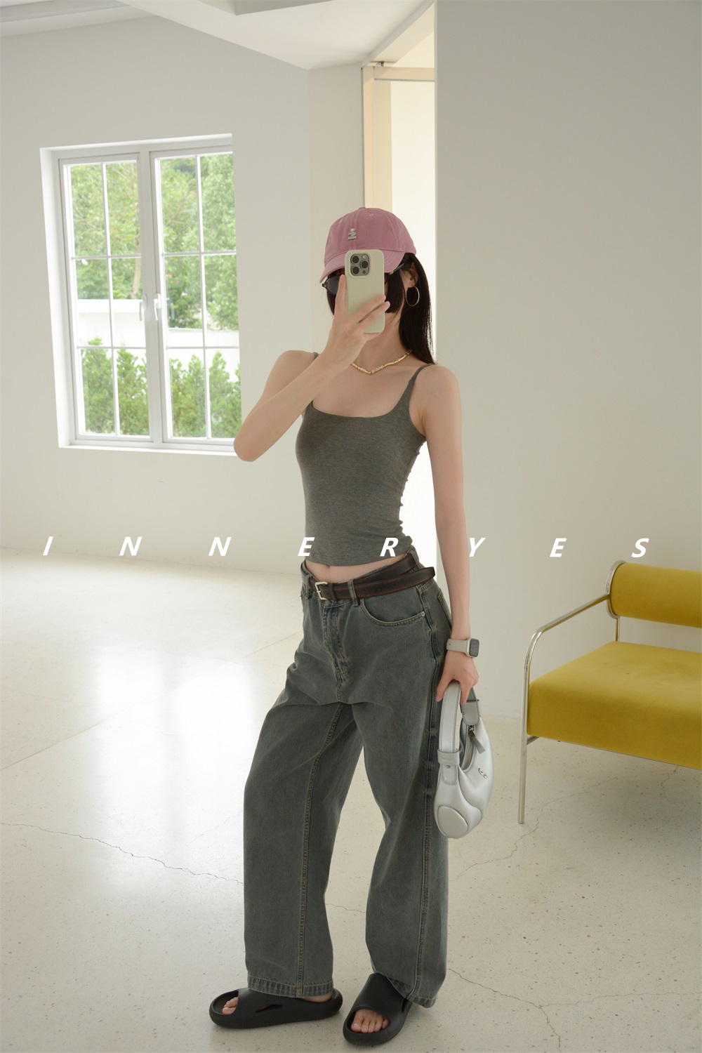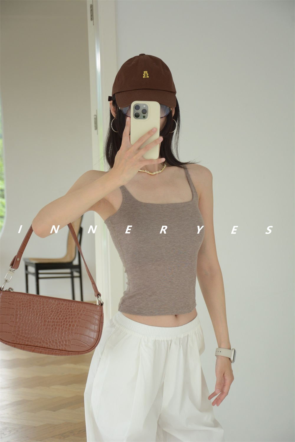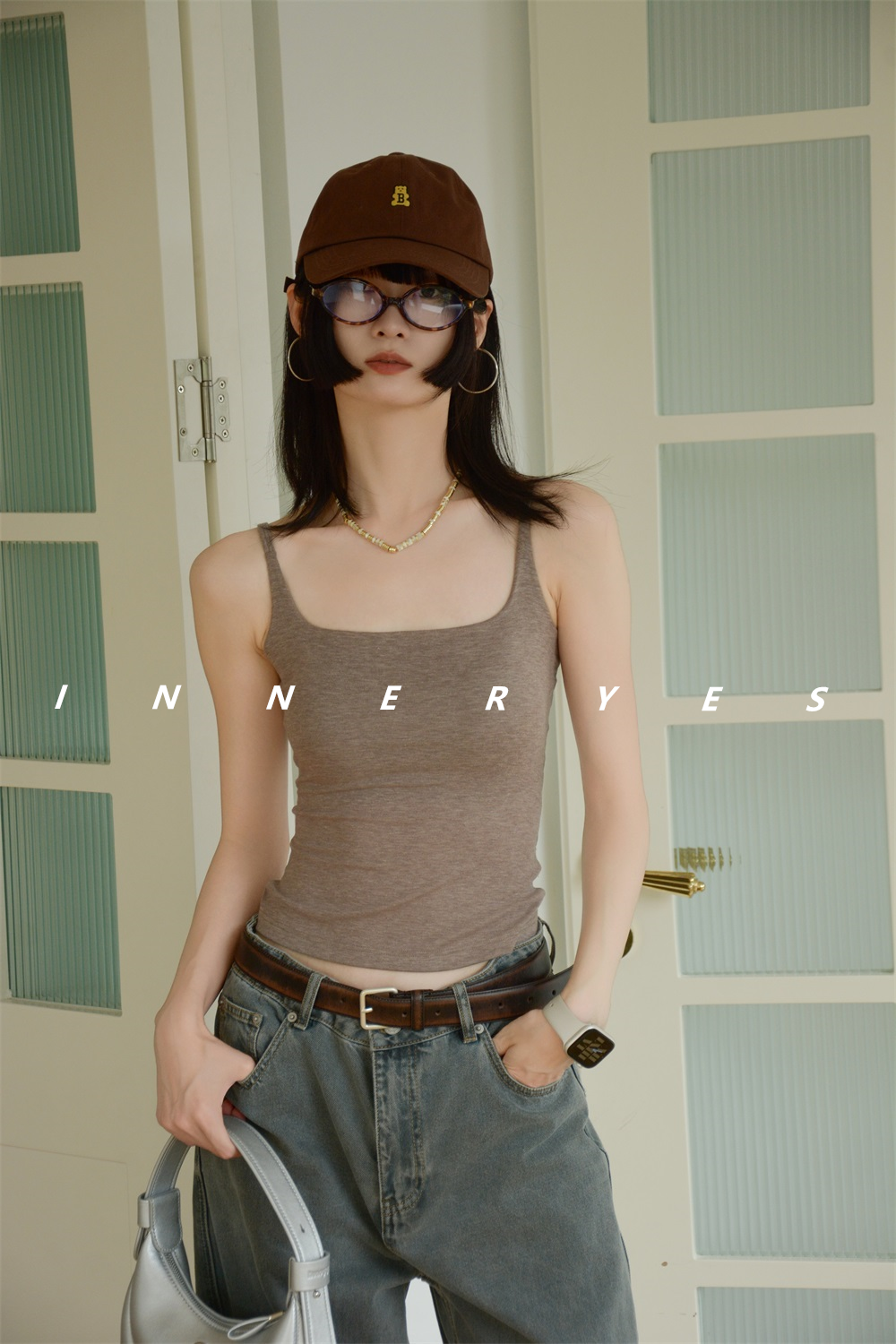 INNER YES梅子小方亞麻帶胸墊吊帶背心女內搭外穿灰色黑色上衣