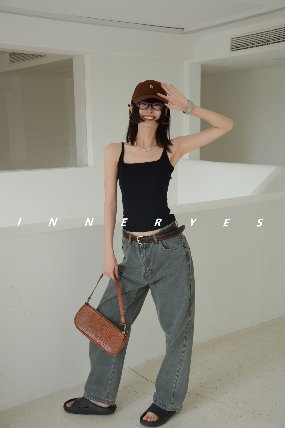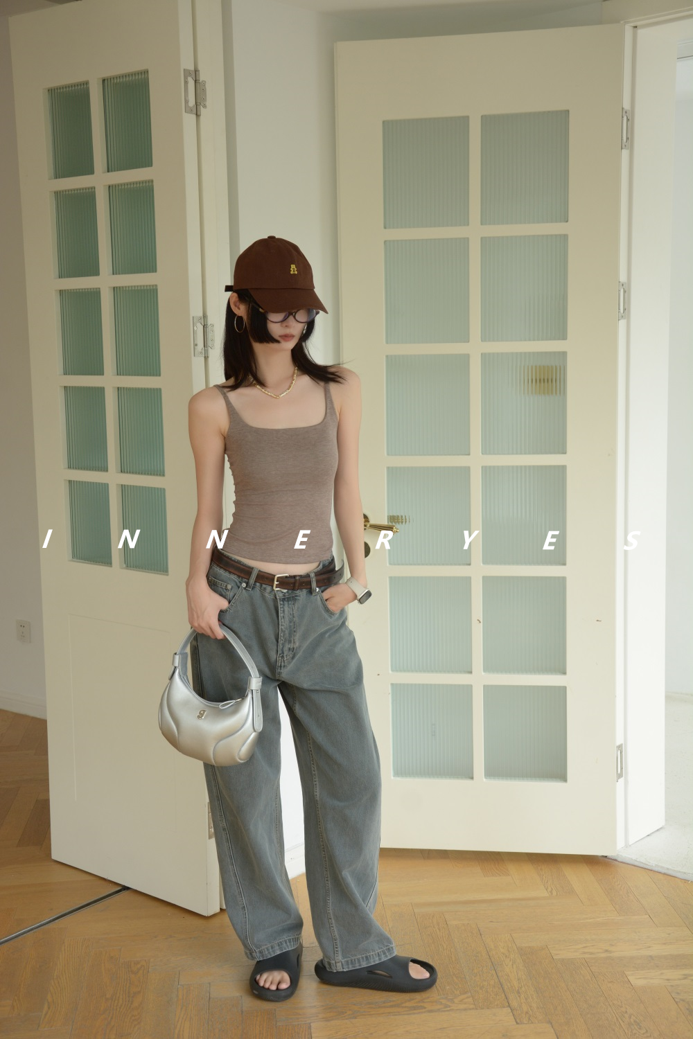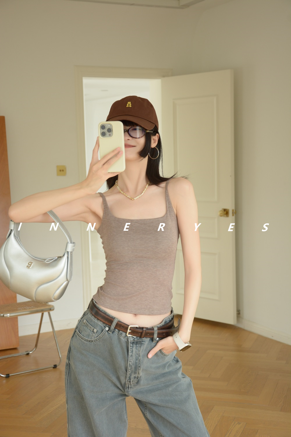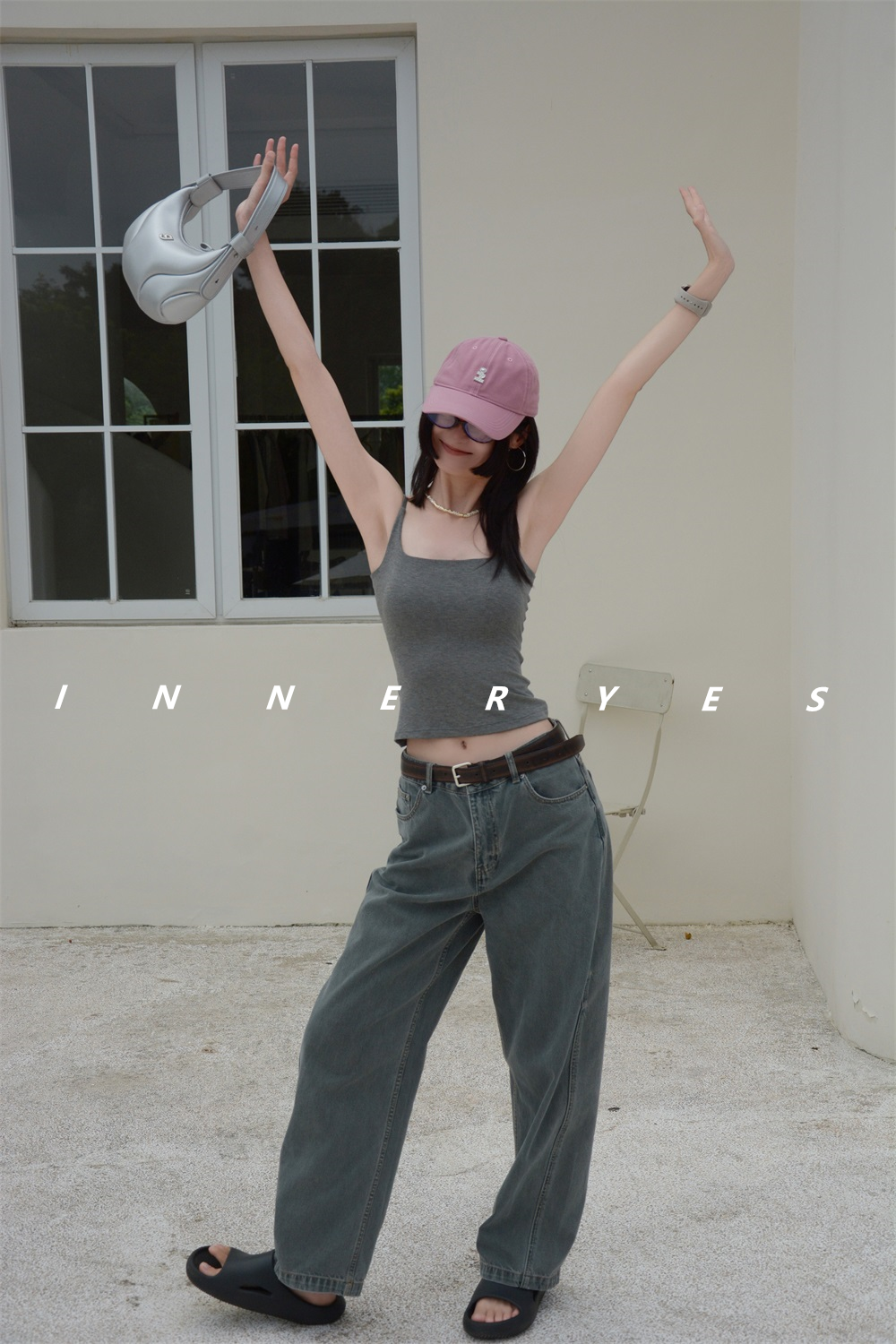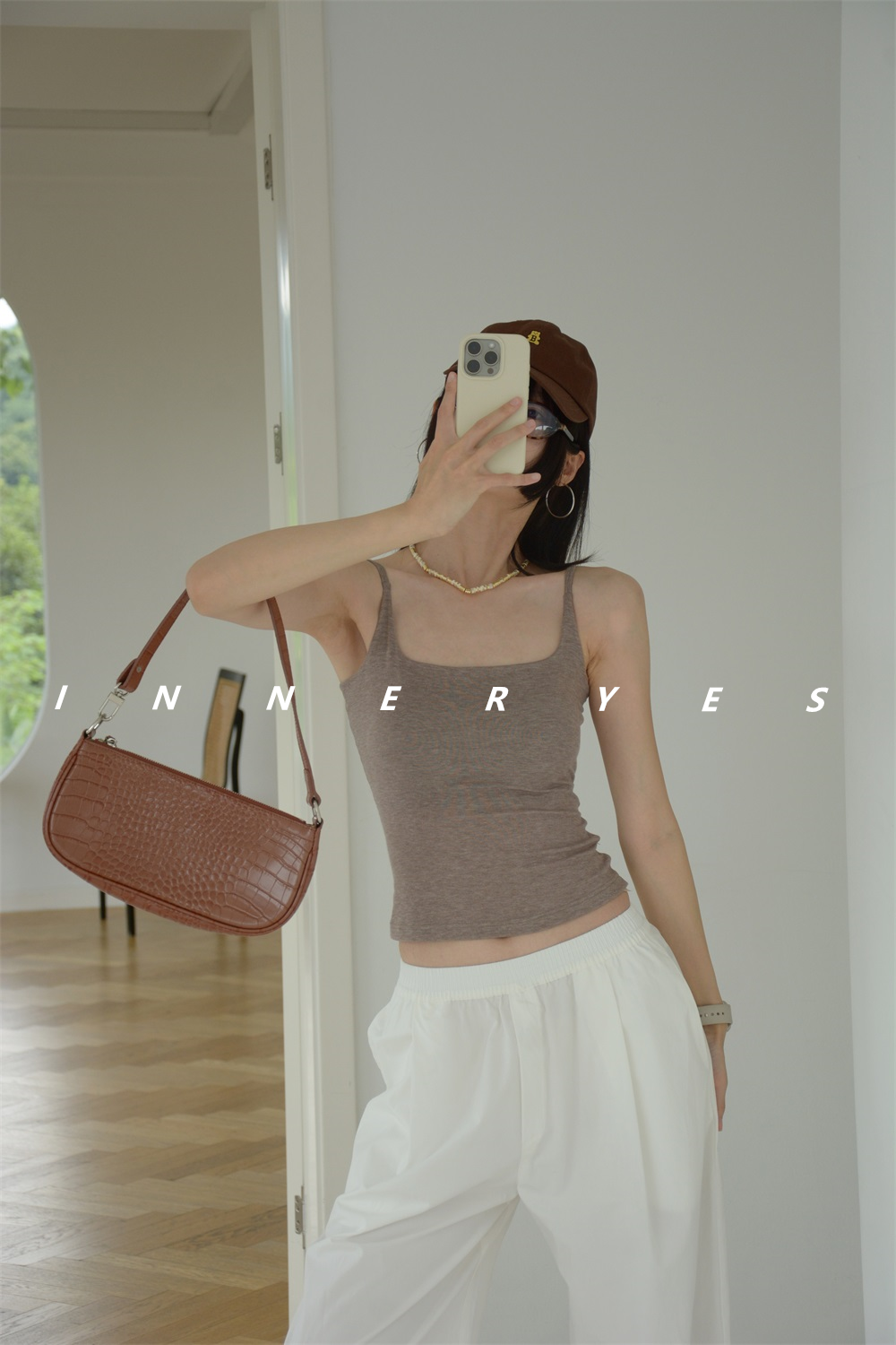 INNER YES梅子小方亞麻帶胸墊吊帶背心女內搭外穿灰色黑色上衣