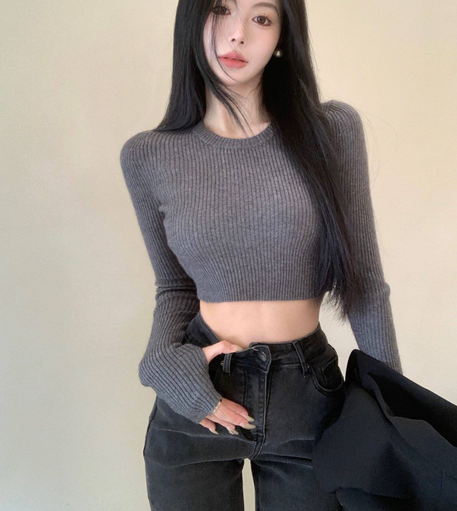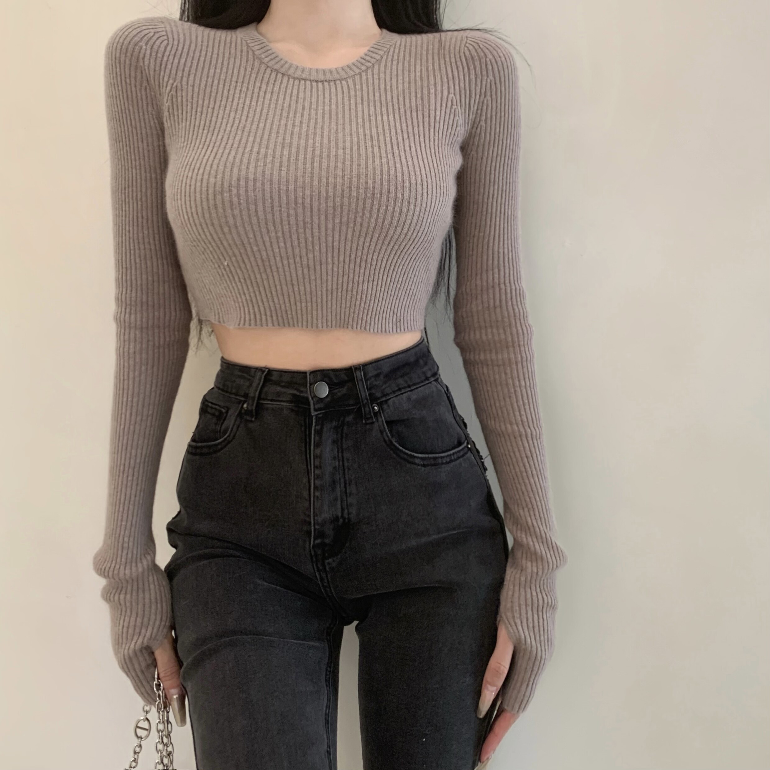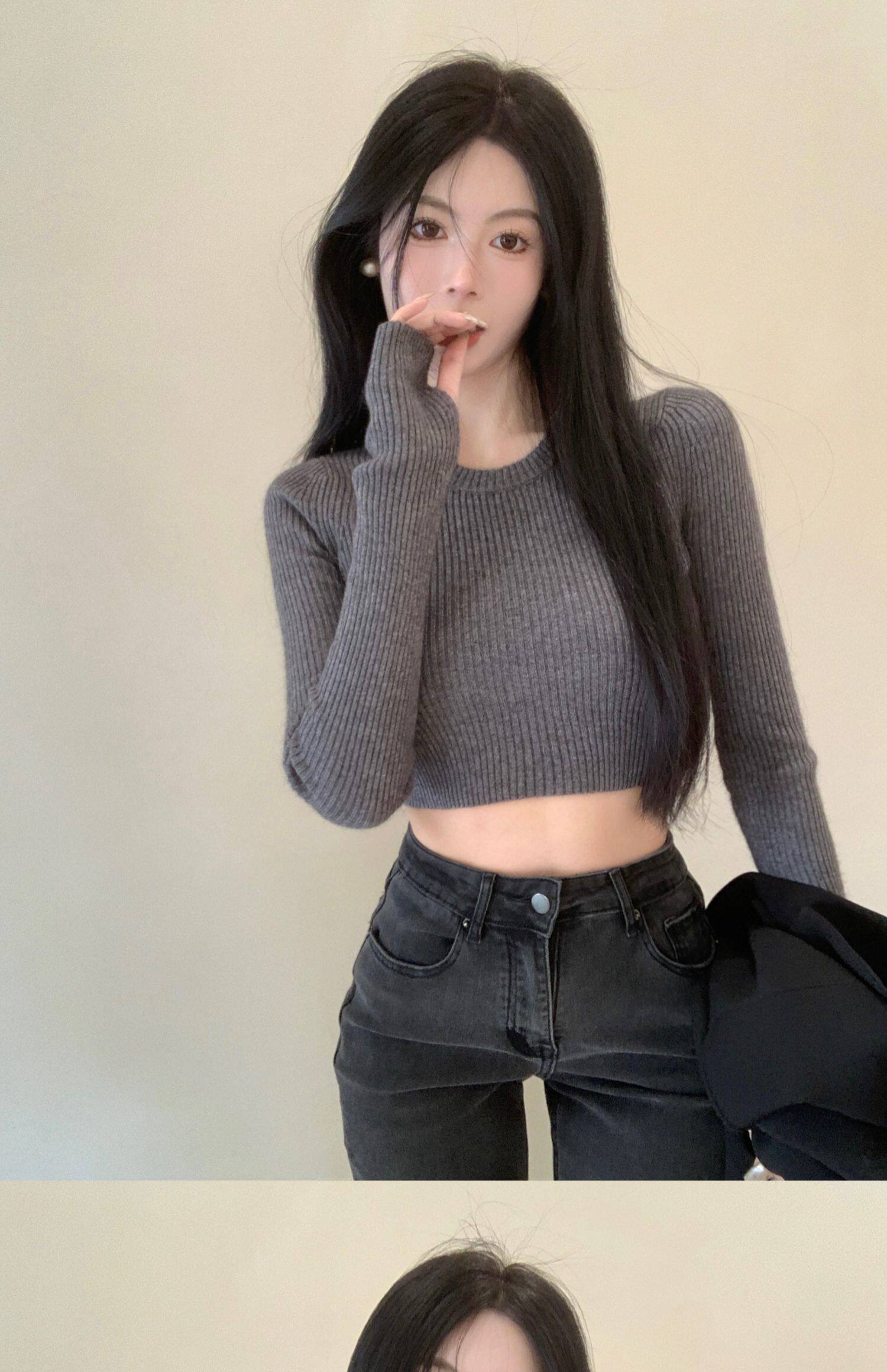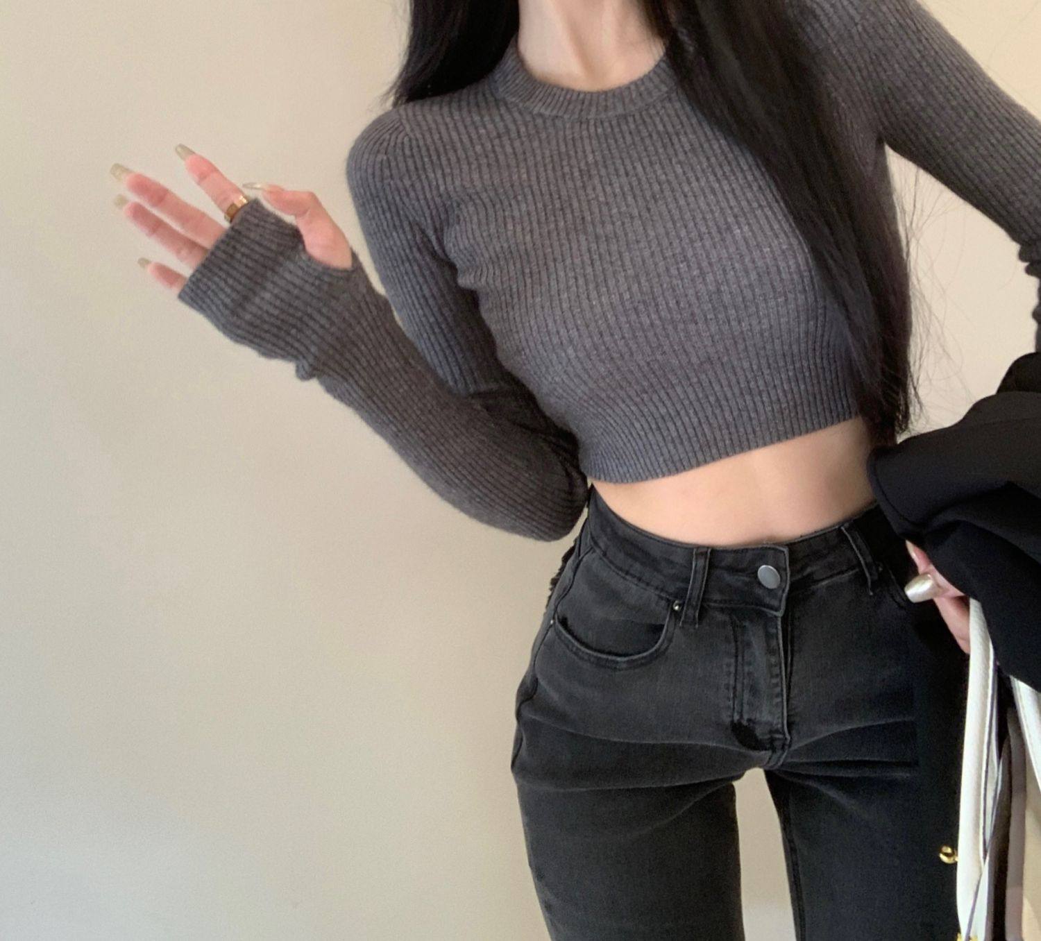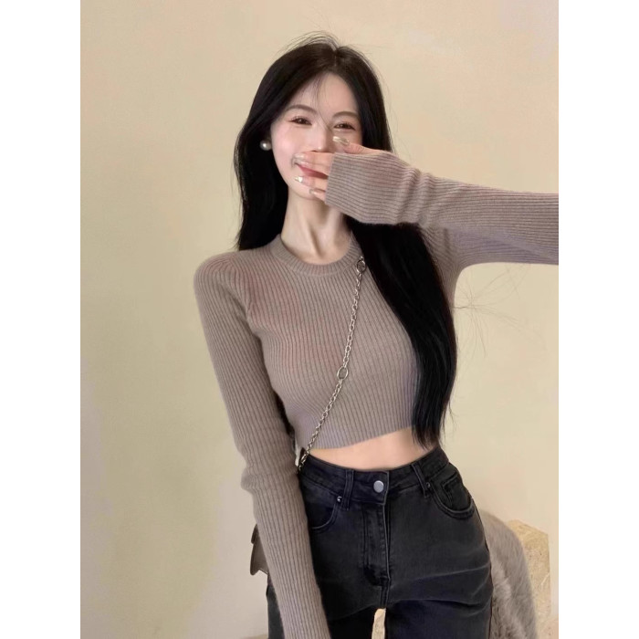 灰色長袖針織衫女2025春秋內搭修身短款露臍洋氣緊身打底衫上衣潮