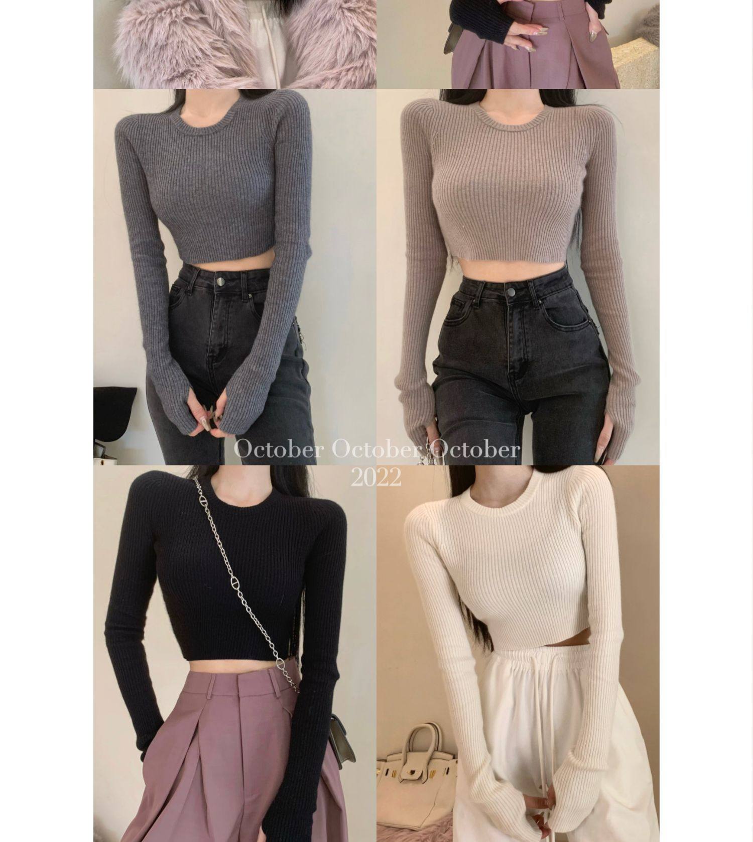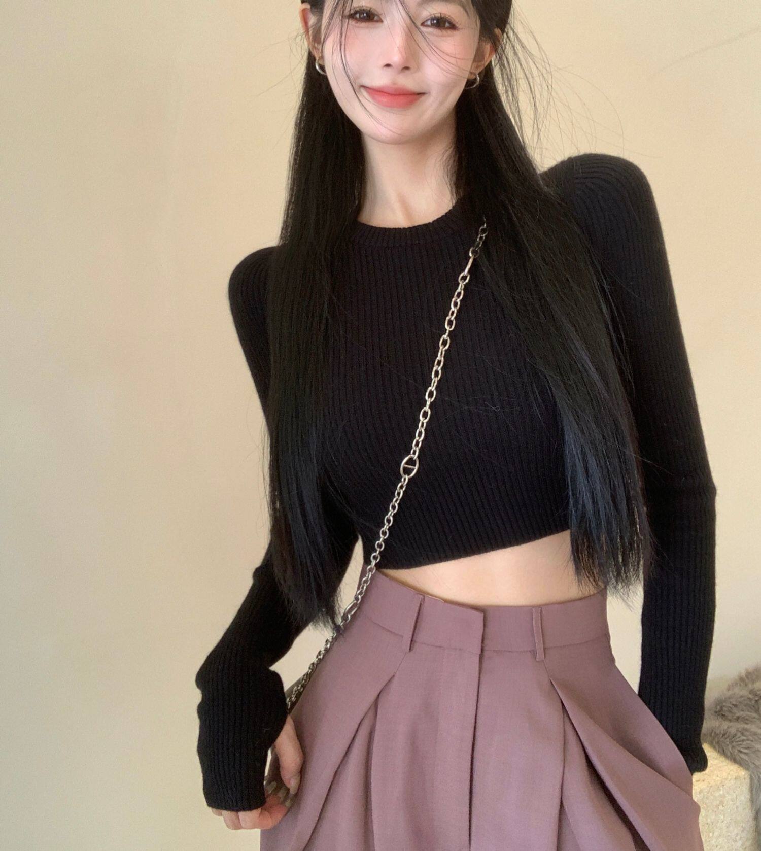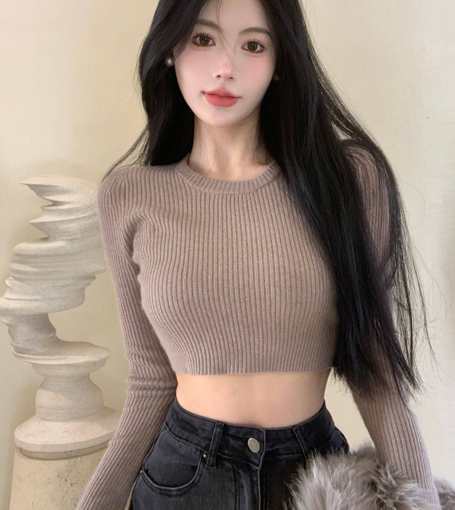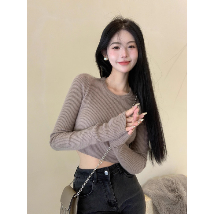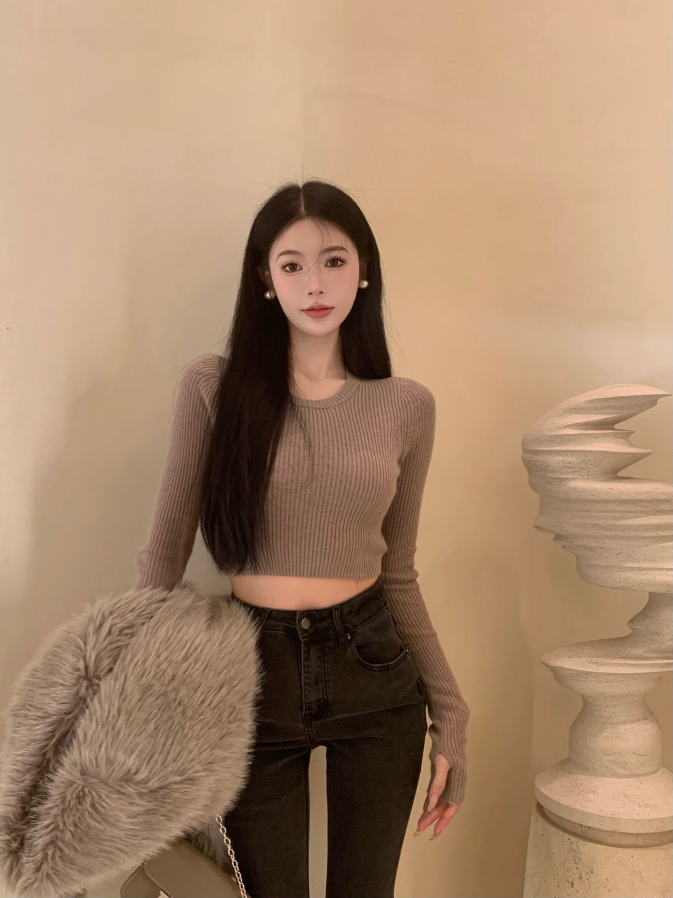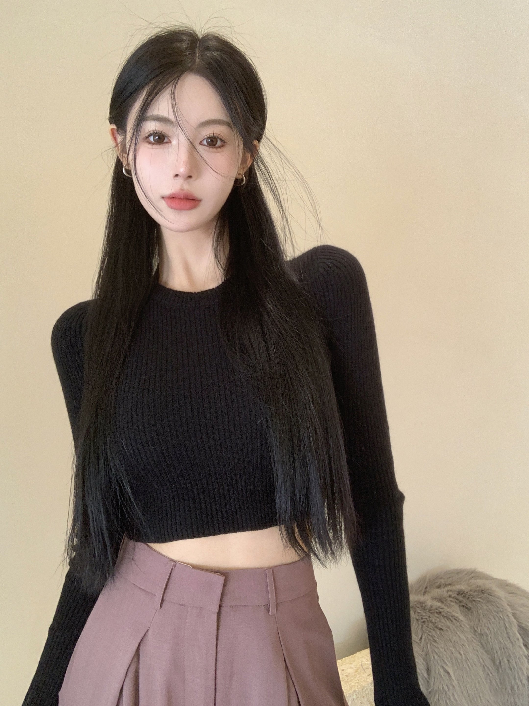 灰色長袖針織衫女2025春秋內搭修身短款露臍洋氣緊身打底衫上衣潮