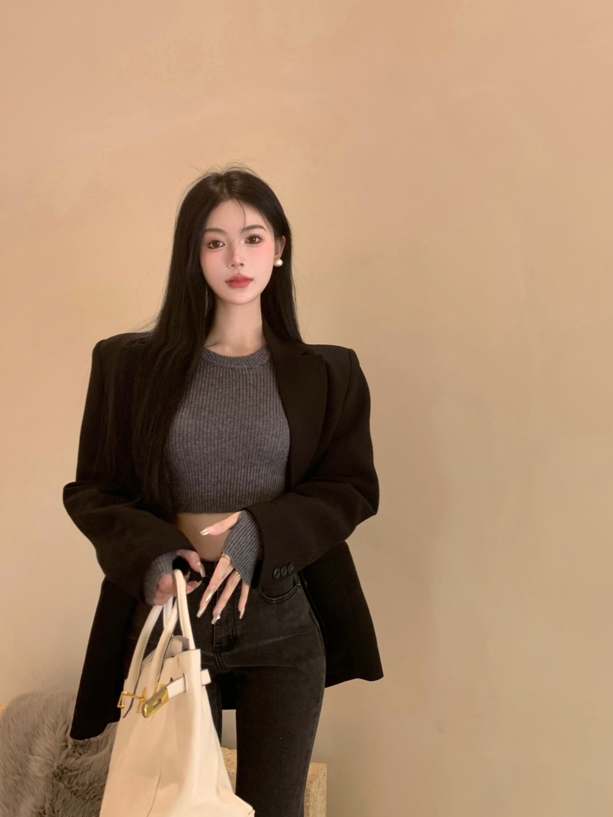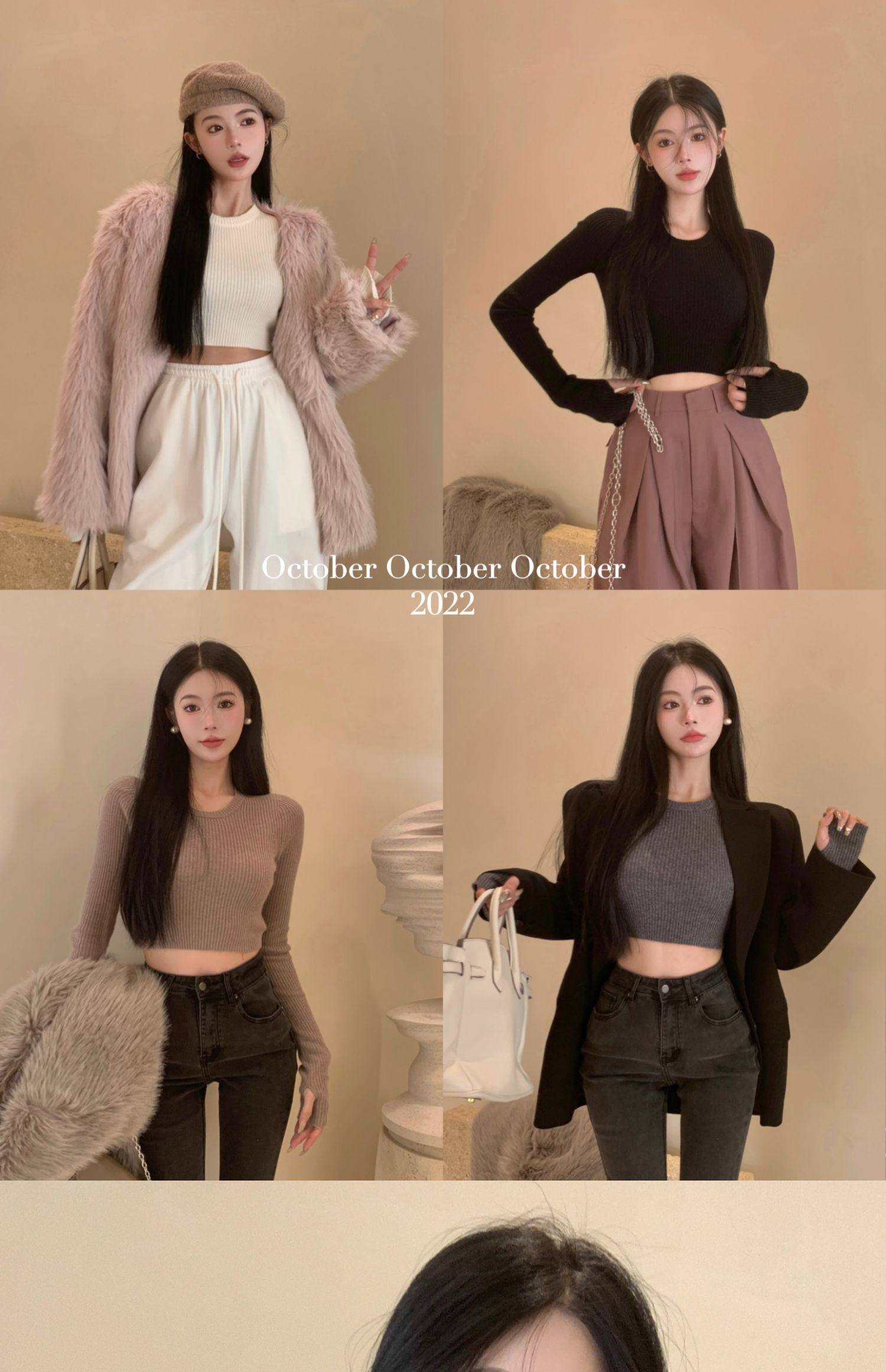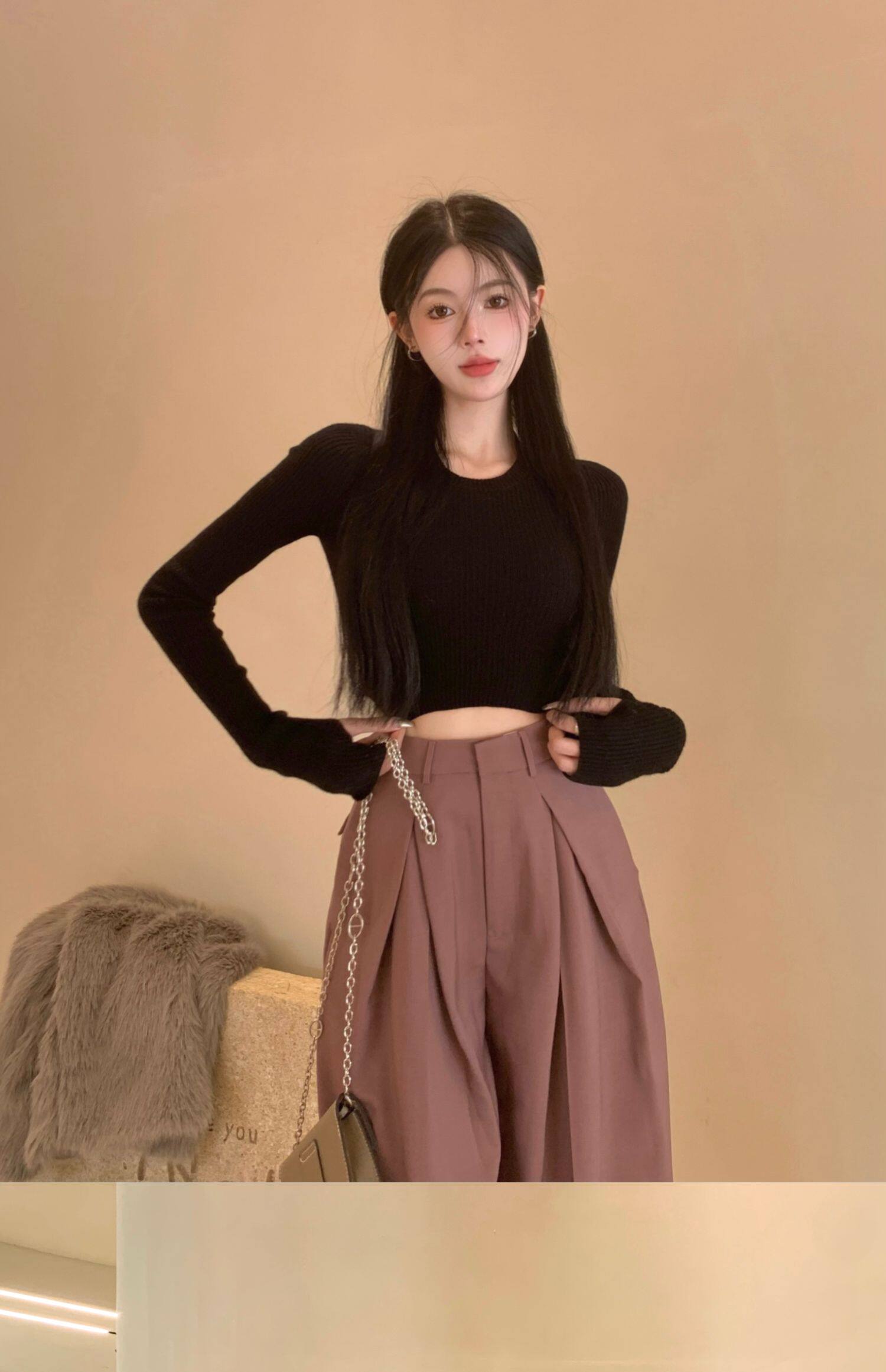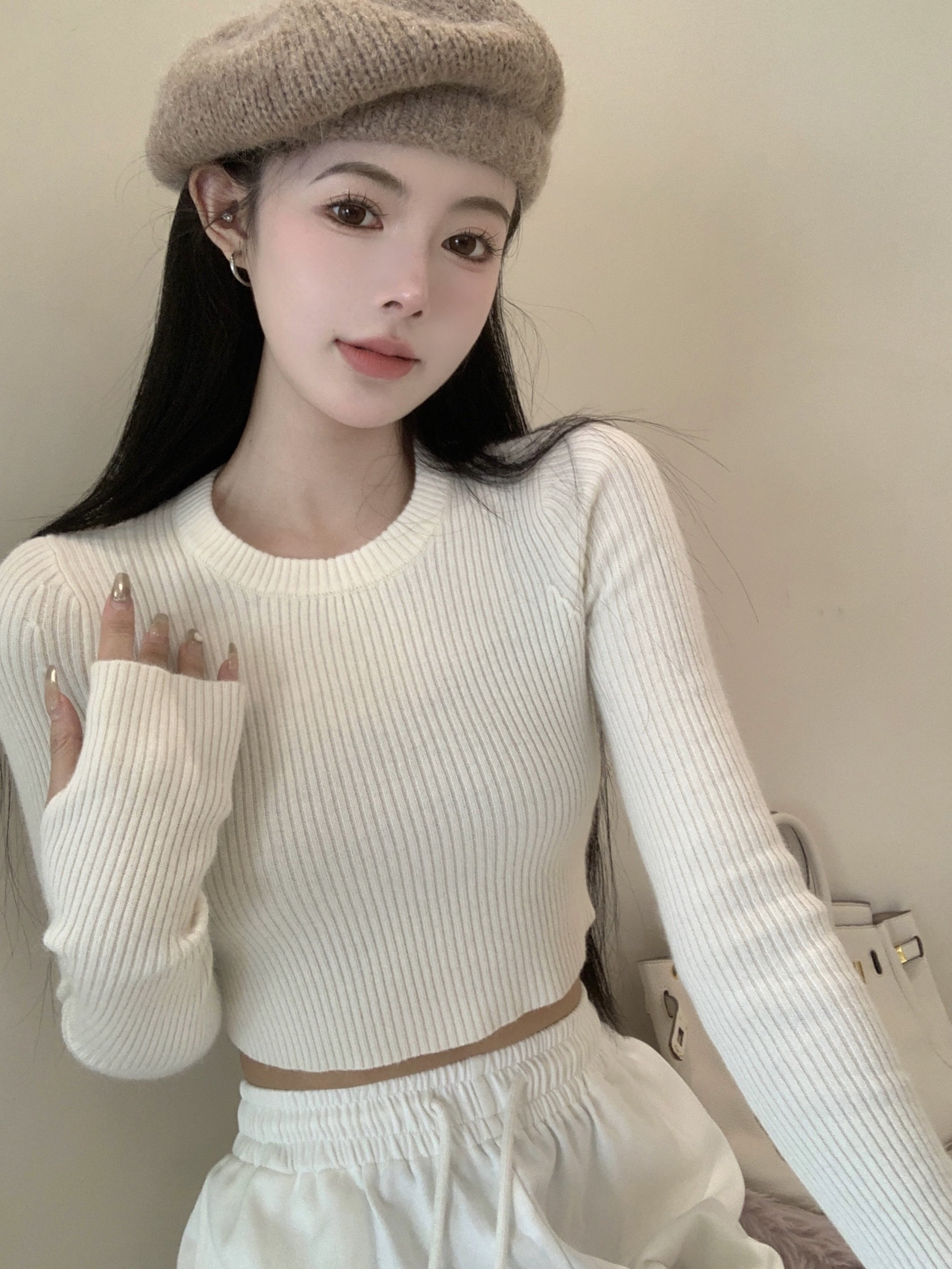 灰色長袖針織衫女2025春秋內搭修身短款露臍洋氣緊身打底衫上衣潮